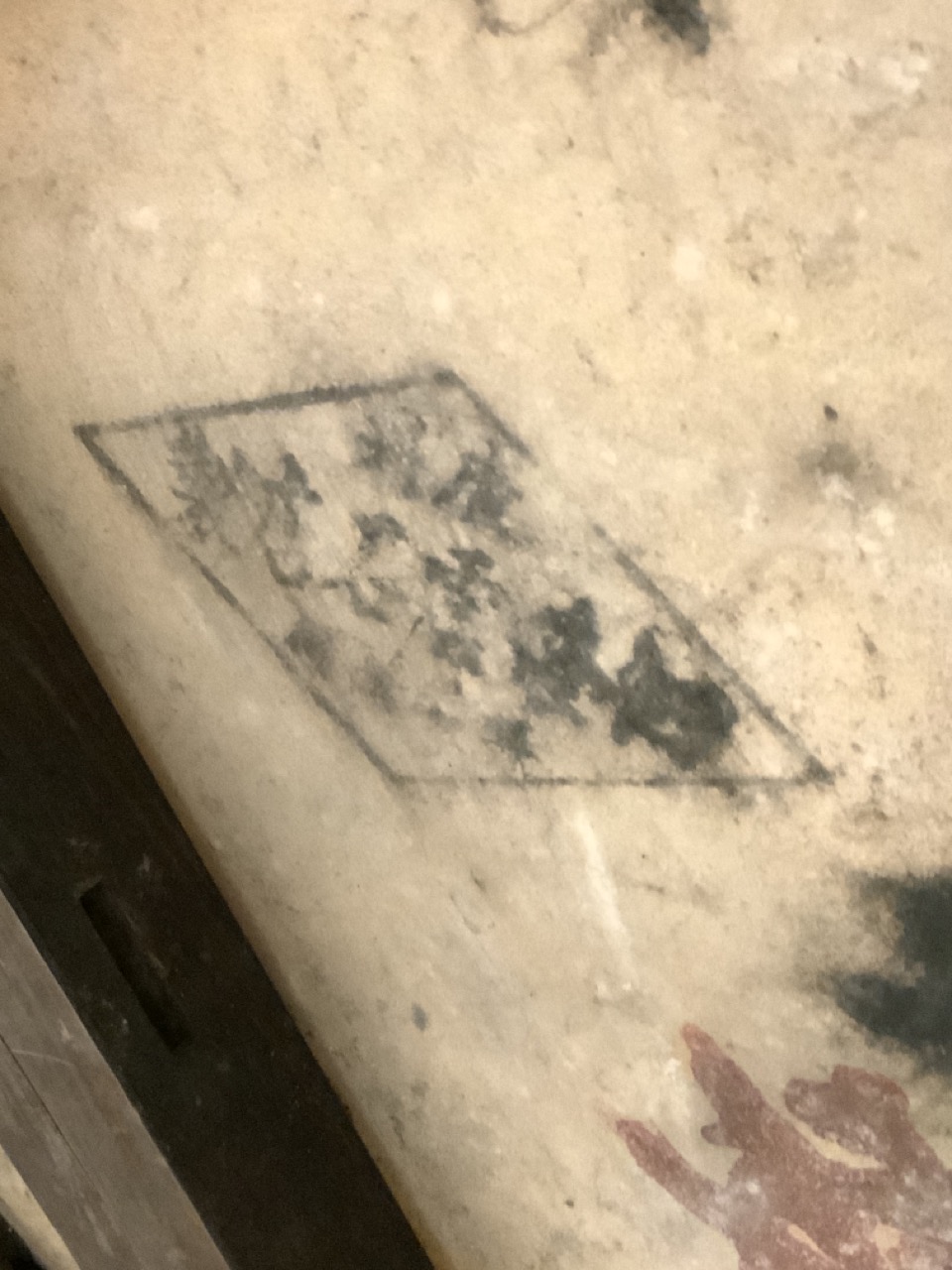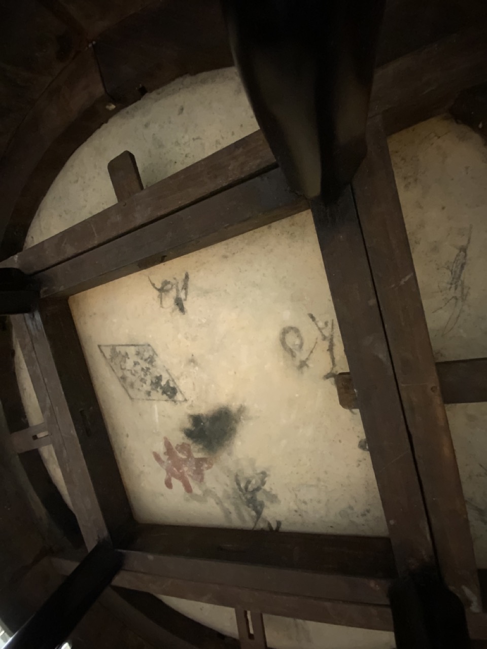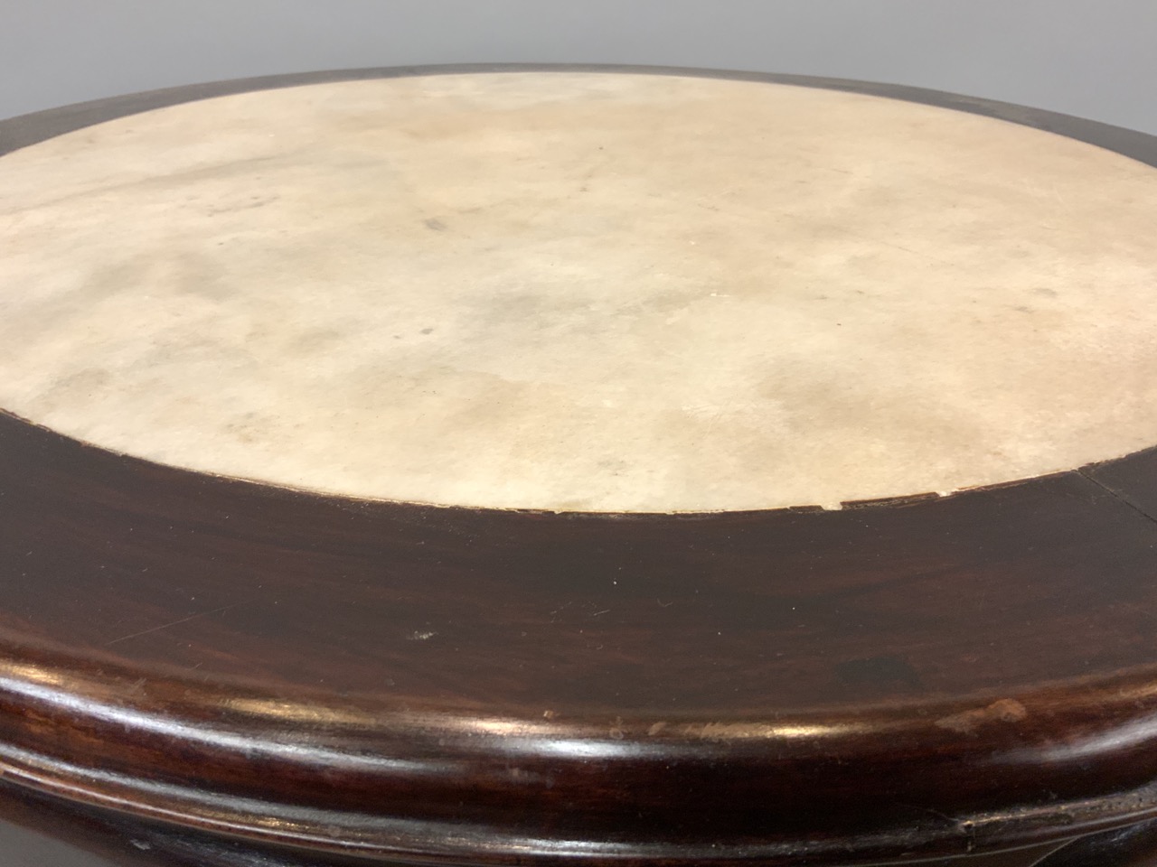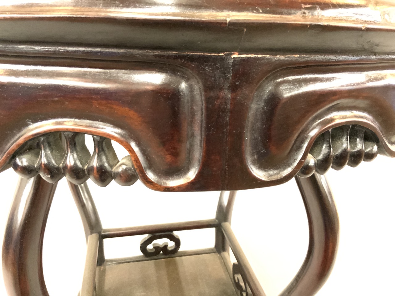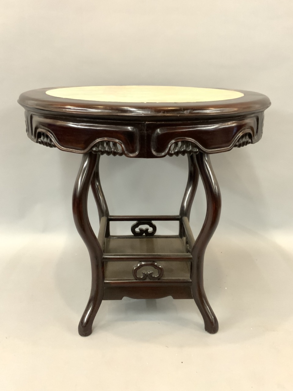 A late 19th or early 20th century Chinese hardwood Round marble top Table. Signed underneath marble All wood fastening tabs to attach top and bottom of table intact. Very fine piece.