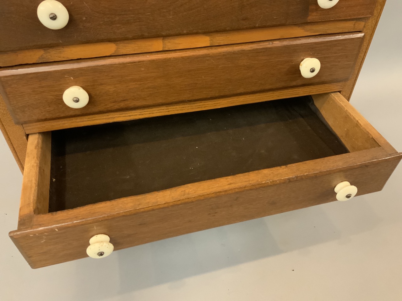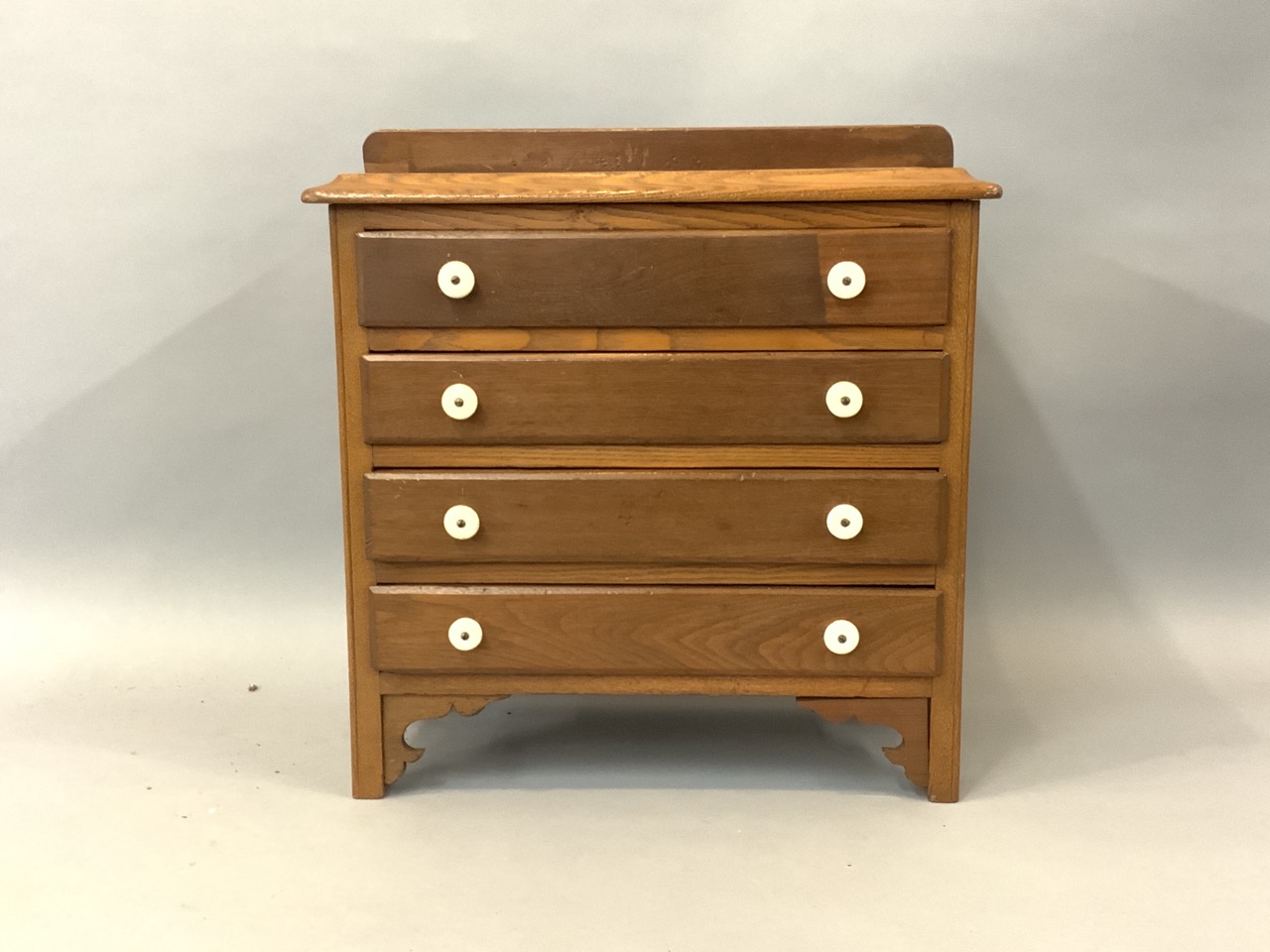 Four (4) drawer miniature child size chest of drawers. Previously used to house flatware.