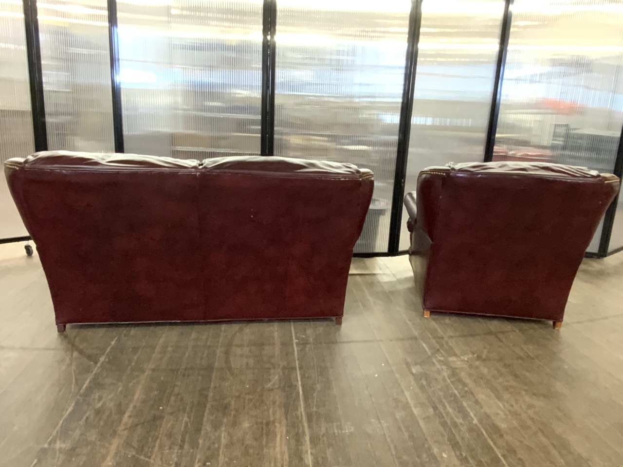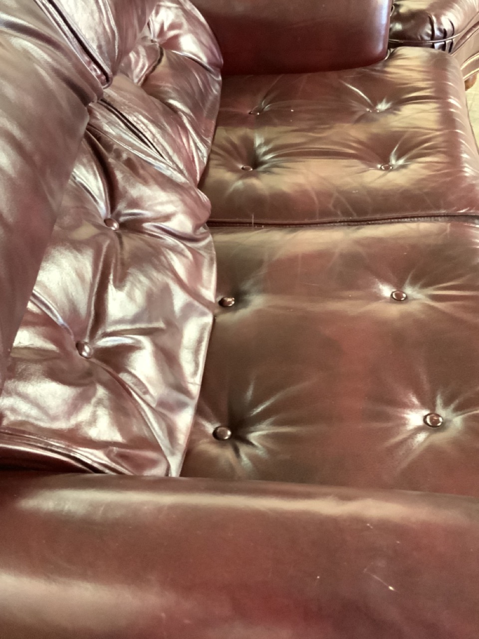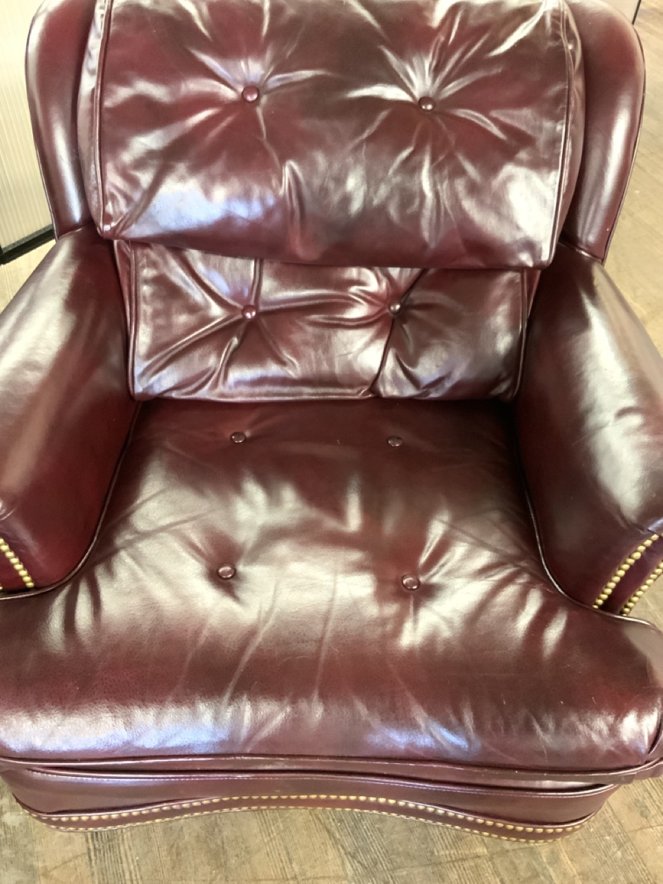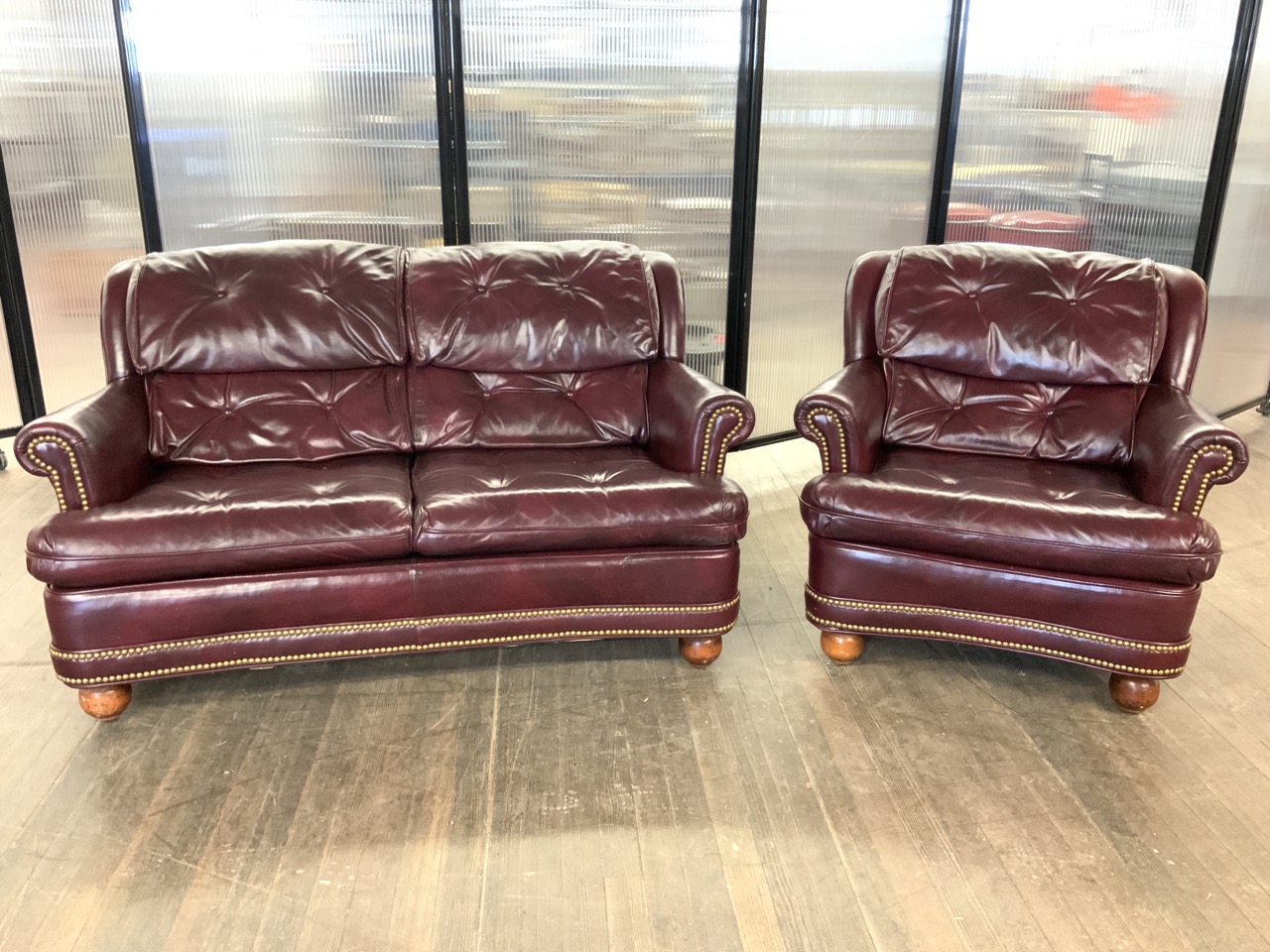 Two (2) Cognac Red Tufted back and studded faux leather sofa and chair set on wood bun feet.