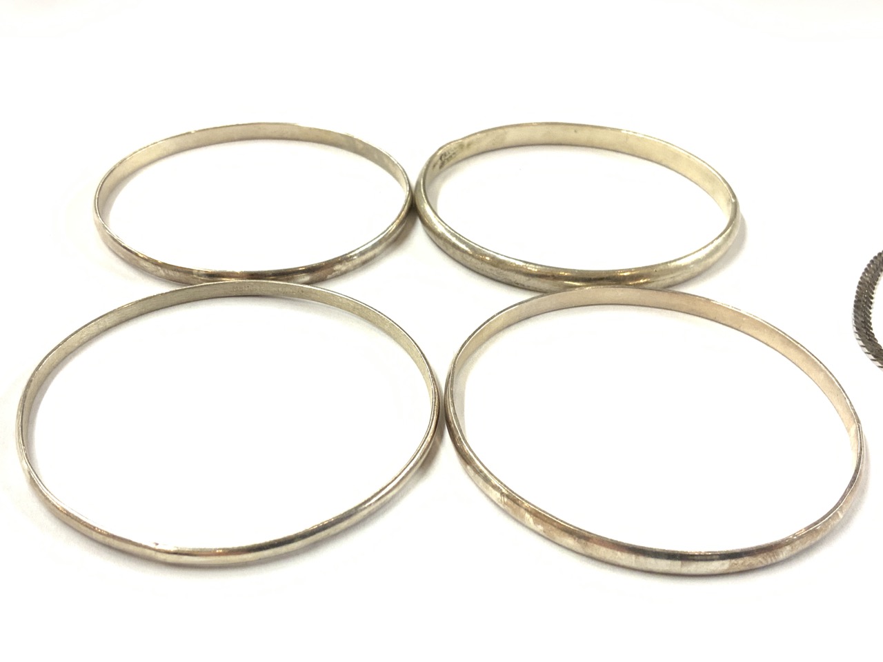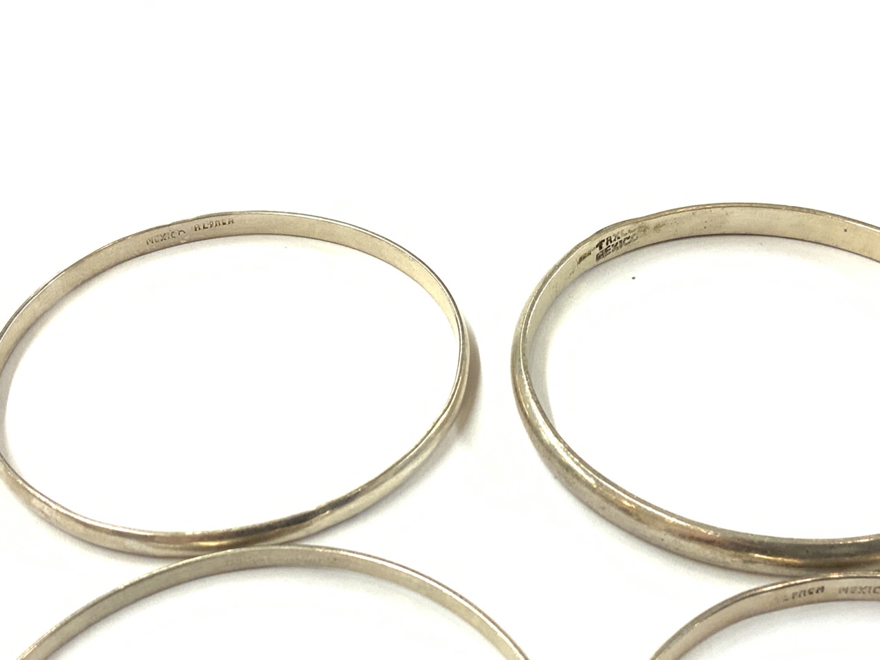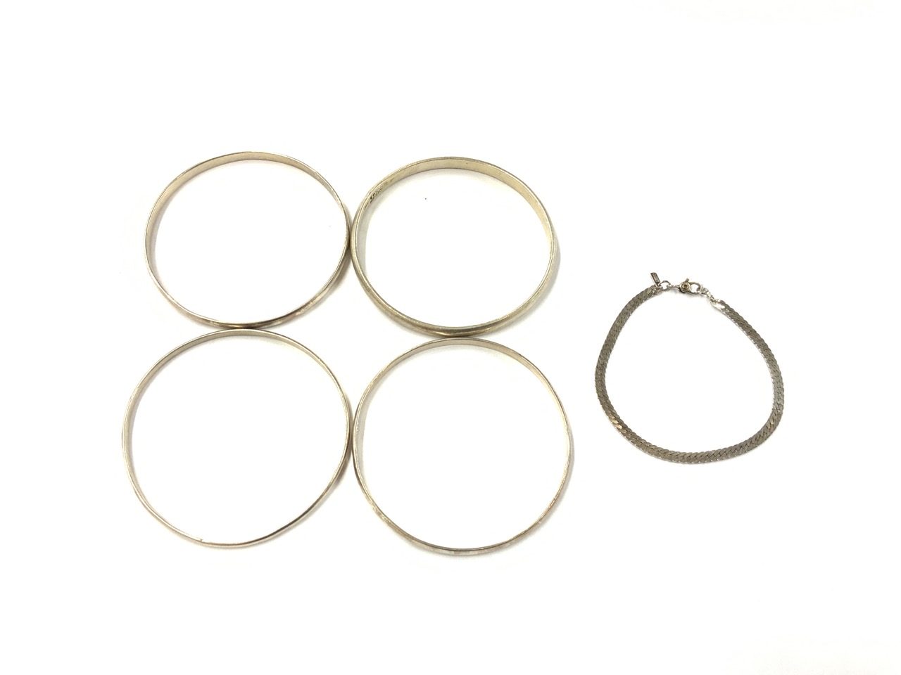 Five (5) assorted bangle bracelets. Most sterling silver.
