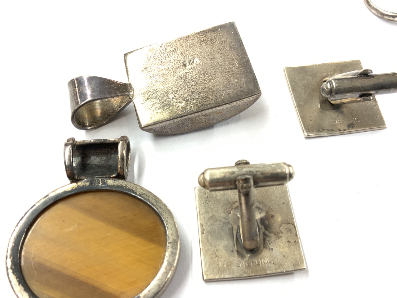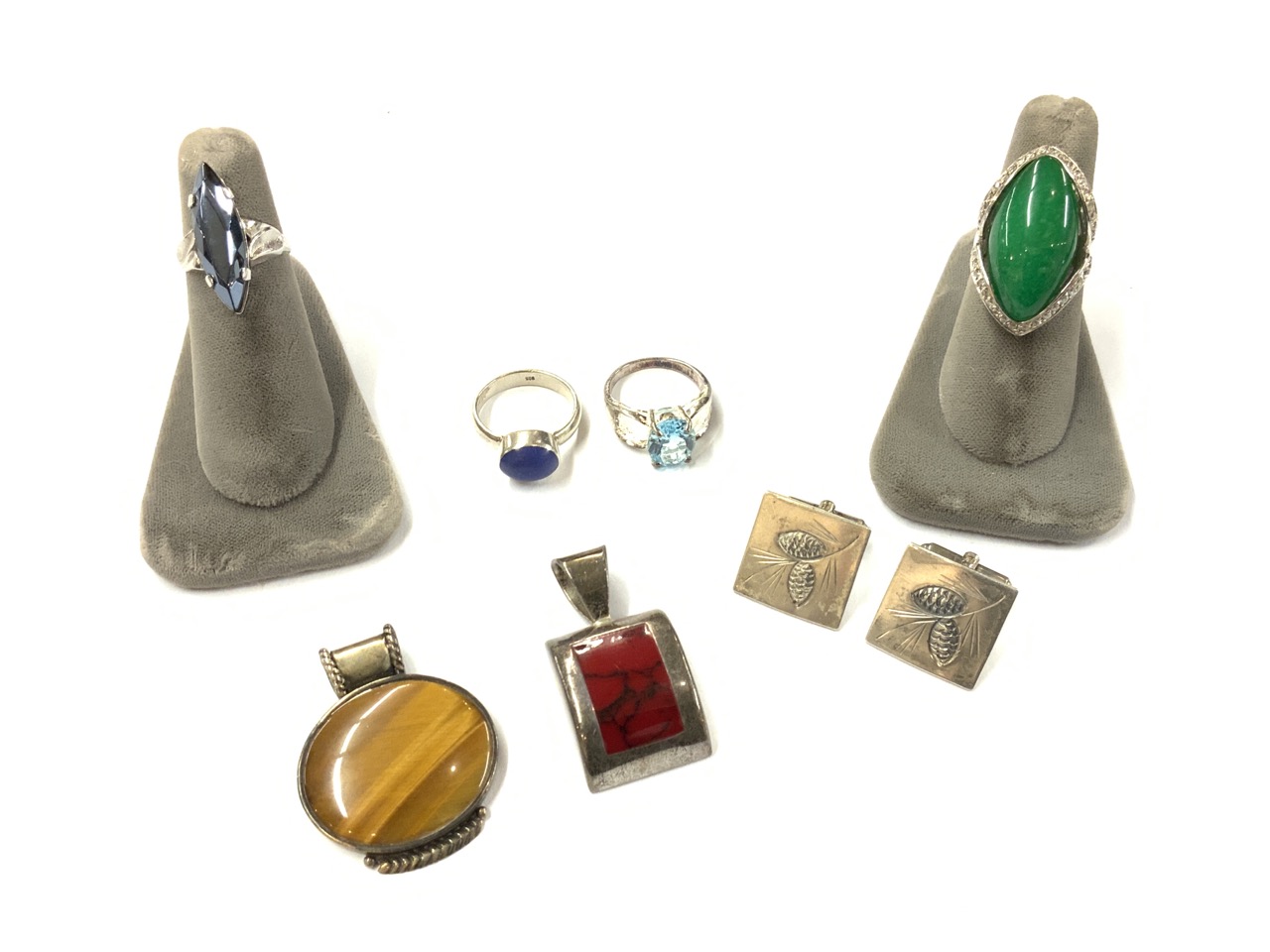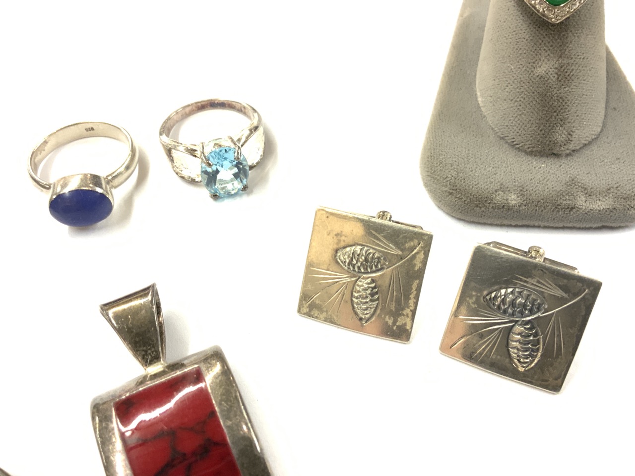 A compiled lot of sterling silver rings and pendants. As seen in photograph preview.