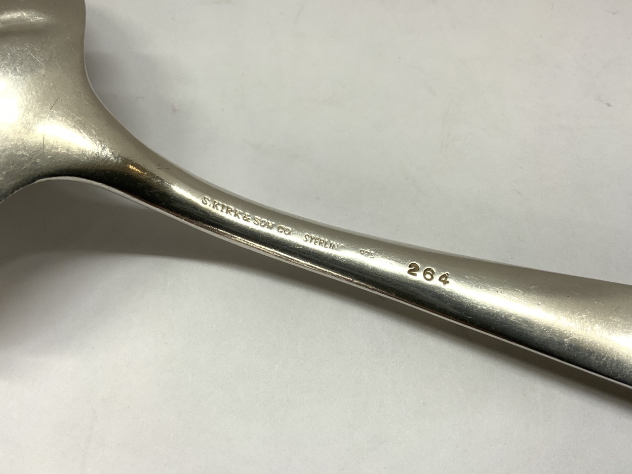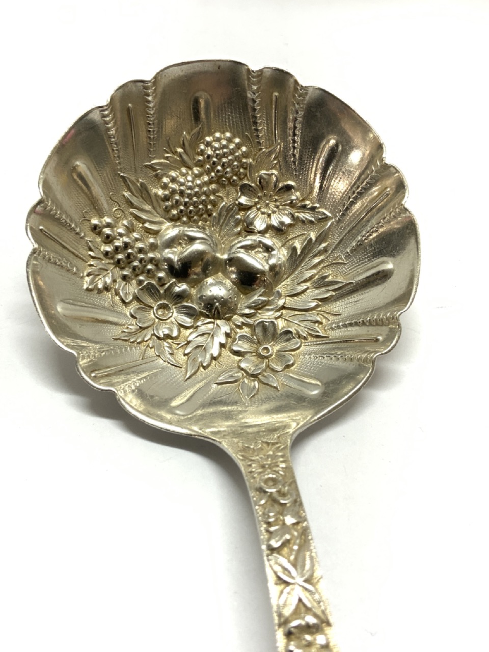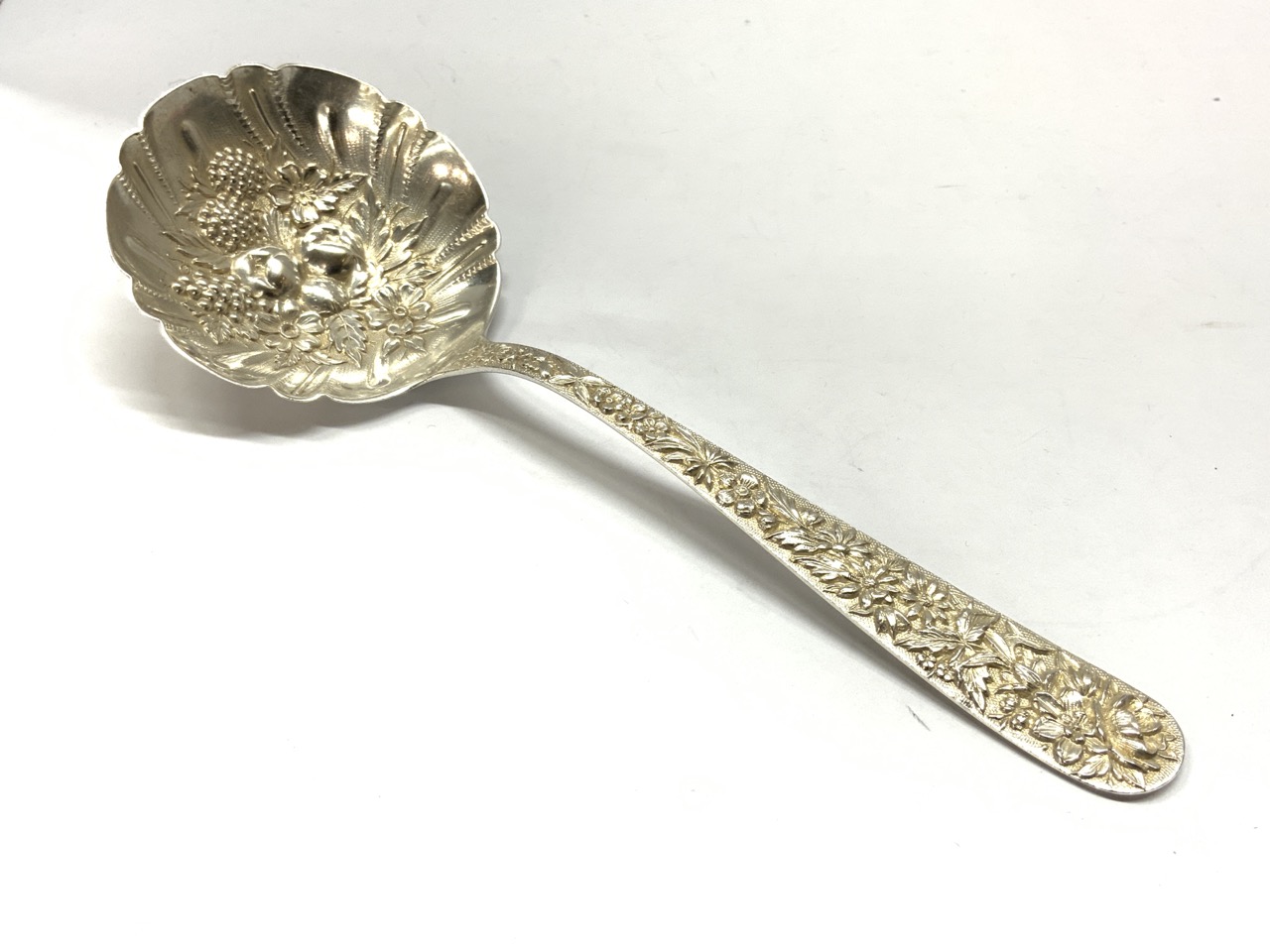 A fine S. Kirk & Sons sterling silver heavy repousse serving spoon with fruits and flowers.