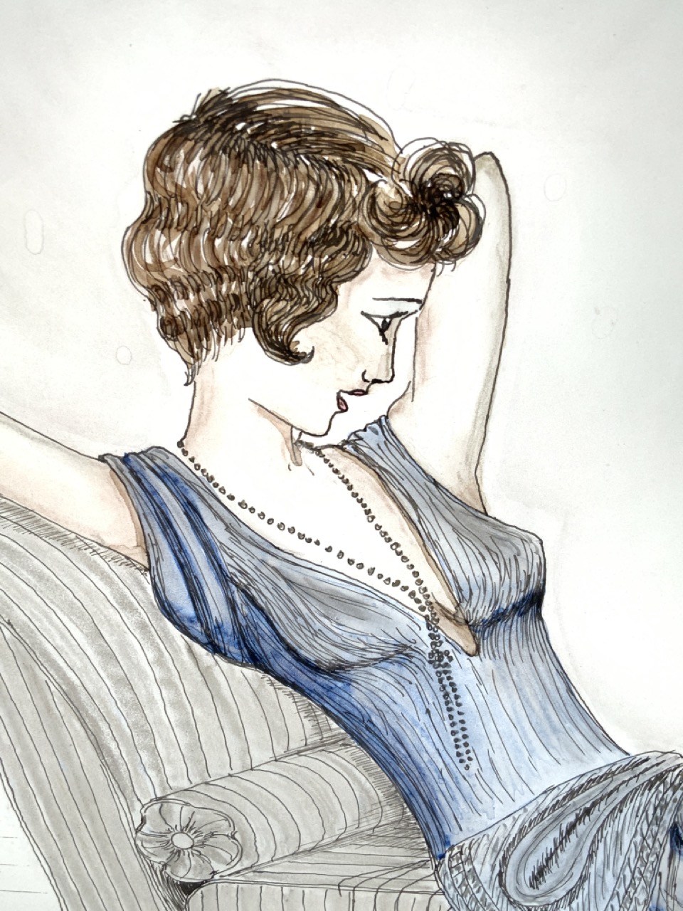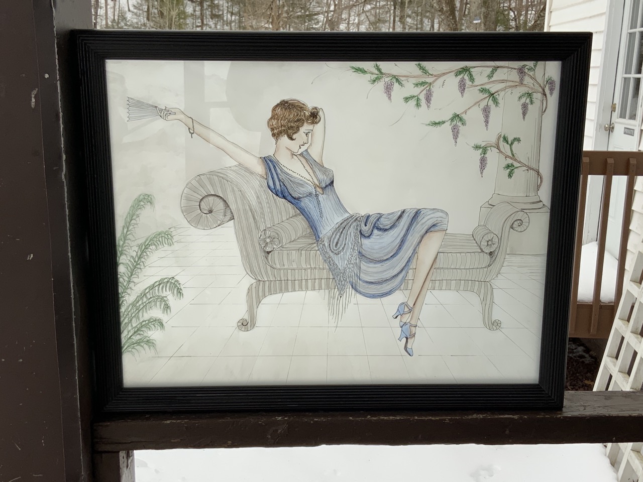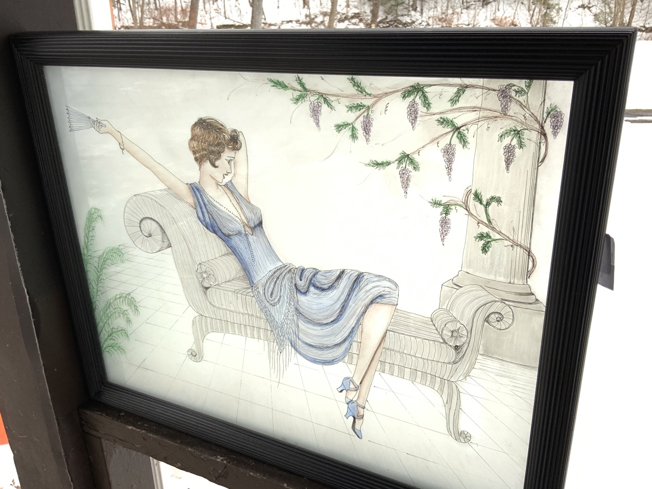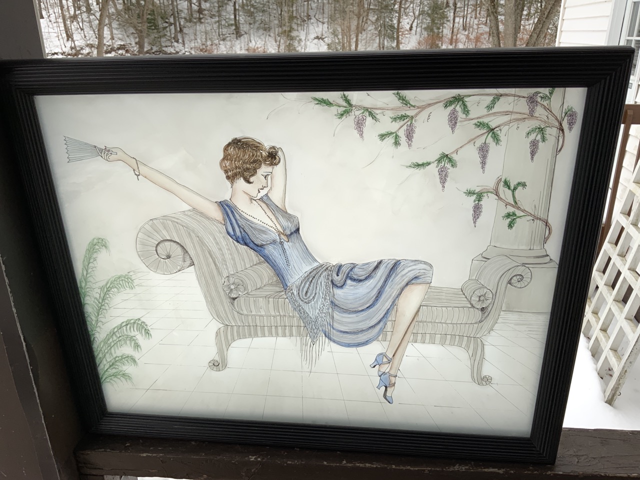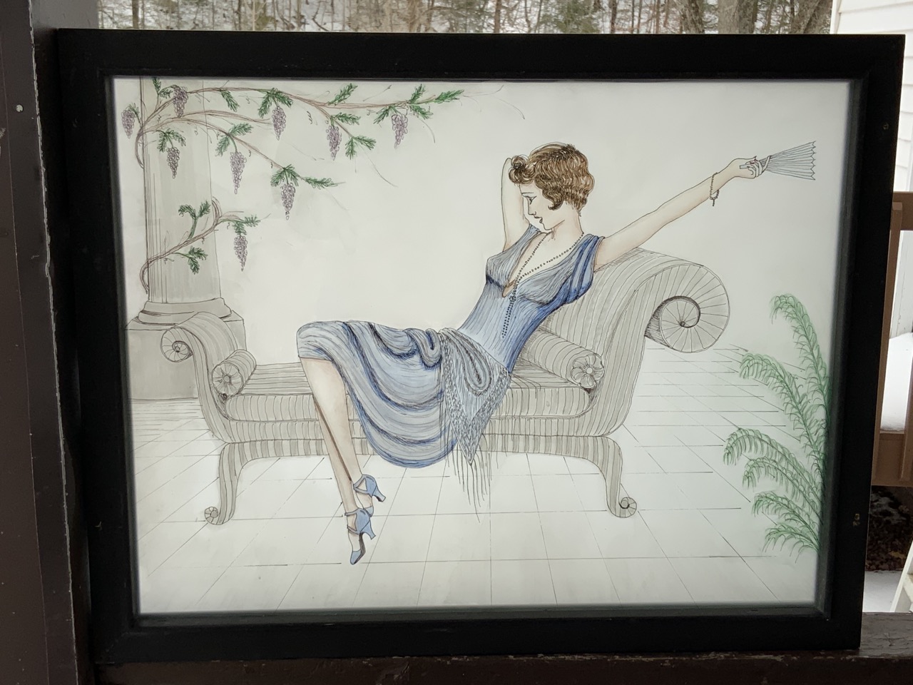 Reverse painted translucent design lady in lounge chair.