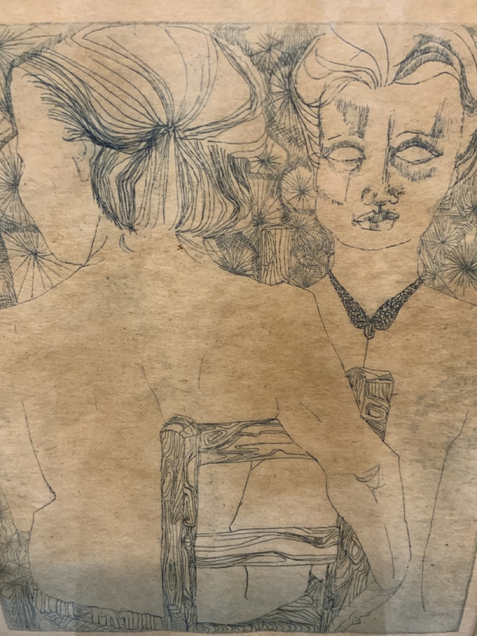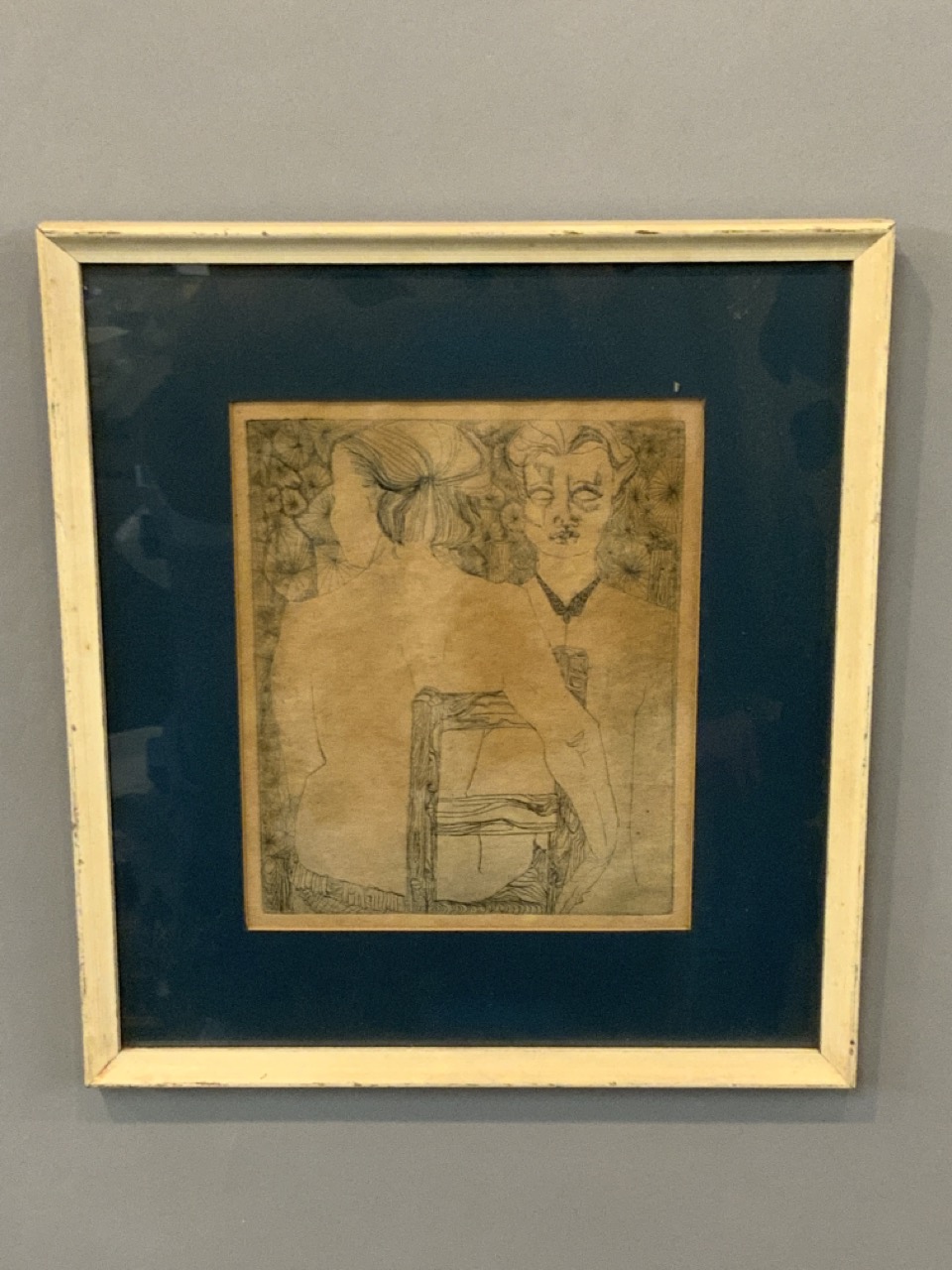 A stern older woman (mother) with young lady (daughter) seated with back to artist. Not removed or inspected outside of frame.