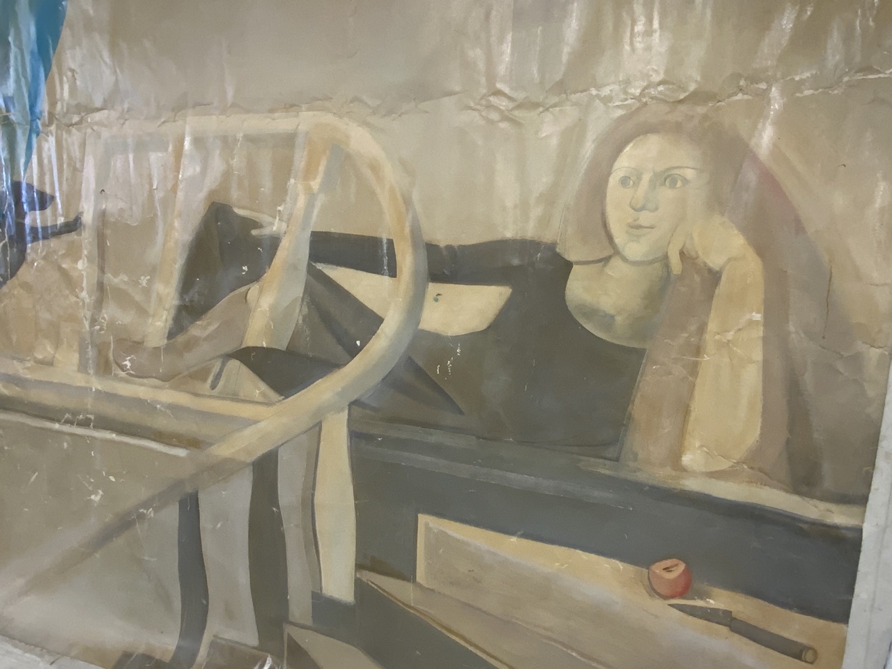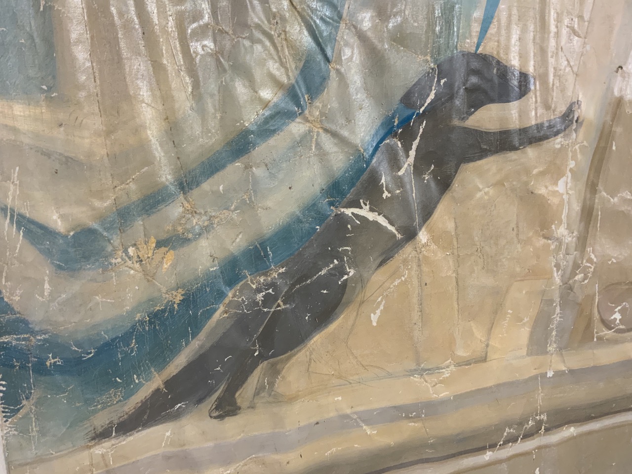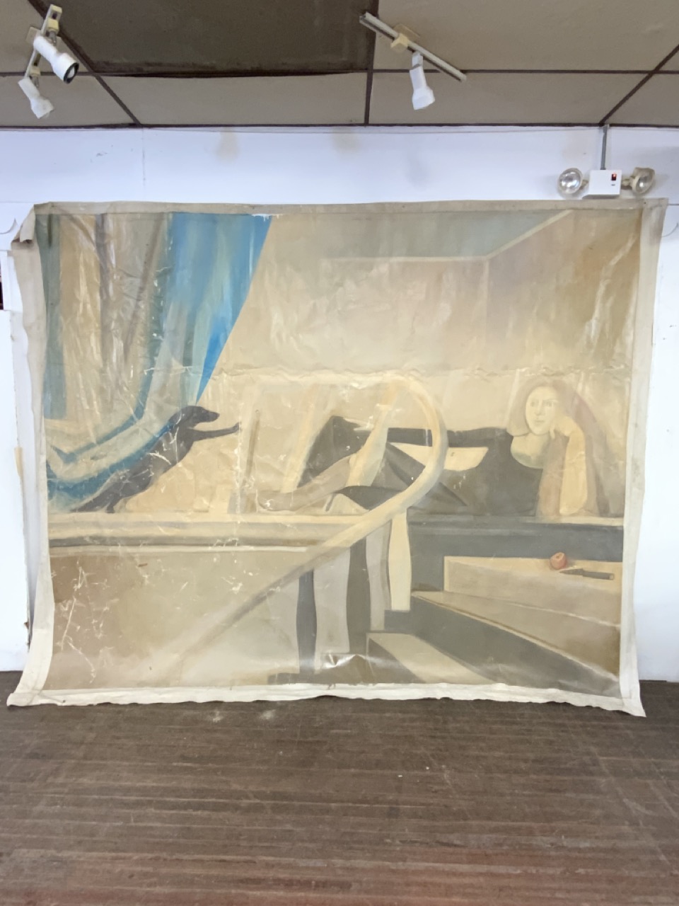 Probably 1970’s mural sized painting. A woman sitting at landing with dog watching her.