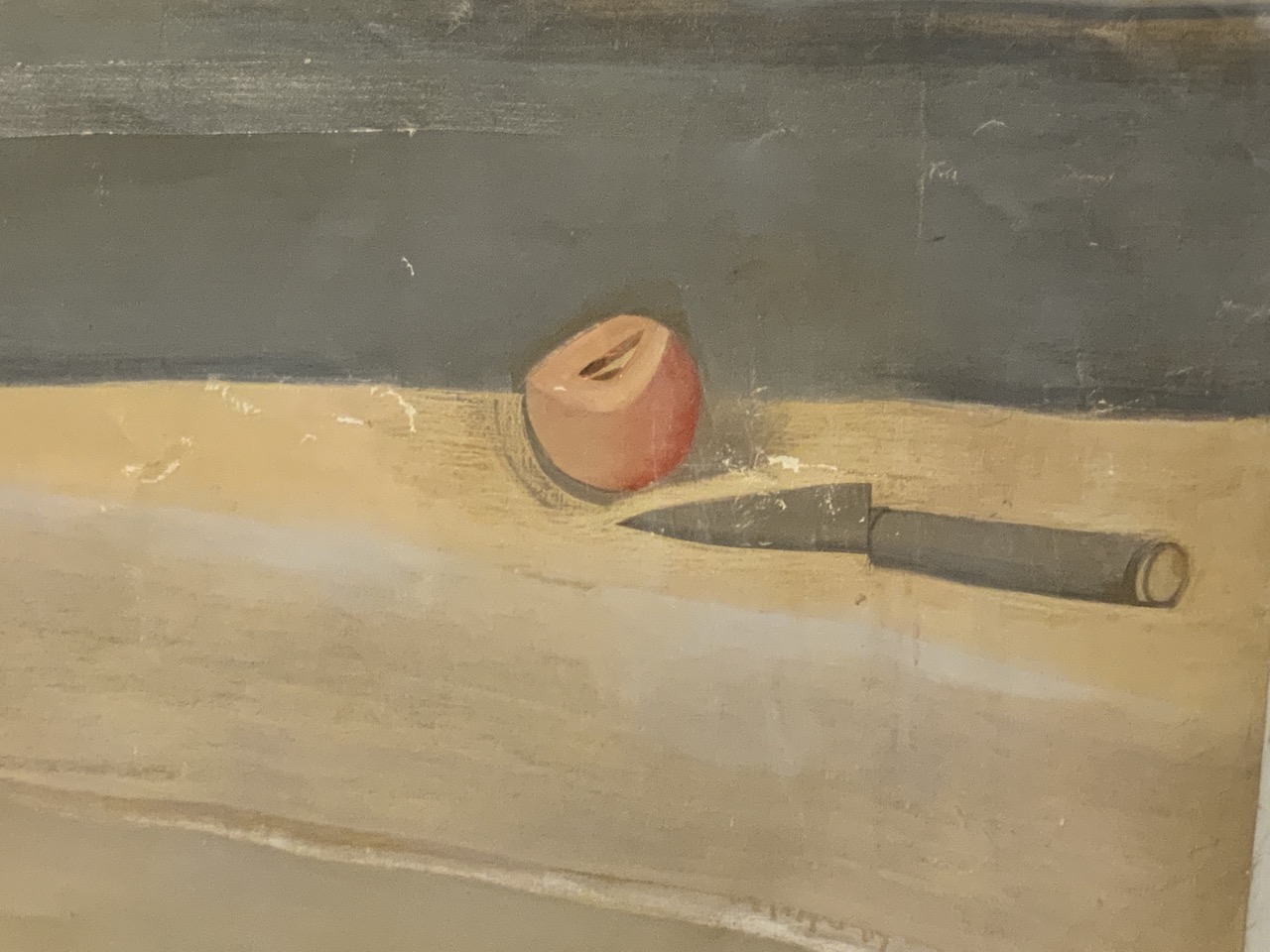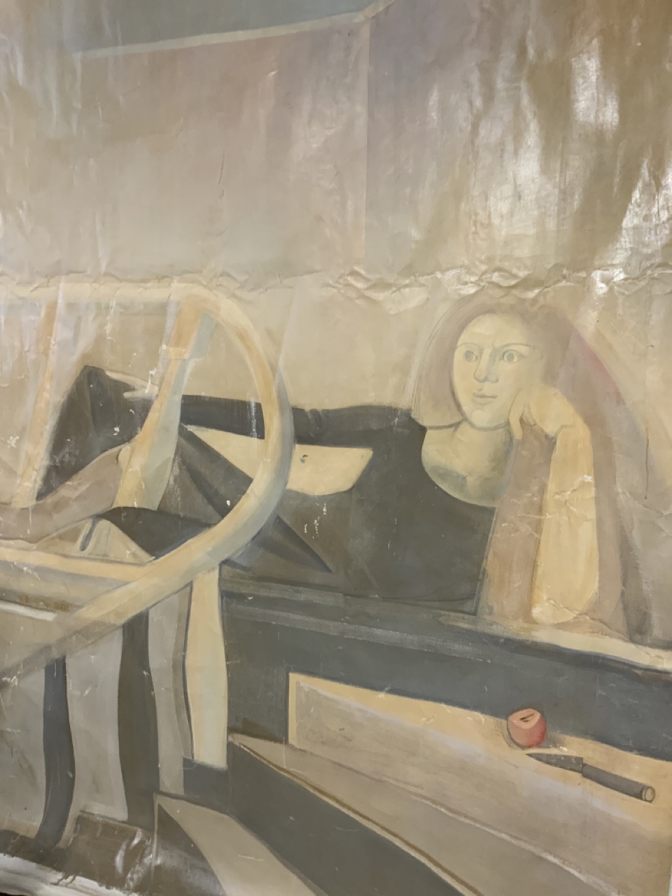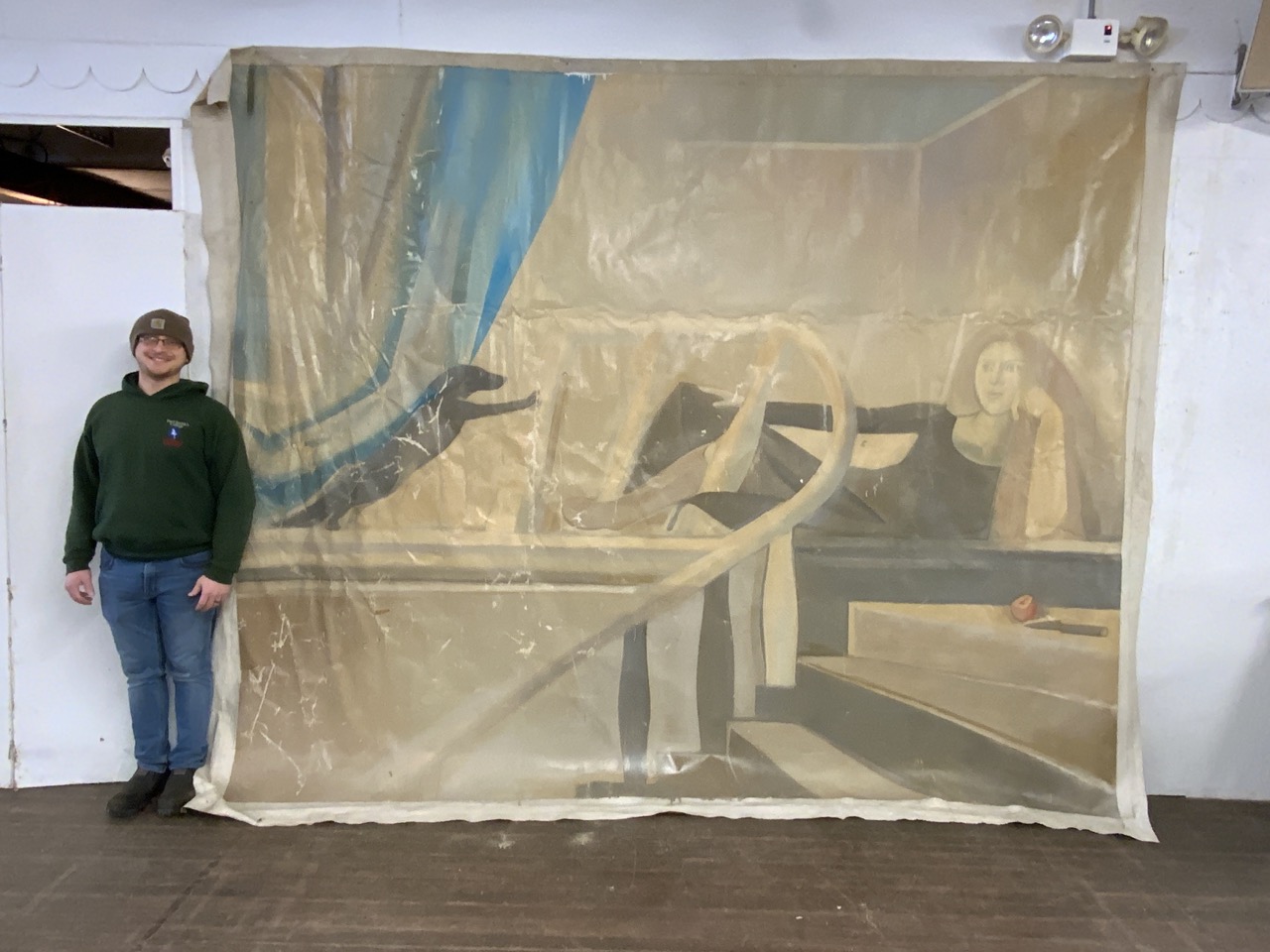 Probably 1970’s mural sized painting. A woman sitting at landing with dog watching her.
