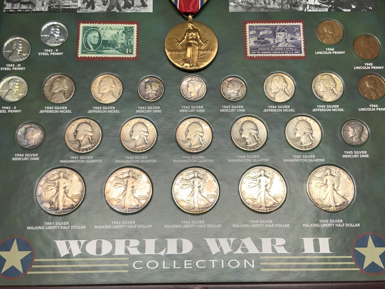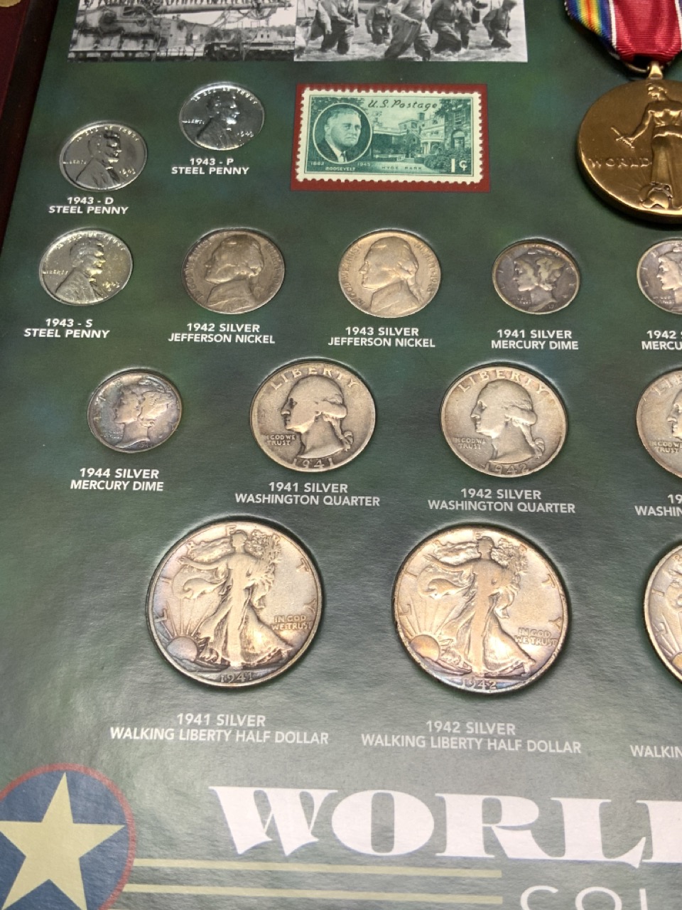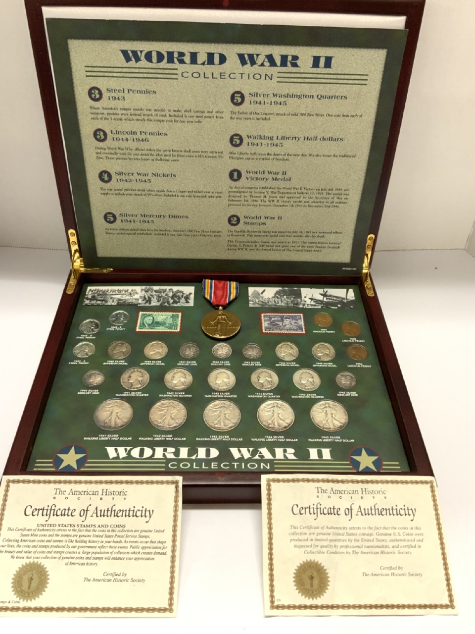 The World War II Coin Collection comprised by The American Historic Society. A nice collection with bronze medal, stamps, and currency of the era. Original coins including the steel penny, Mercury dime, Walking Liberty, Washington quarters and Jefferson nickels.