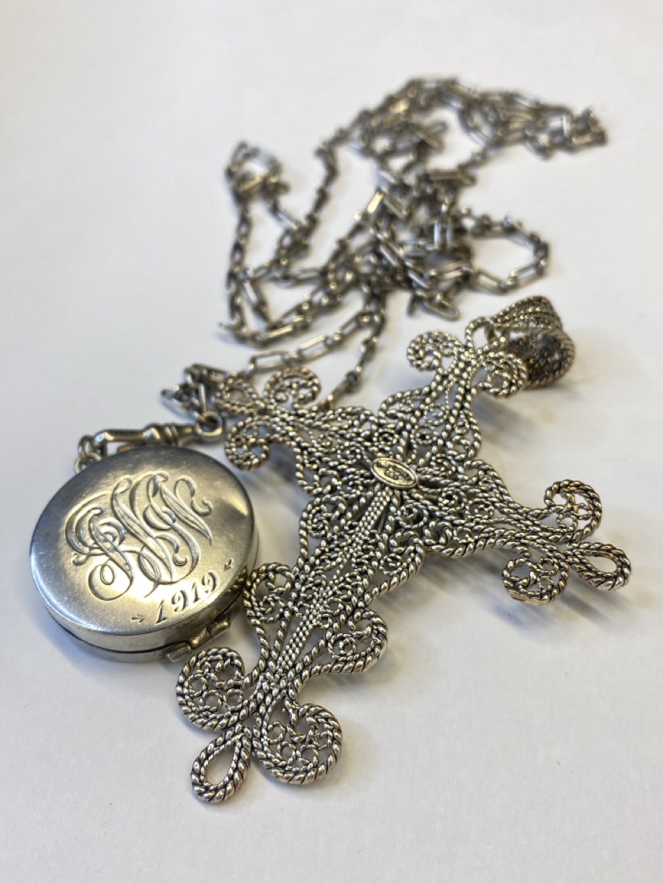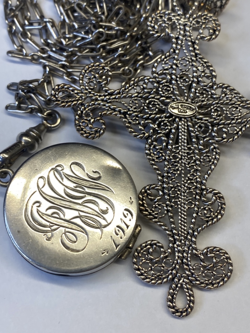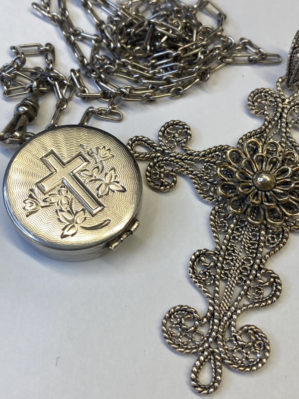 Sterling silver religious jewelry. A small box and 38" fob chain dated 1919 and Turkish filligree 3" X 2" cross pendant.