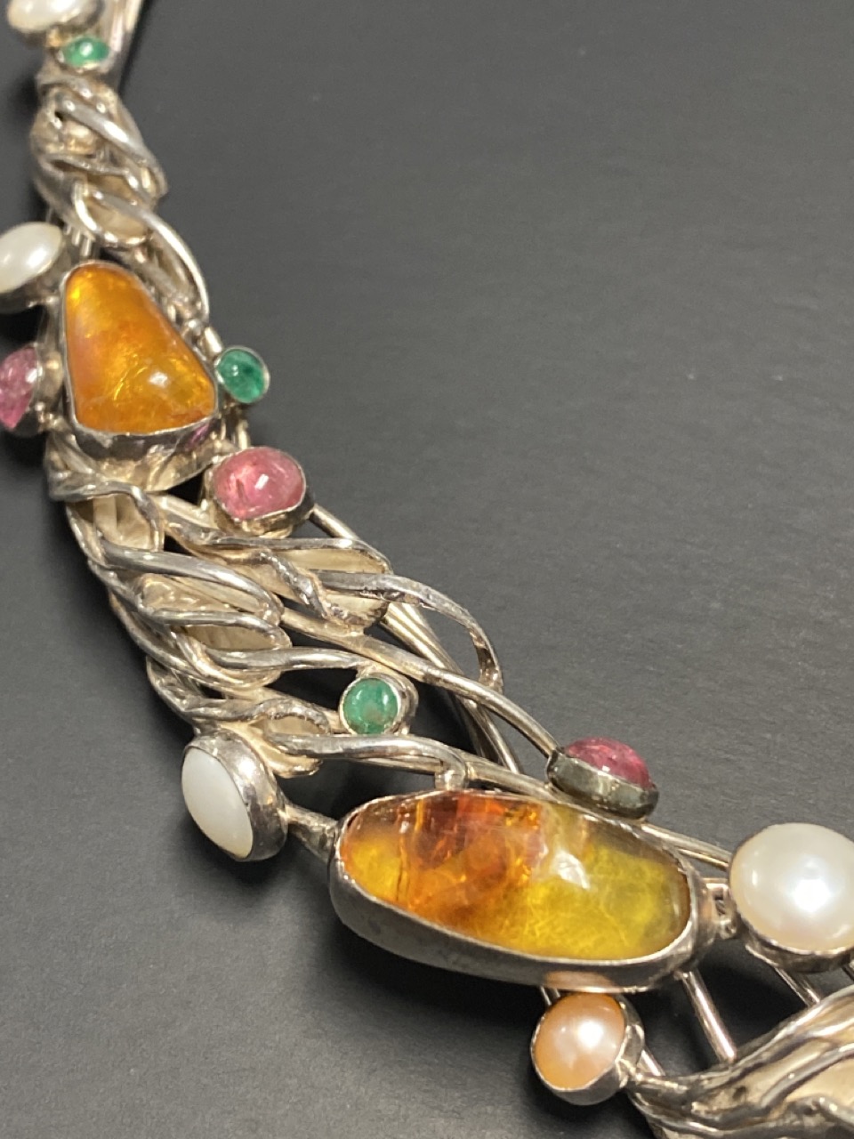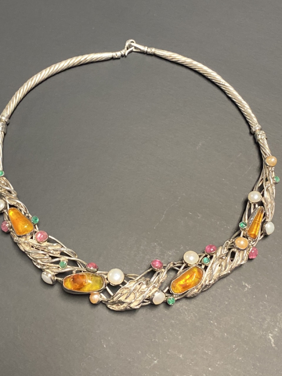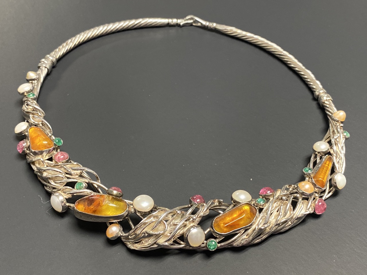 Marius S. Winograd (Polish/American) sterling silver choker style necklace with amber, pearls, pink tourmaline and emeralds.