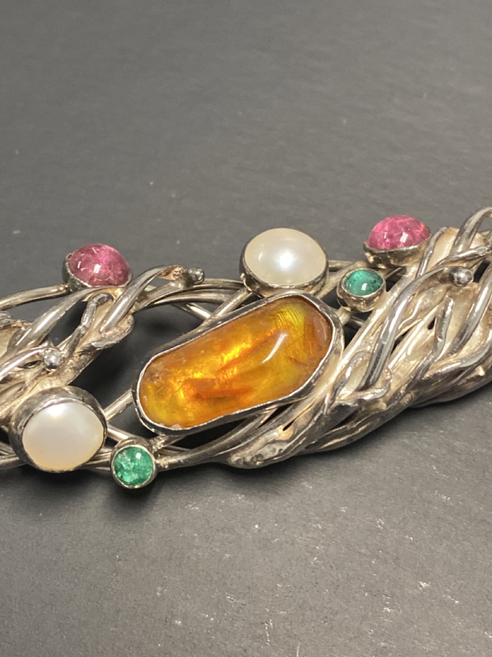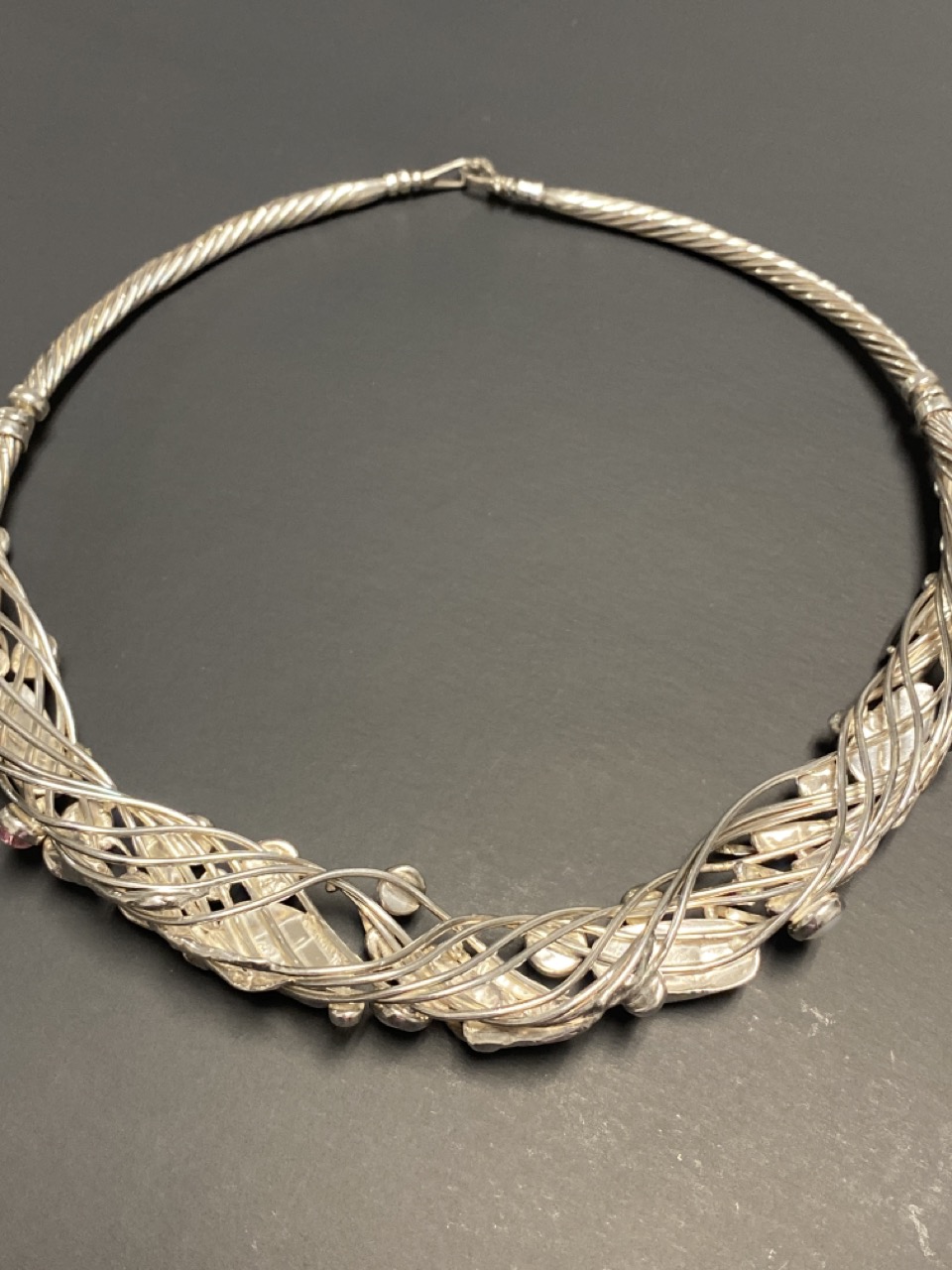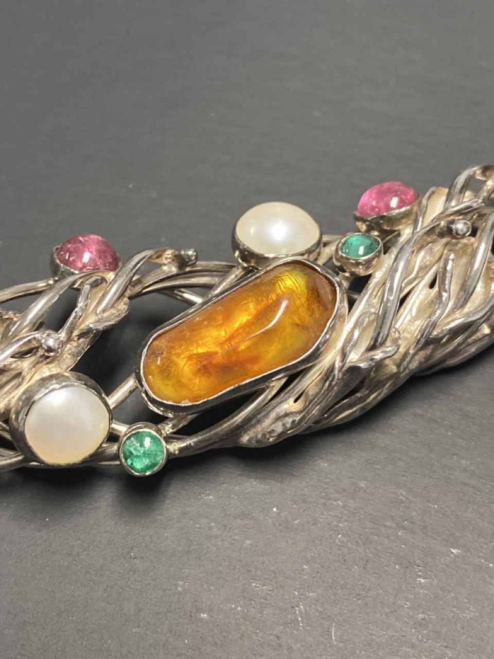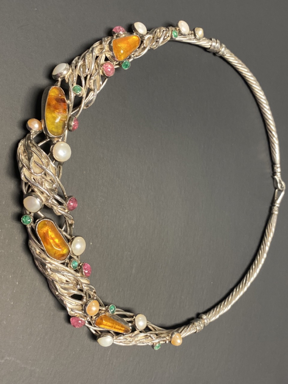 Marius S. Winograd (Polish/American) sterling silver choker style necklace with amber, pearls, pink tourmaline and emeralds.
