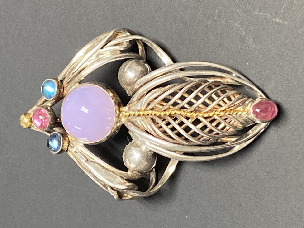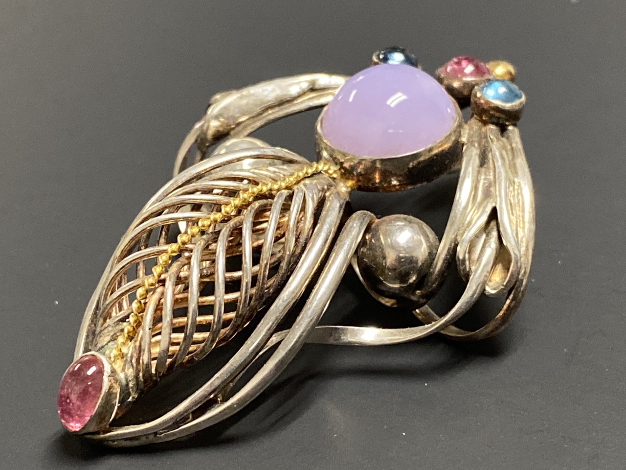 Marius S. Winograd (Polish/American) Original Artisan Piece. Sterling Silver & 18k Gold Pendant with pink quartz, pink tourmaline and blue topaz stones.