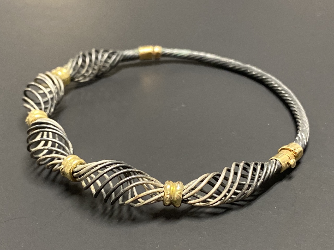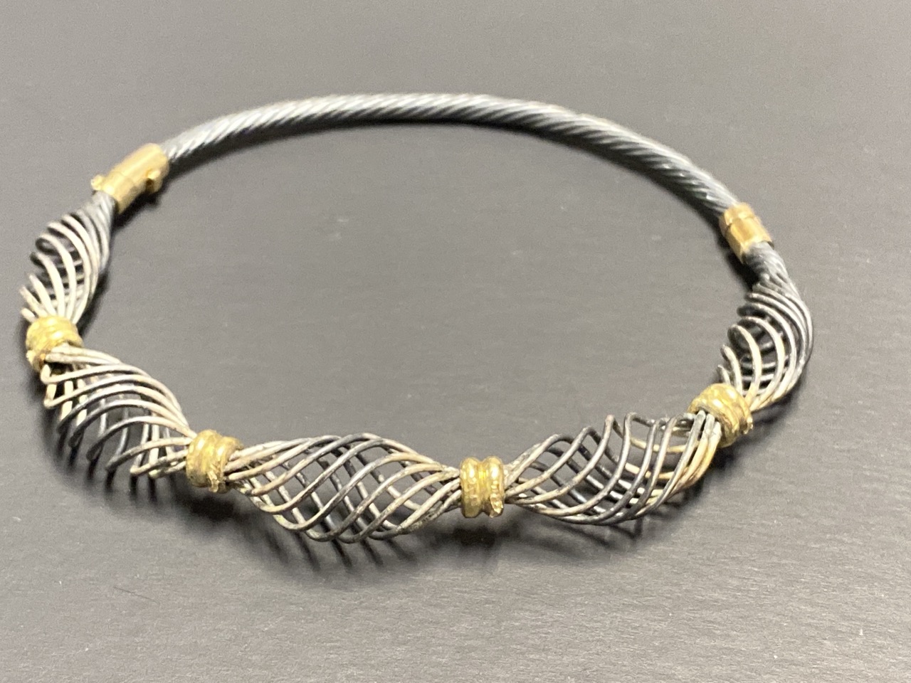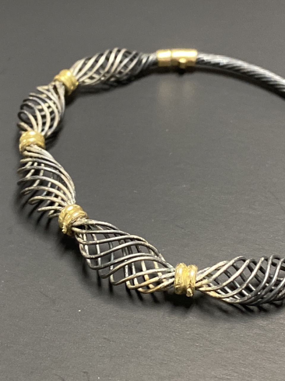 Marius S. Winograd (Polish/American) Original Artisan Piece. Oxidized sterling silver and 14k gold bracelet. Signature line design.