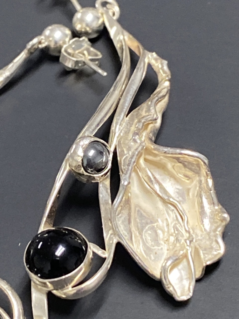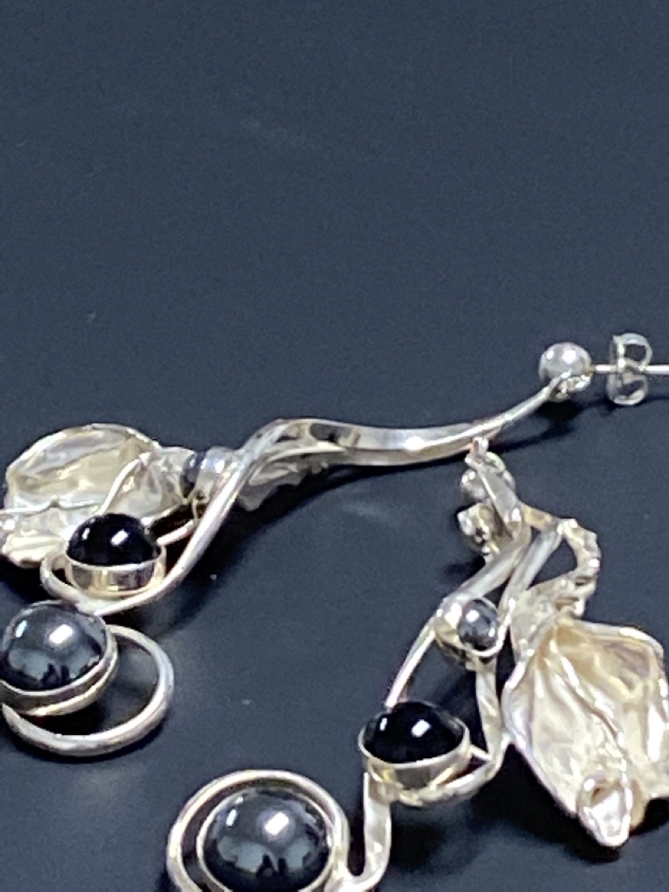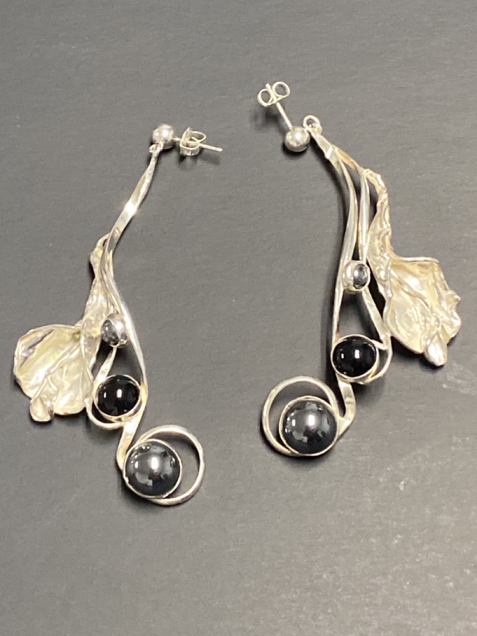 Sterling silver onyx and hematite floral design drop earrings.