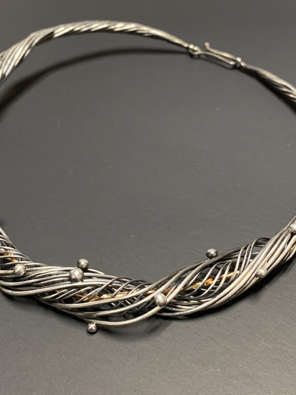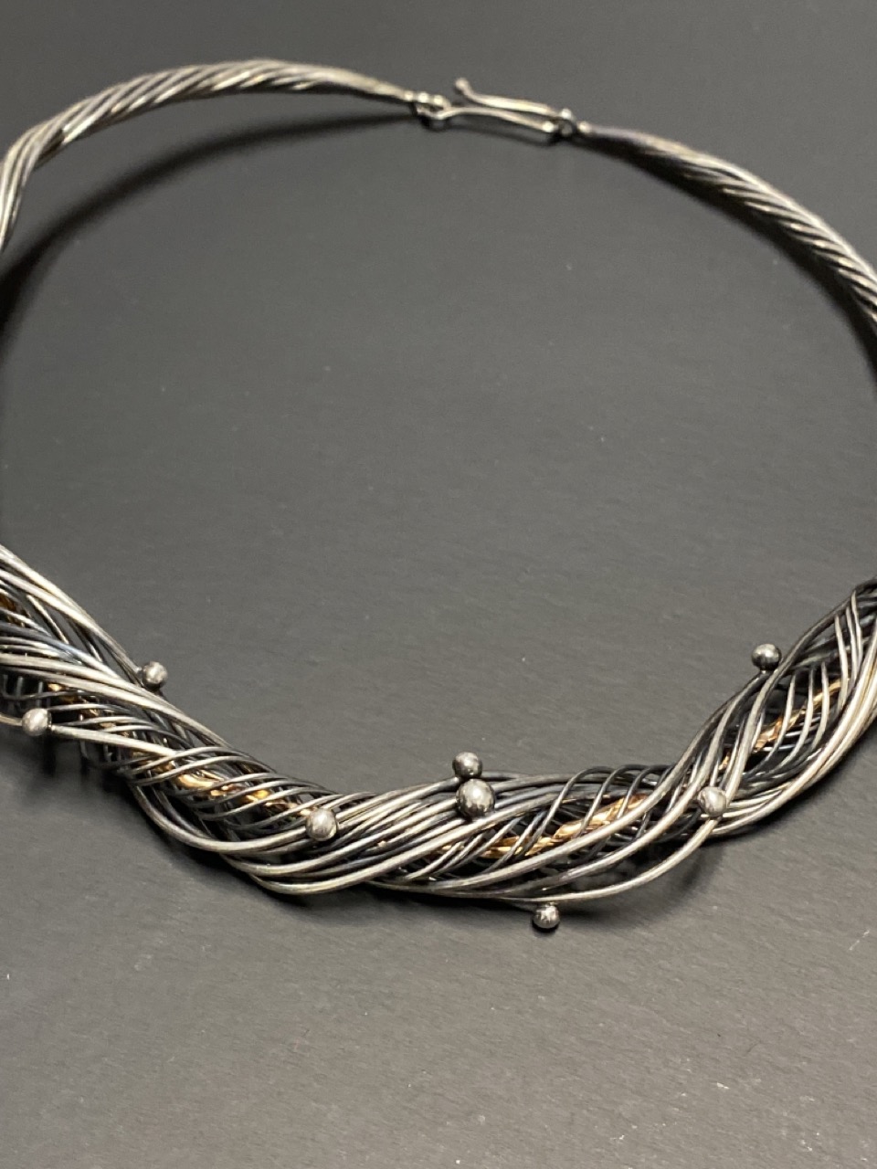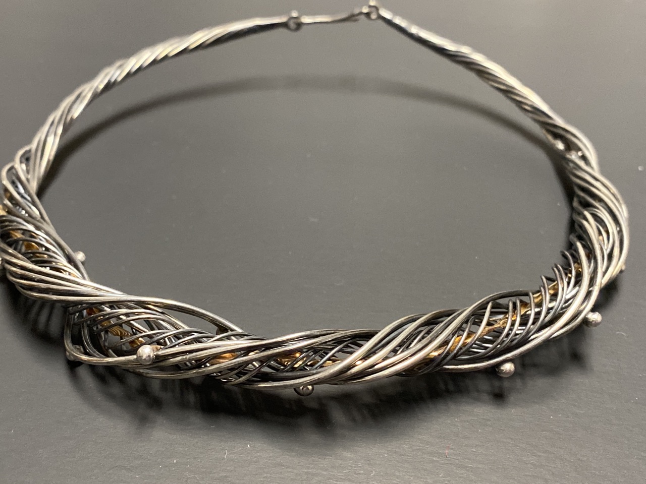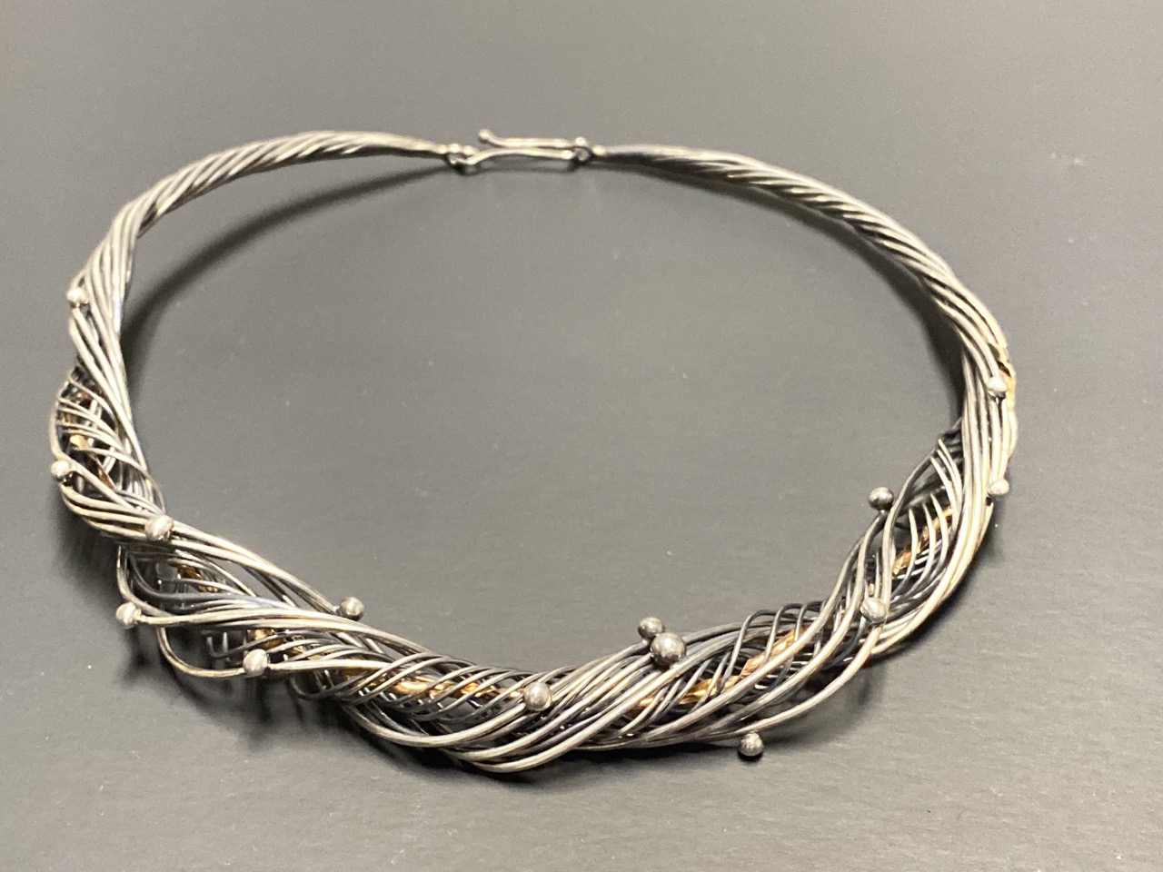 An oxidized sterling silver and 14k yellow gold choker necklace.