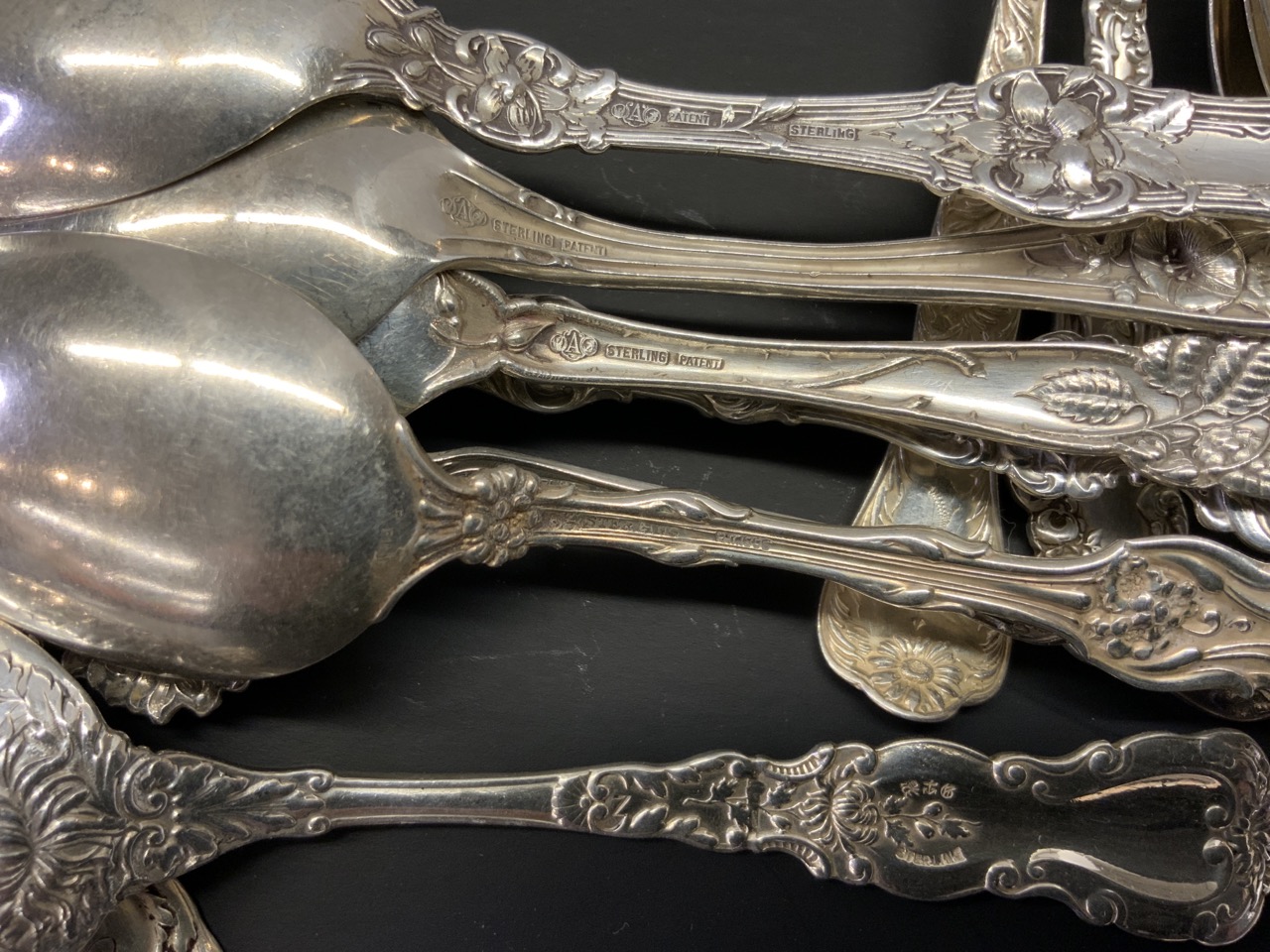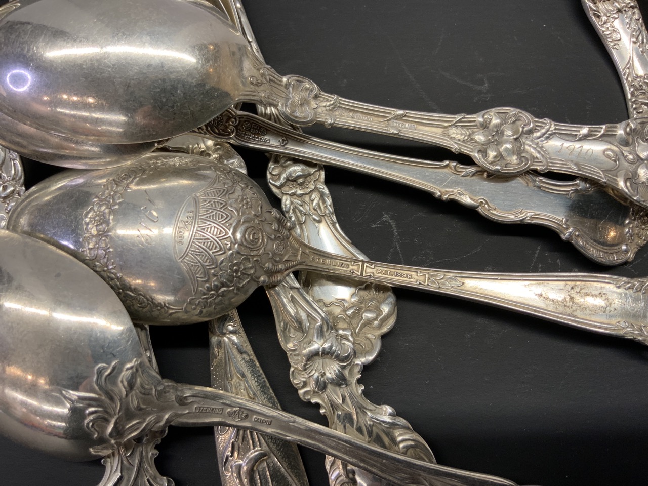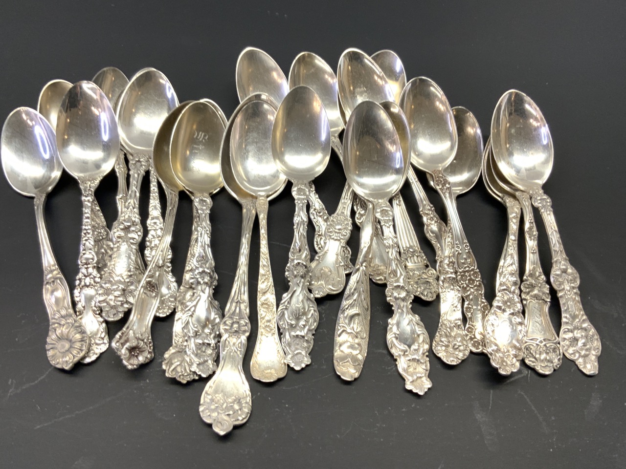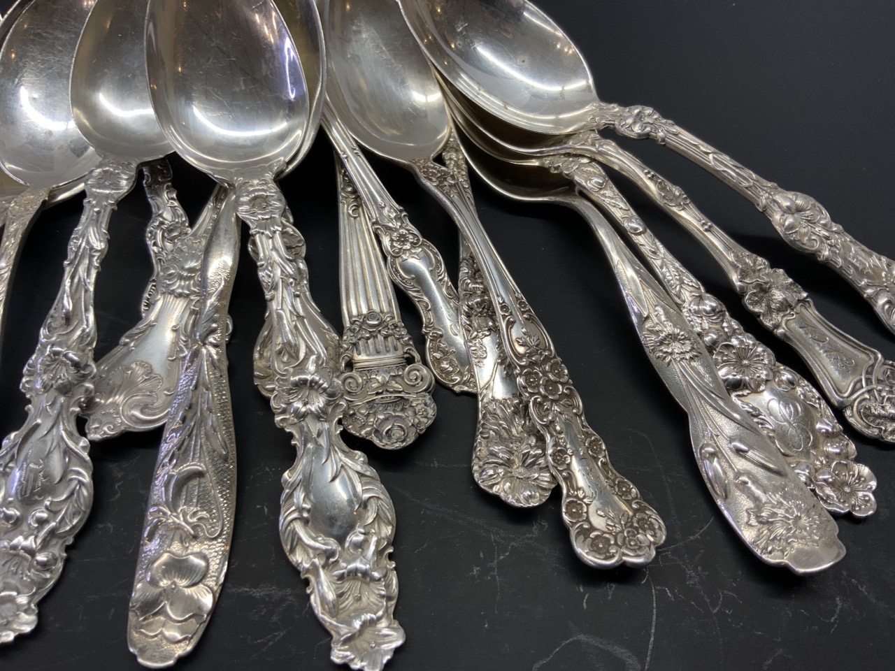 Victorian era sterling silver teaspoons. Various American Makers. Marks seen in photograph preview.