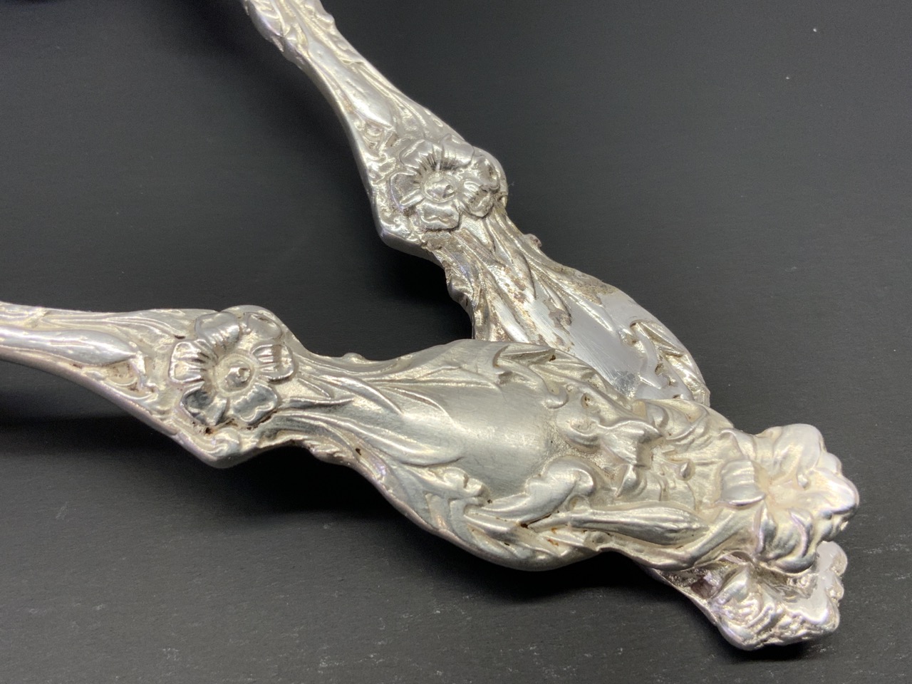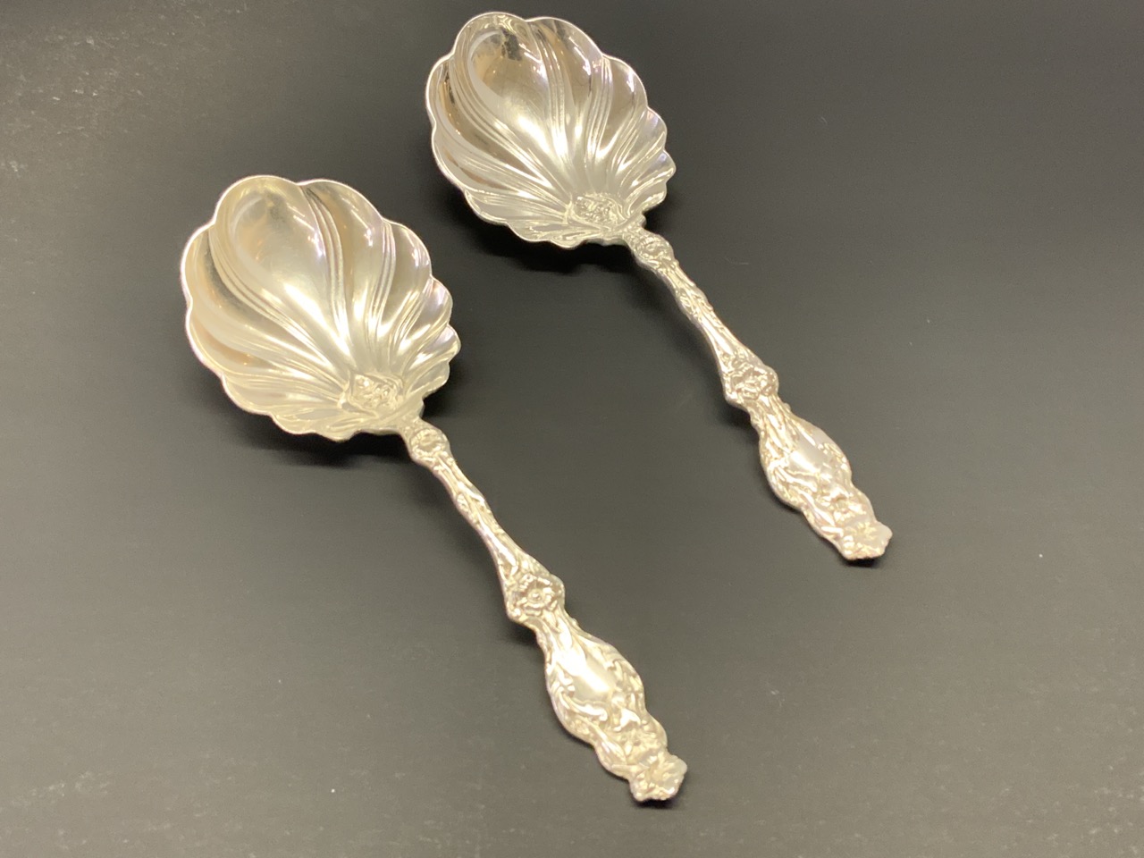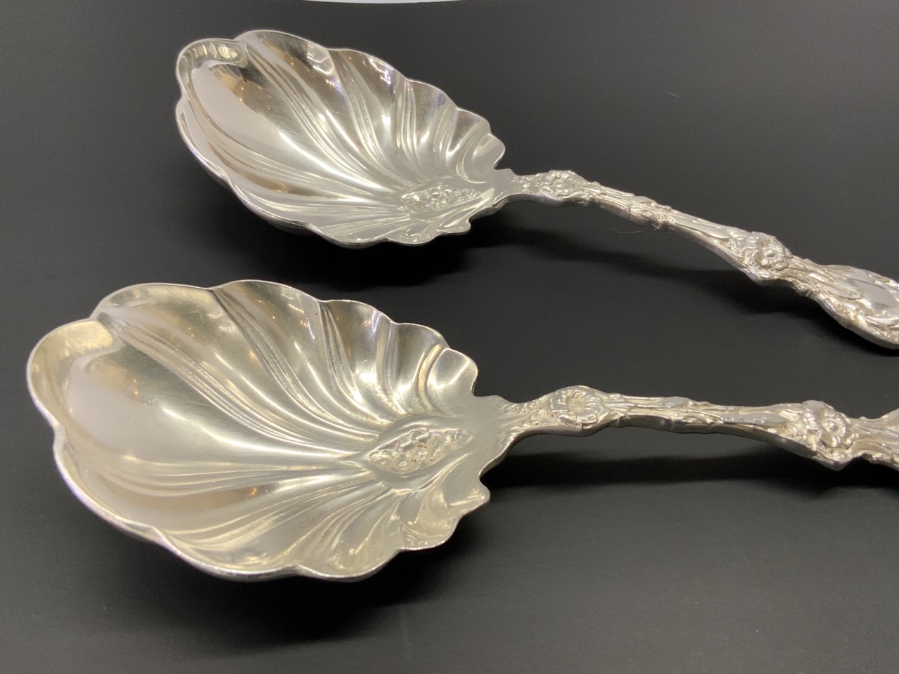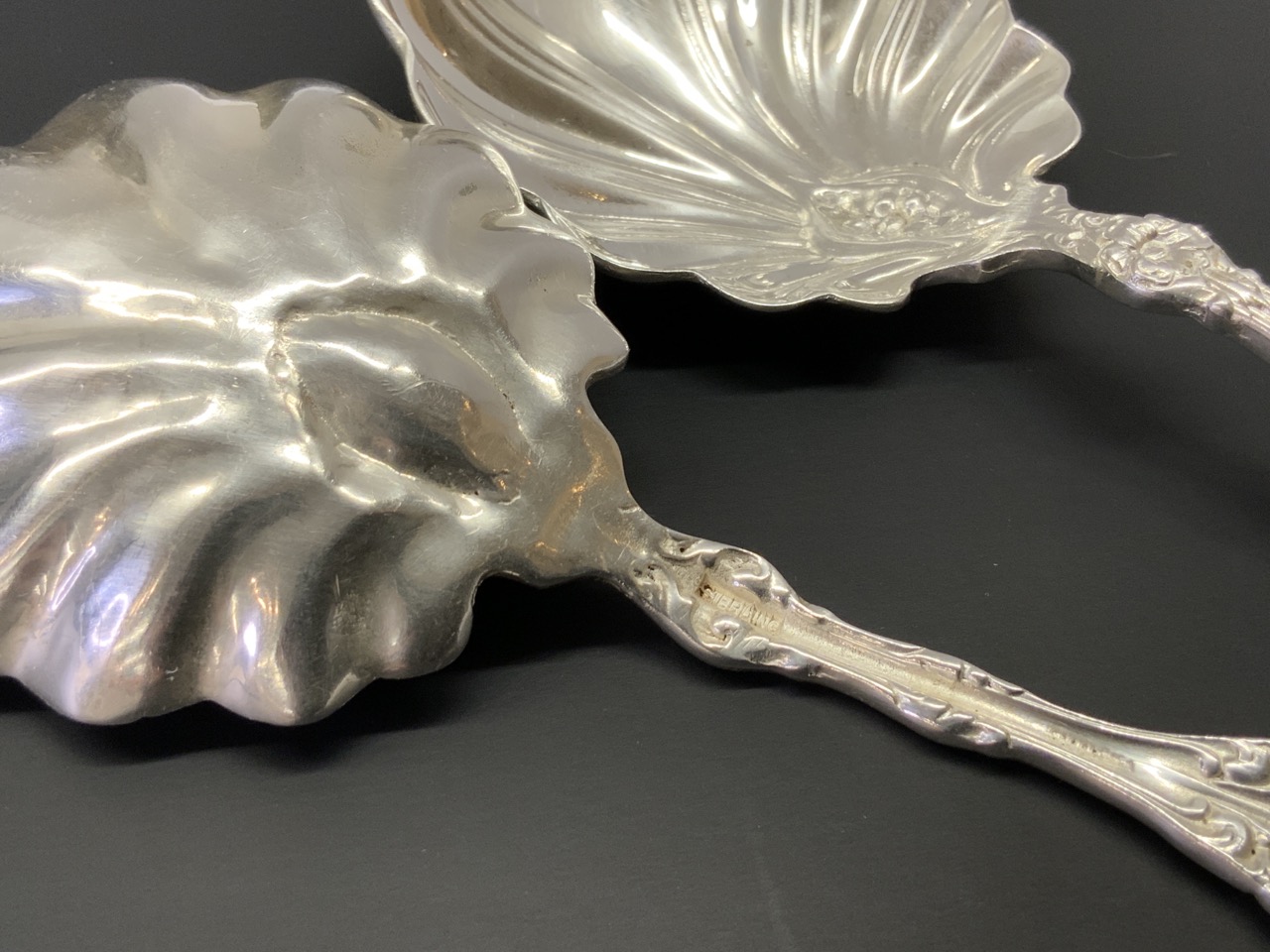 Highly ornate pair of sterling silver Victorian period serving spoons.