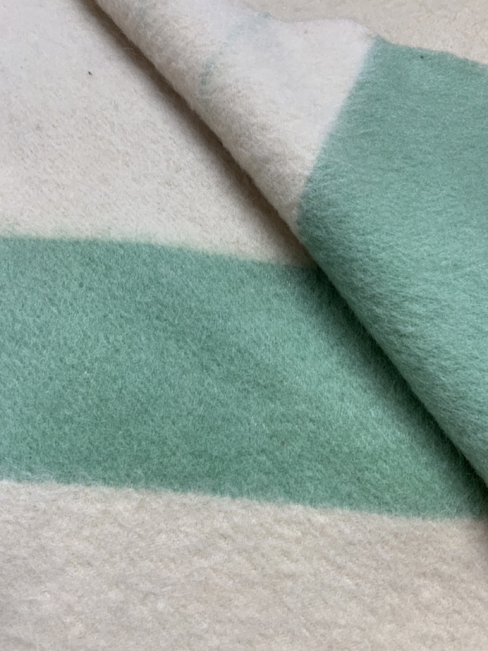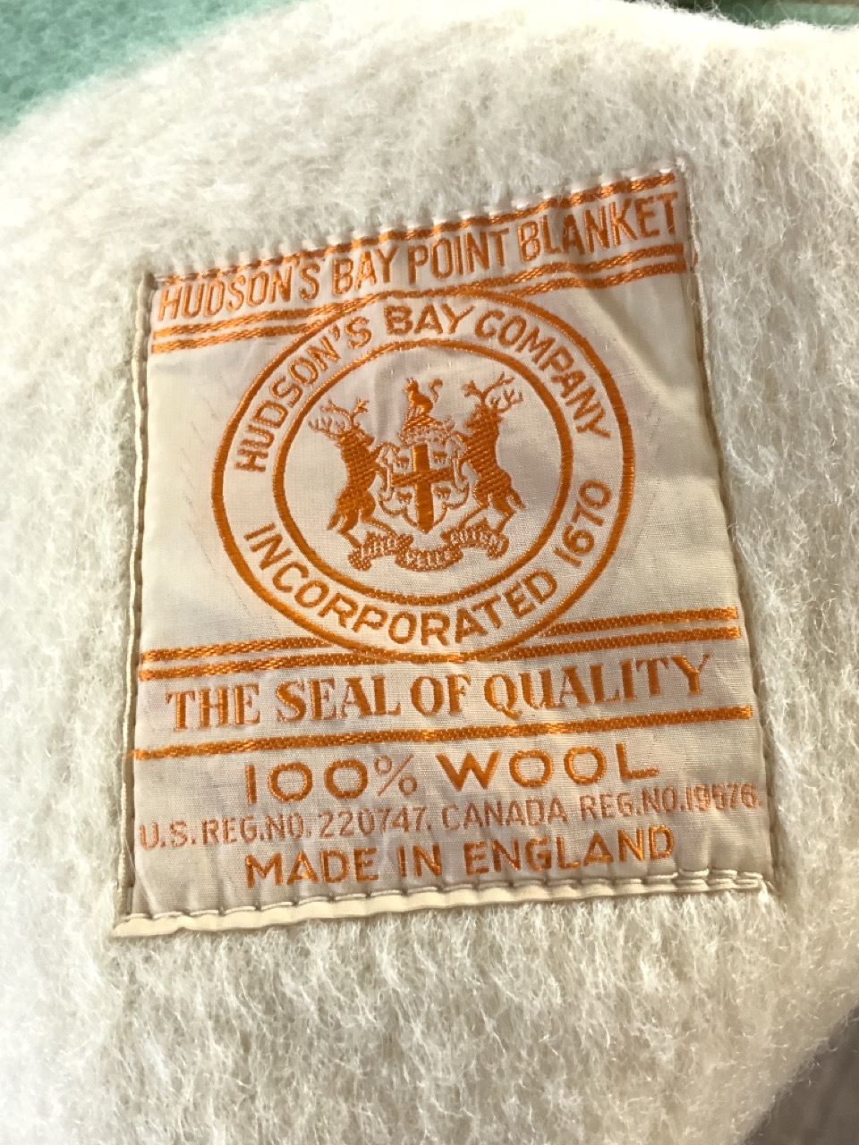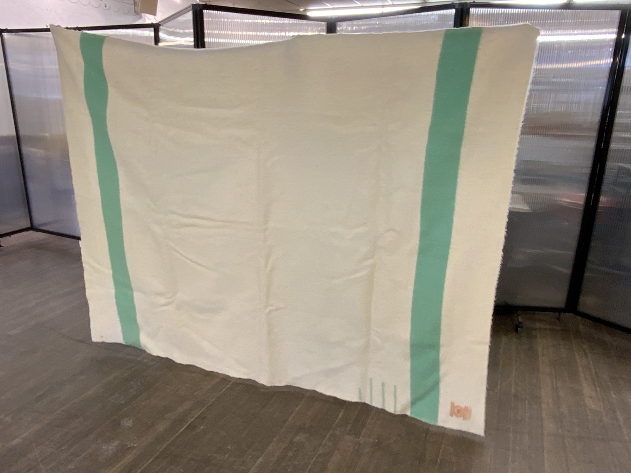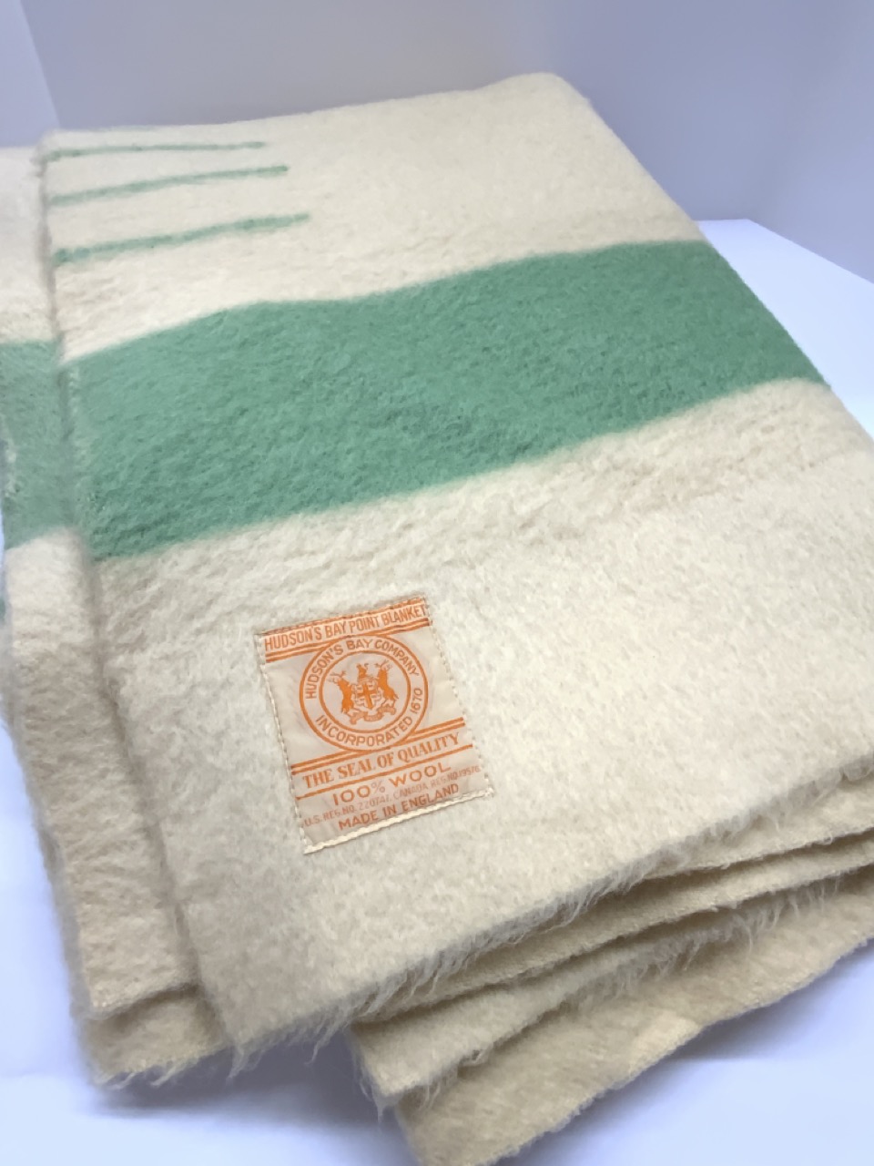 Vintage Green and Cream White Hudson Bay Blanket 100% Wool, Made in England.