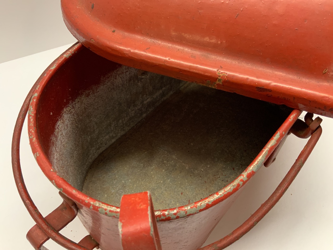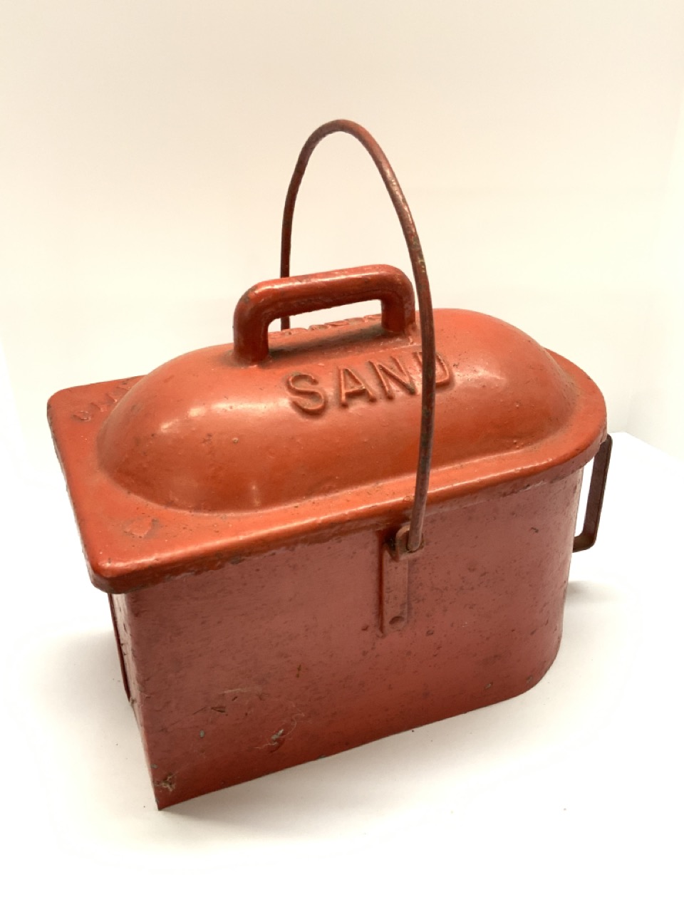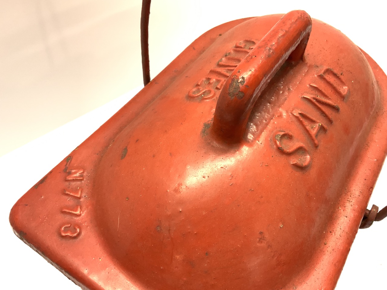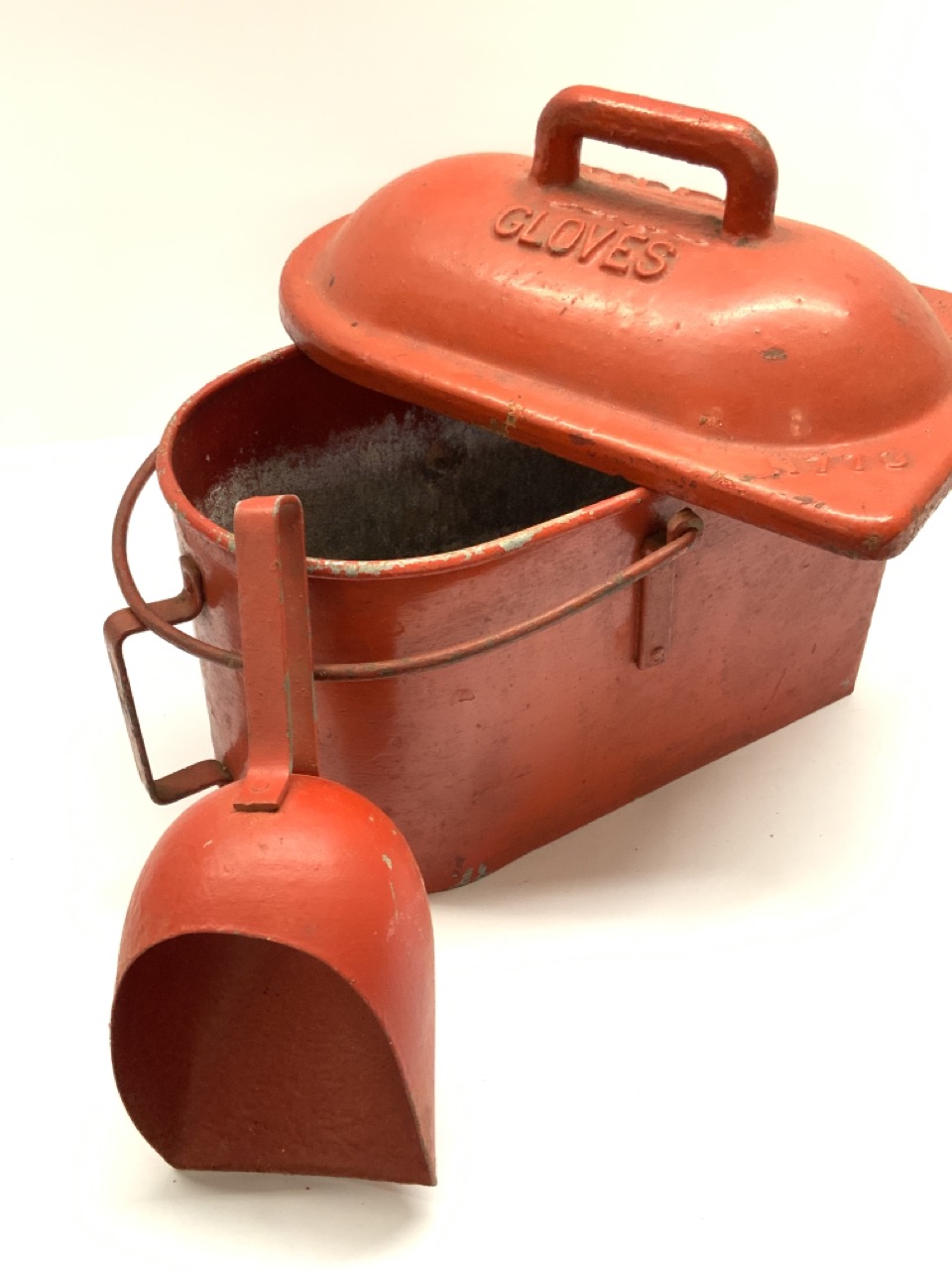 Fire Fighter Sand Glove Box with scoop. Scarce. Box base is galvanized aluminum and top is cast iron.