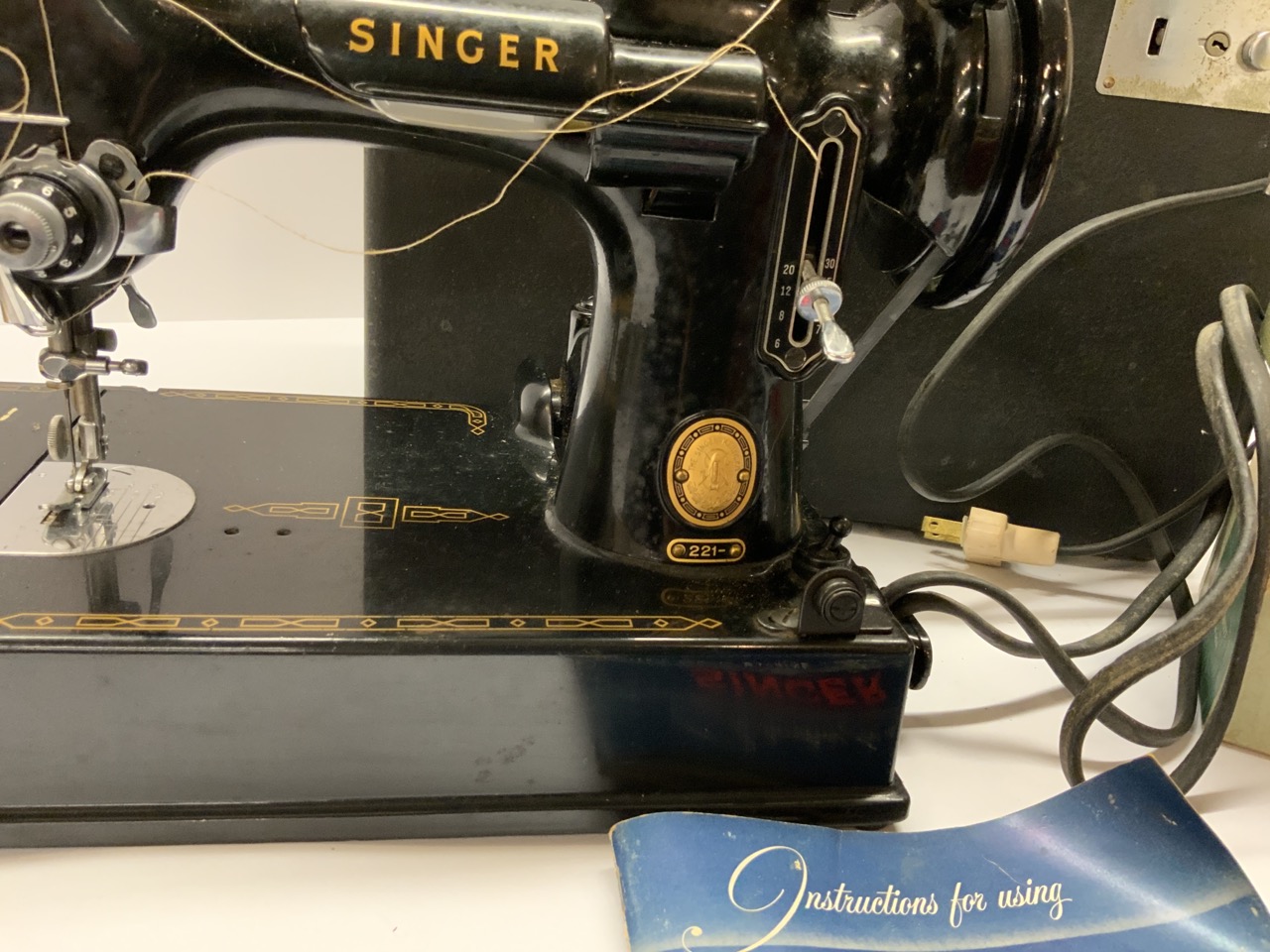 Singer #221 Featherweight Sewing Machine. Powered on and working. Very lightly used machine. Comes with extras as seen in photograph preview and manual. Has some white mildew seen on case and metal. Needs some cleaning due to sitting for a long time. No pungent odors.