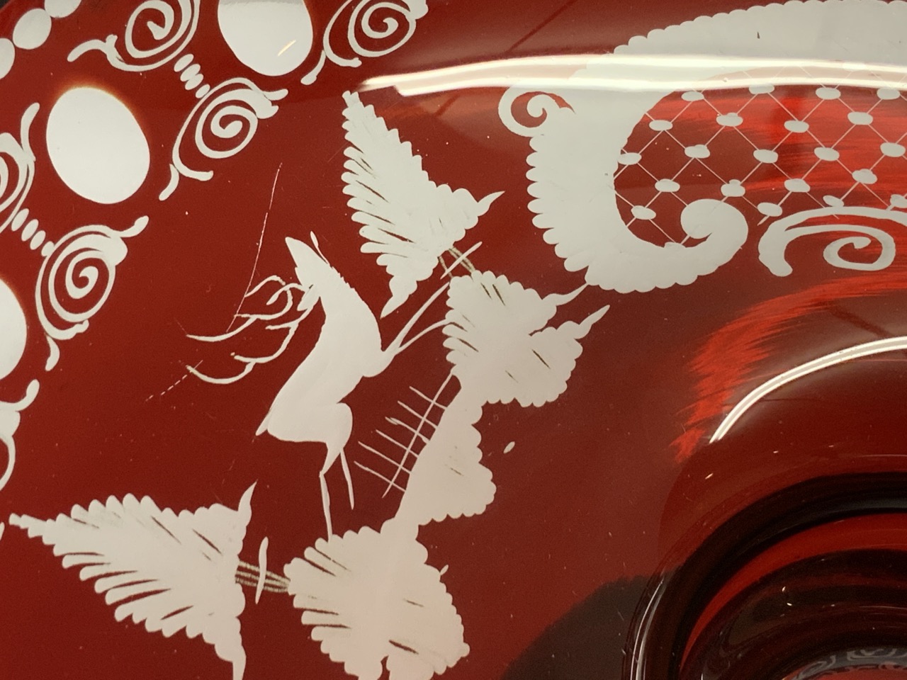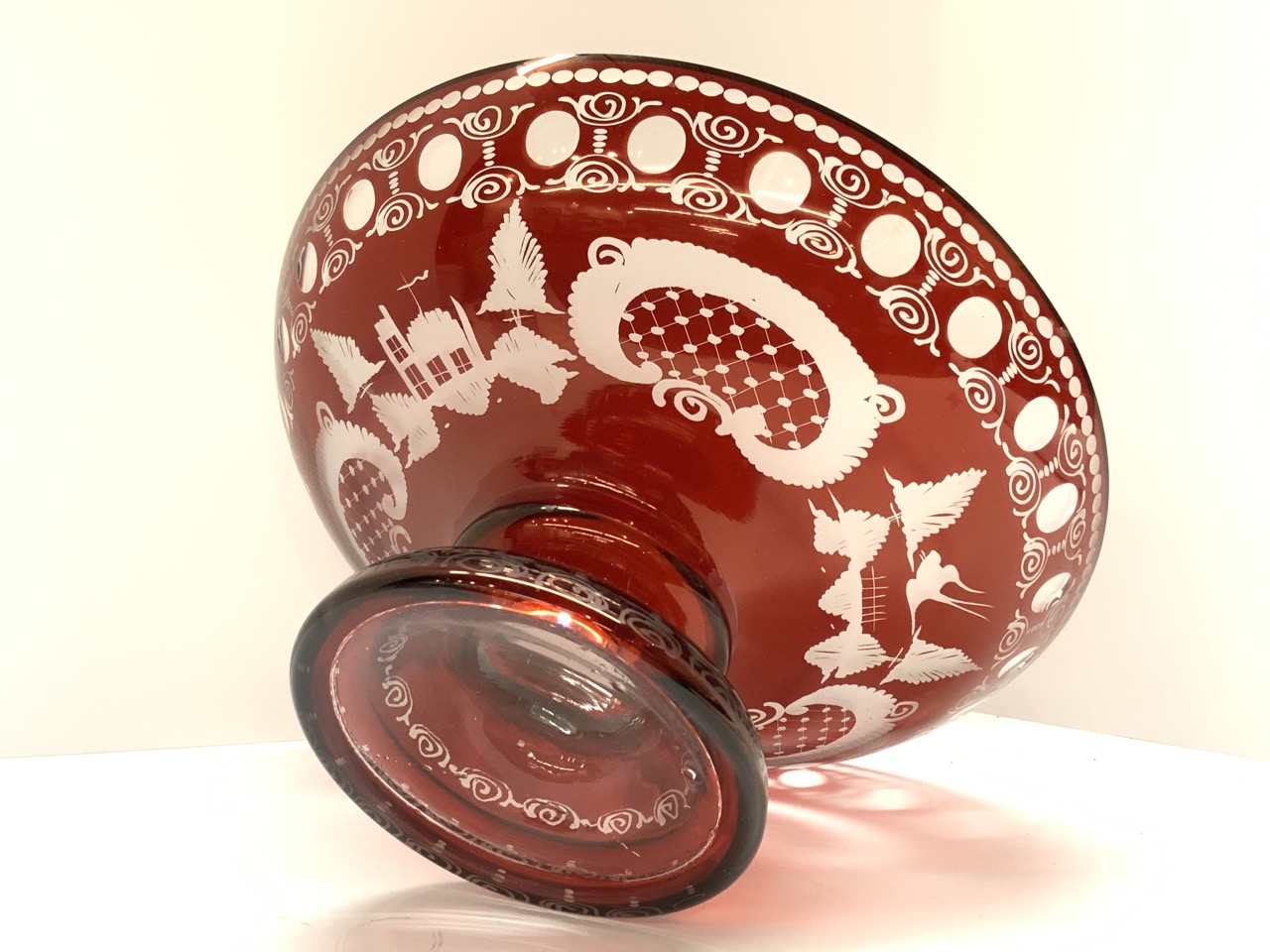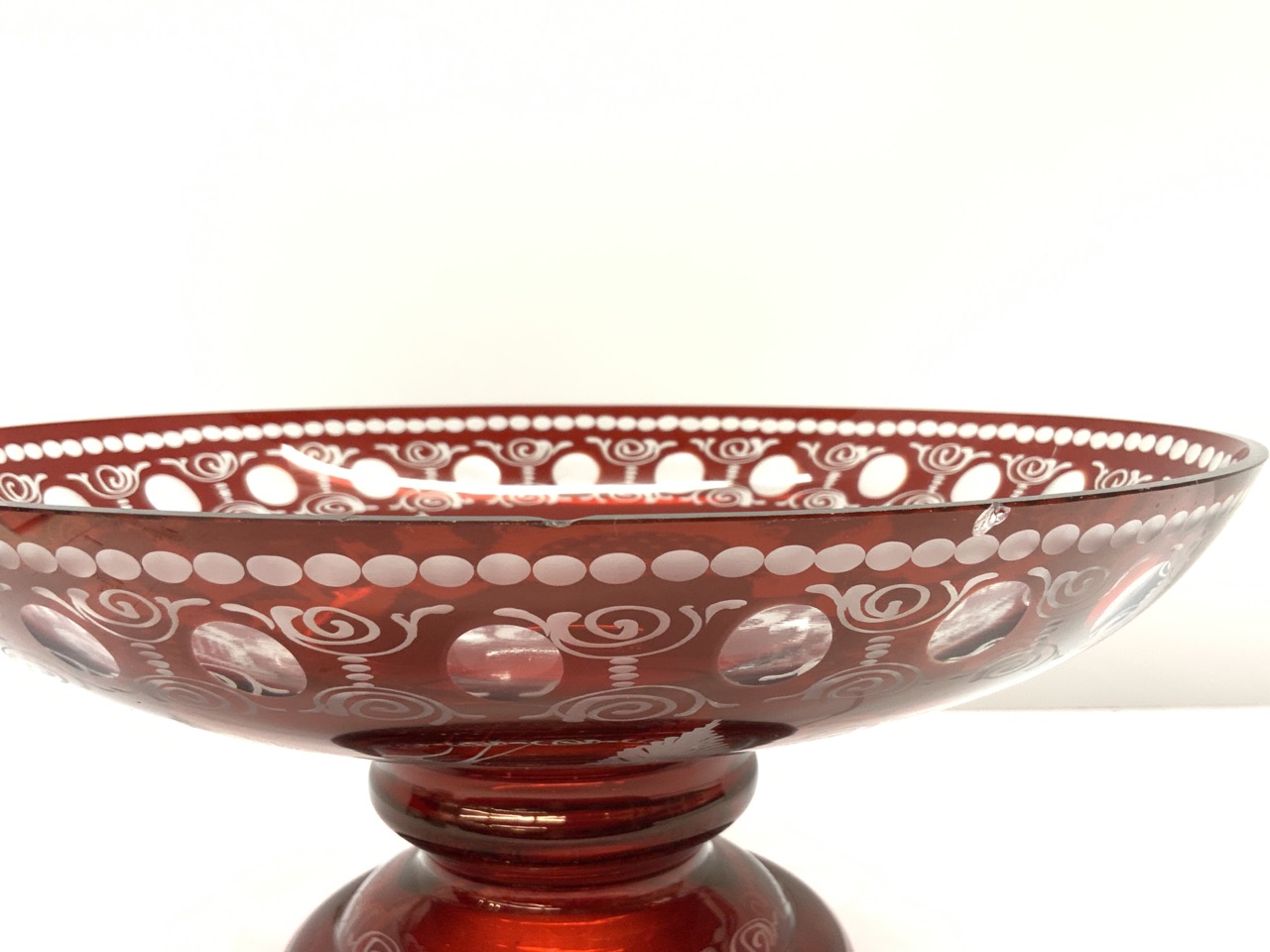 Bohemian cut to clear centerpiece bowl. scratch and two chips noted.