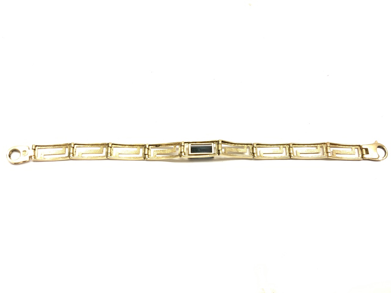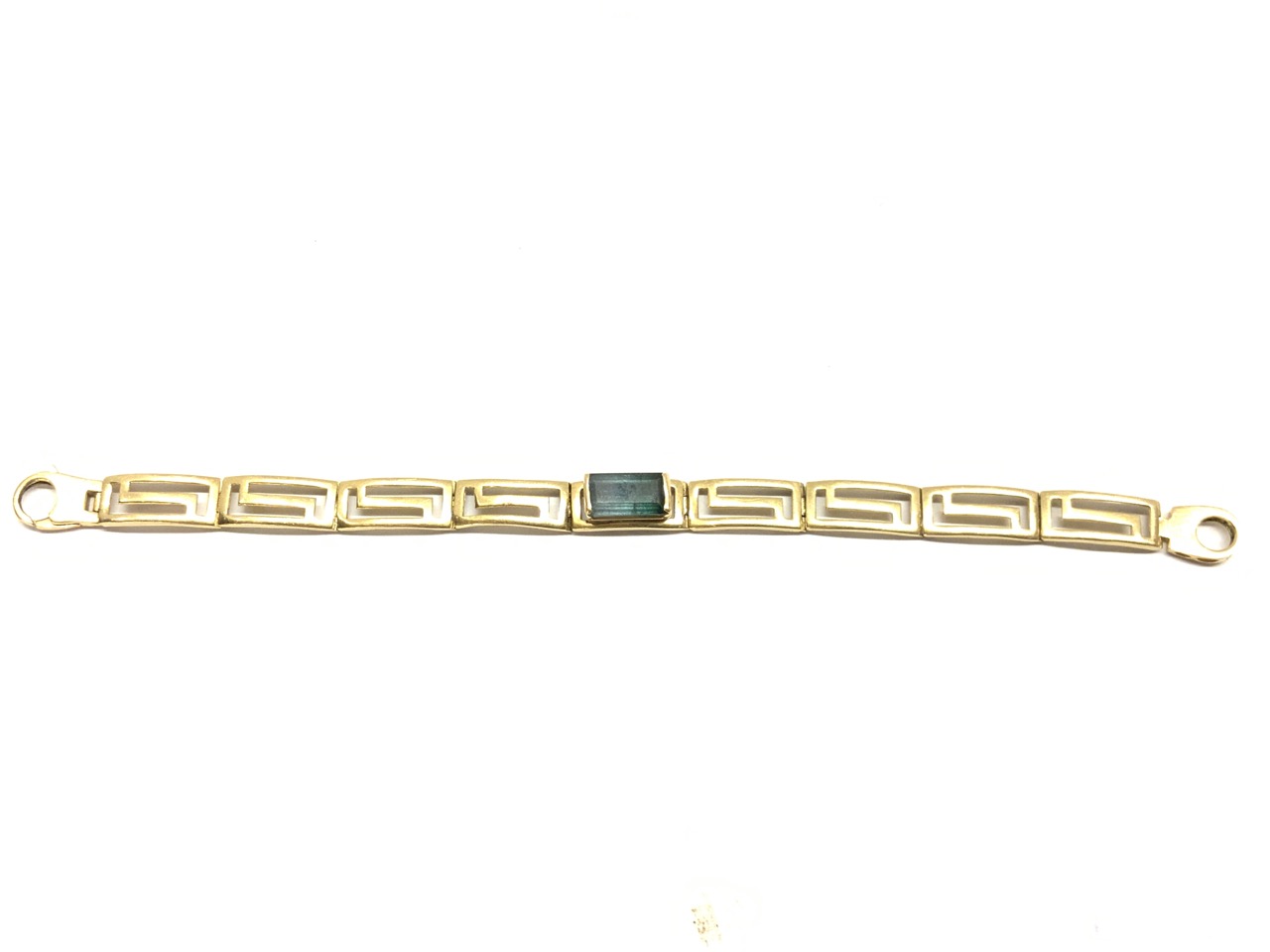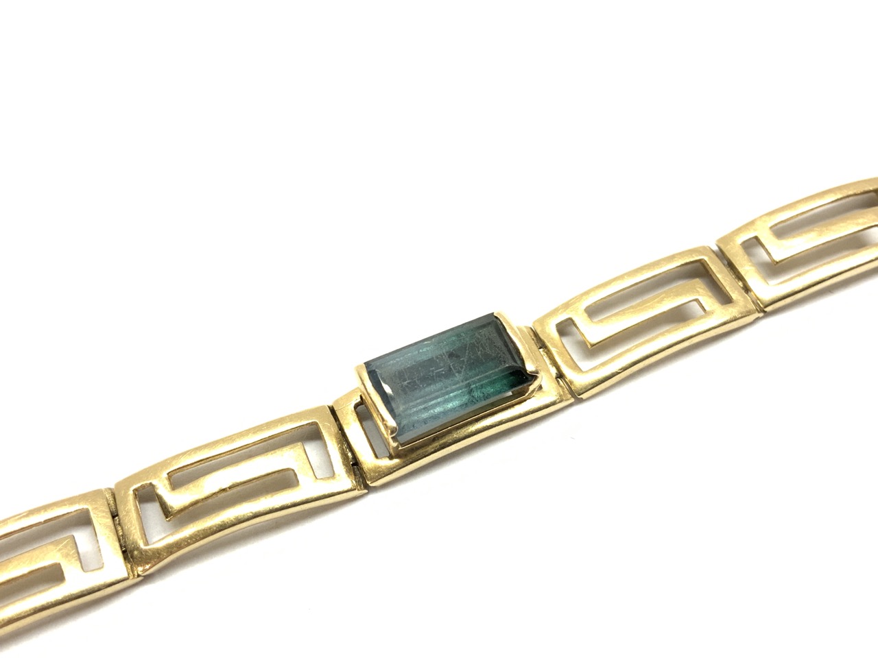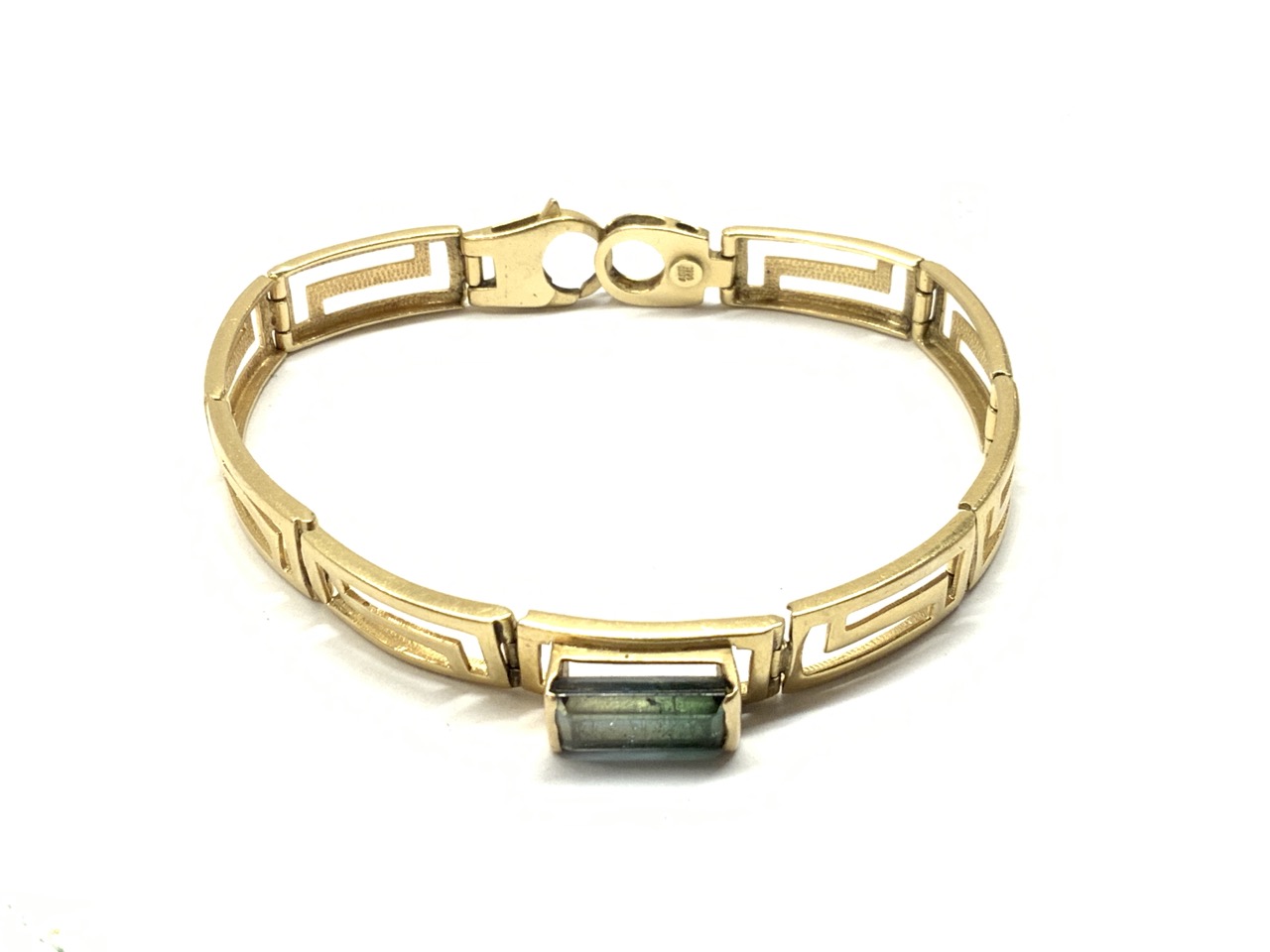 14k yellow gold bracelet with blue/green emerald cut stone.