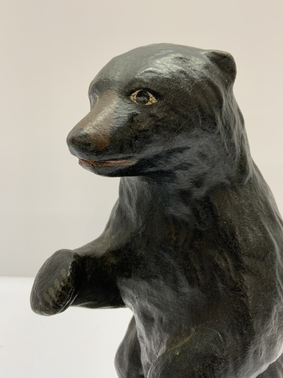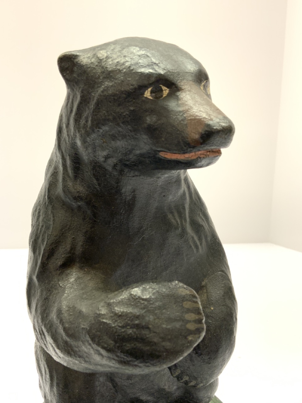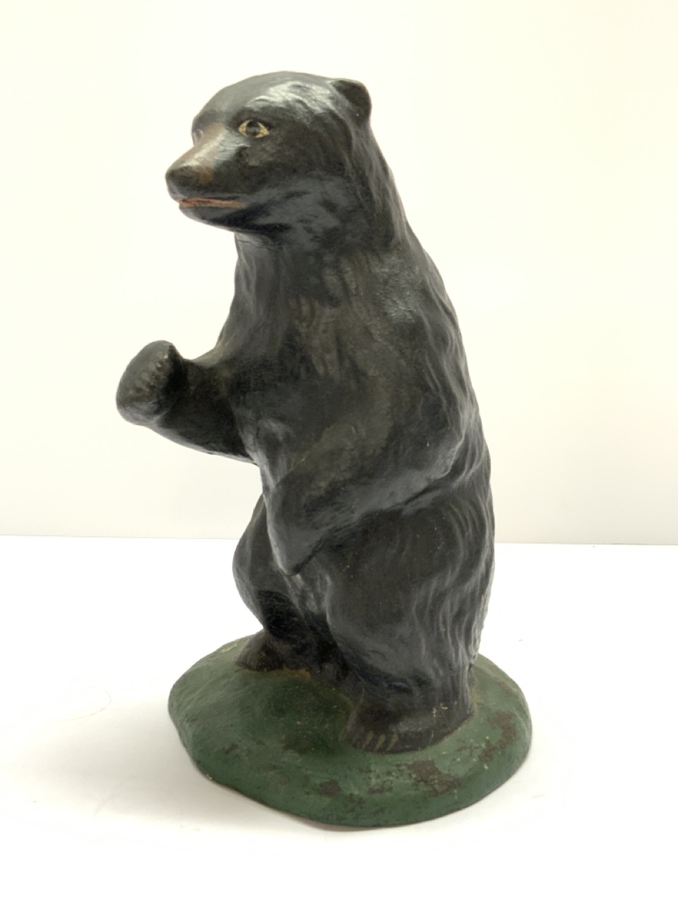 A solid rubber formed bear. Early 20th century store display or doorstop. Partial label at base.