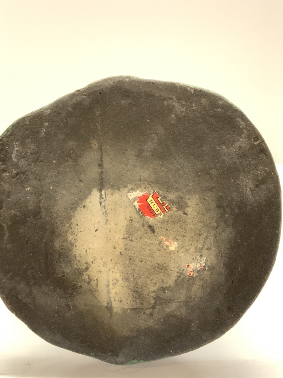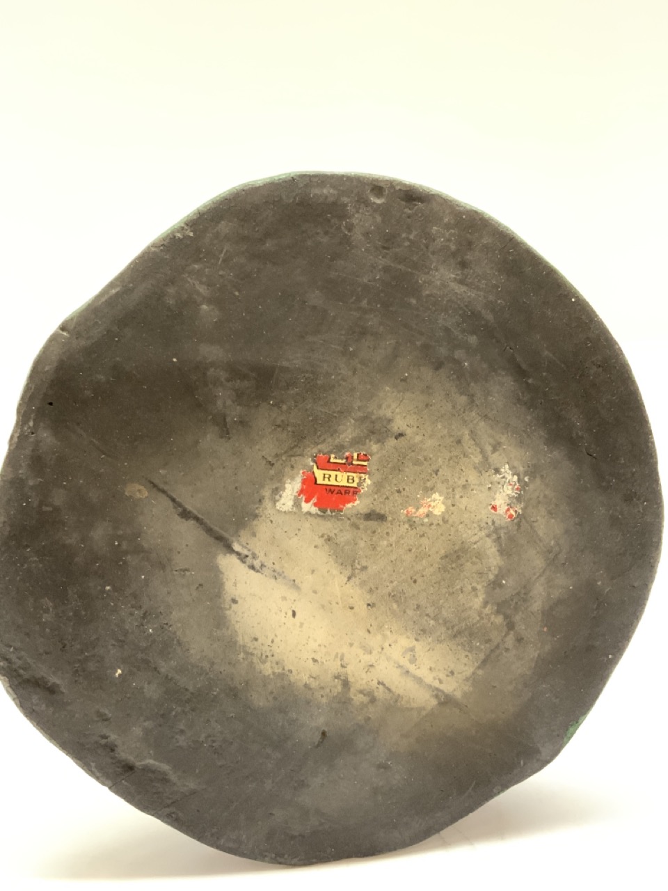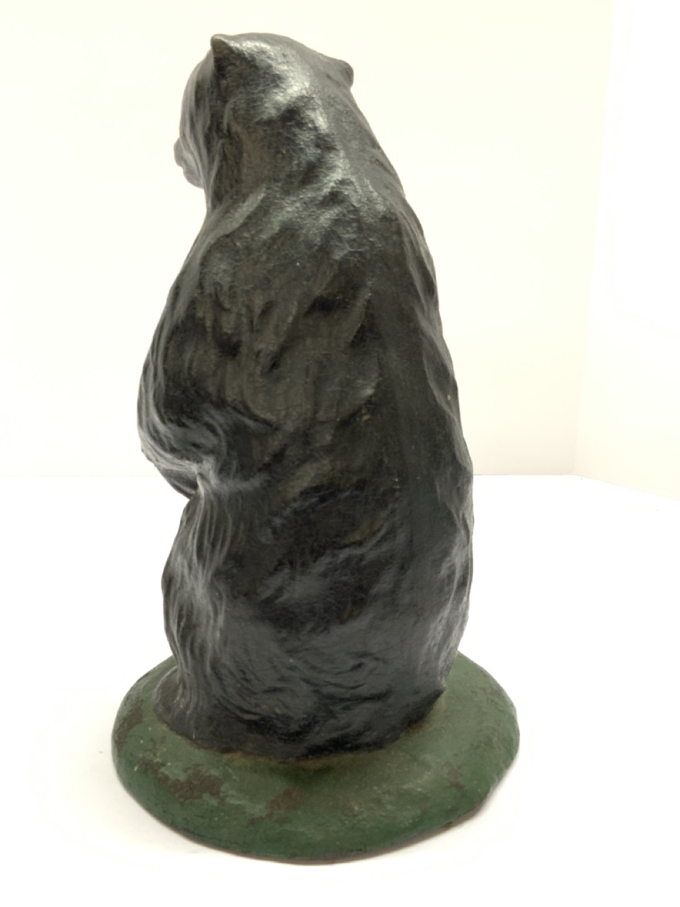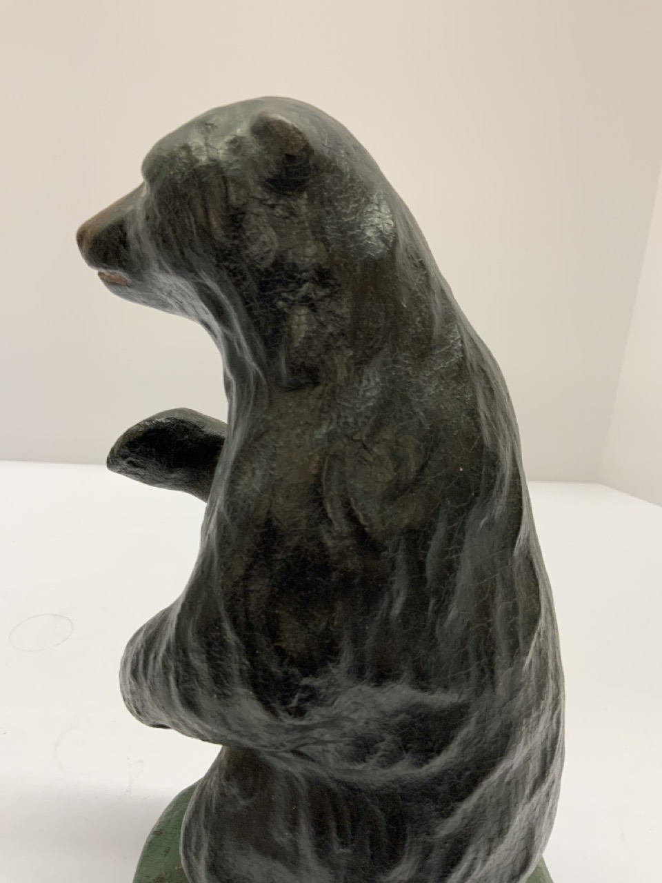 A solid rubber formed bear. Early 20th century store display or doorstop. Partial label at base.