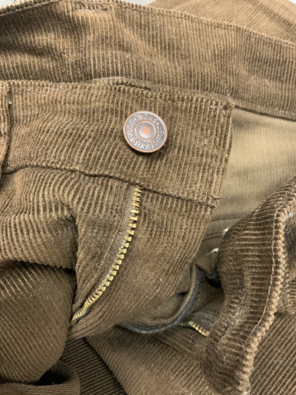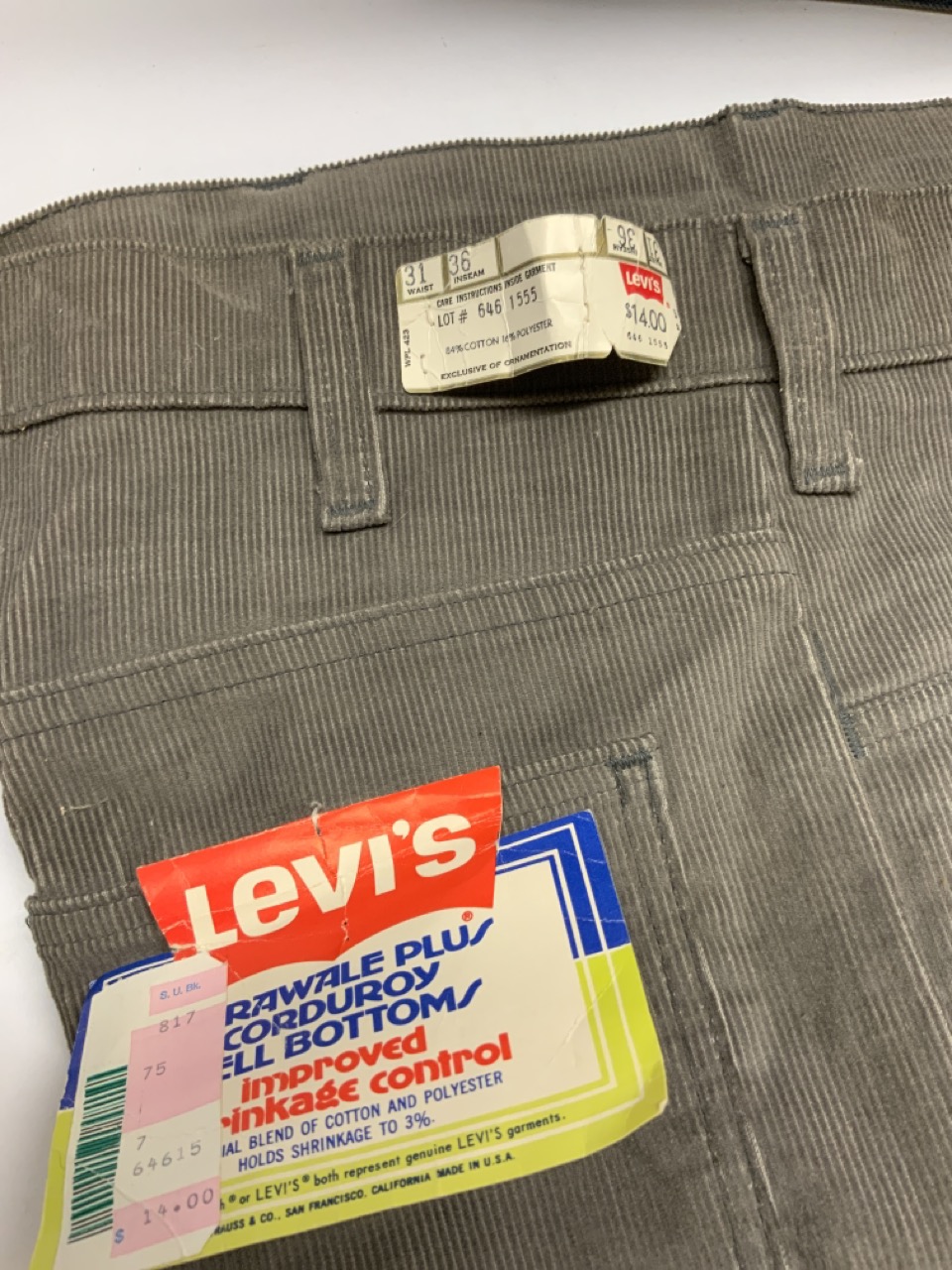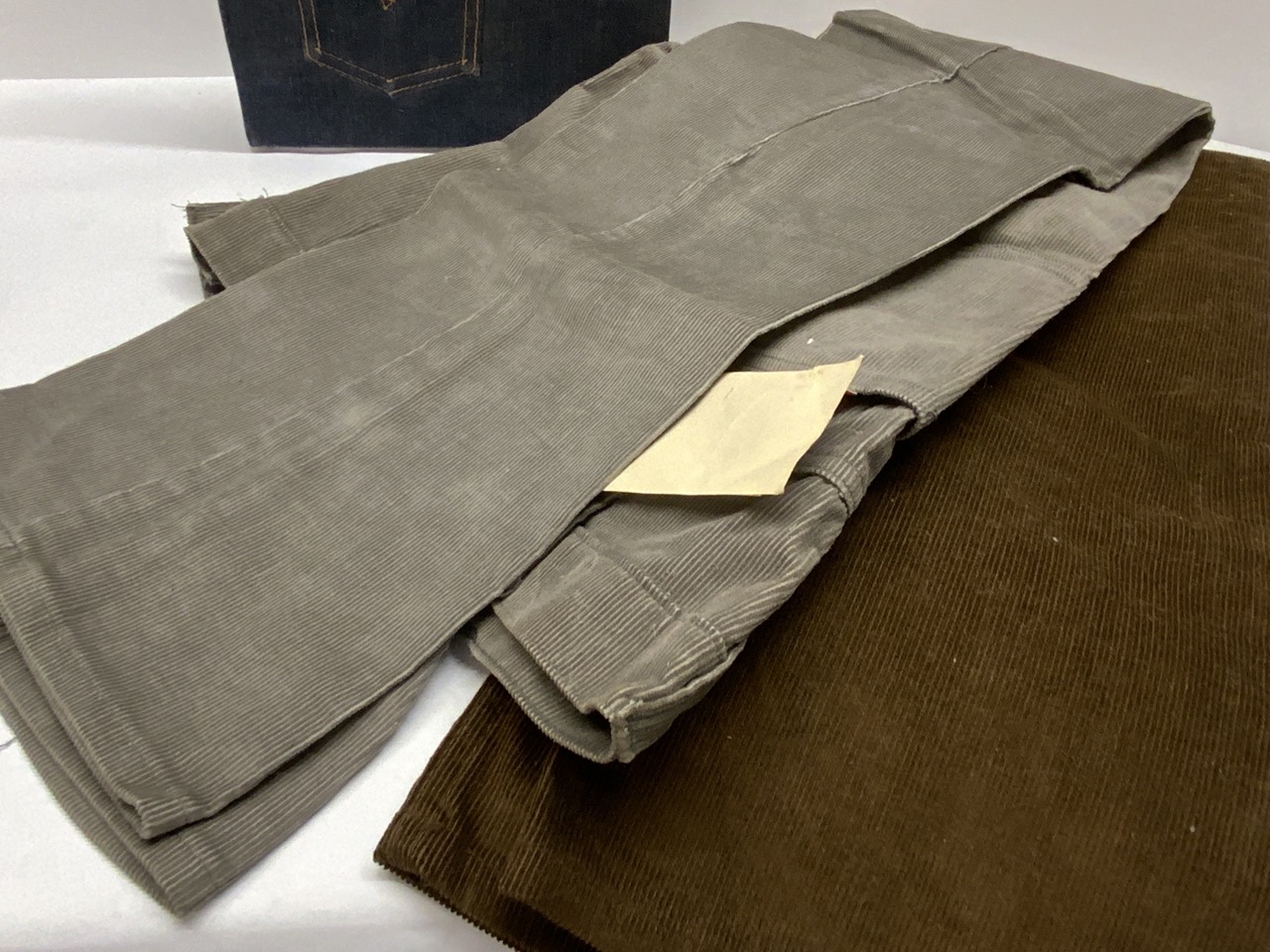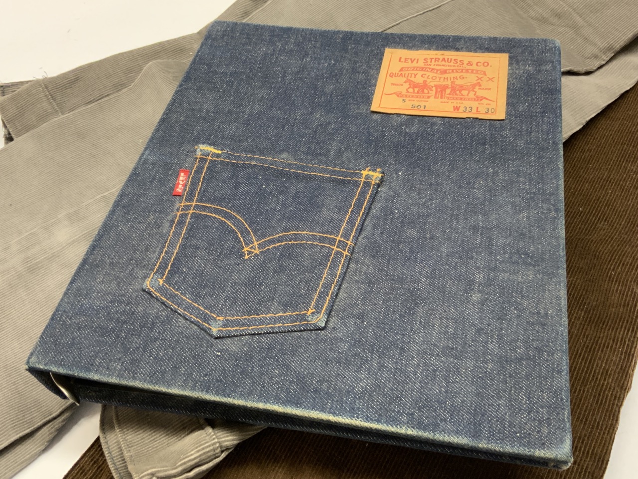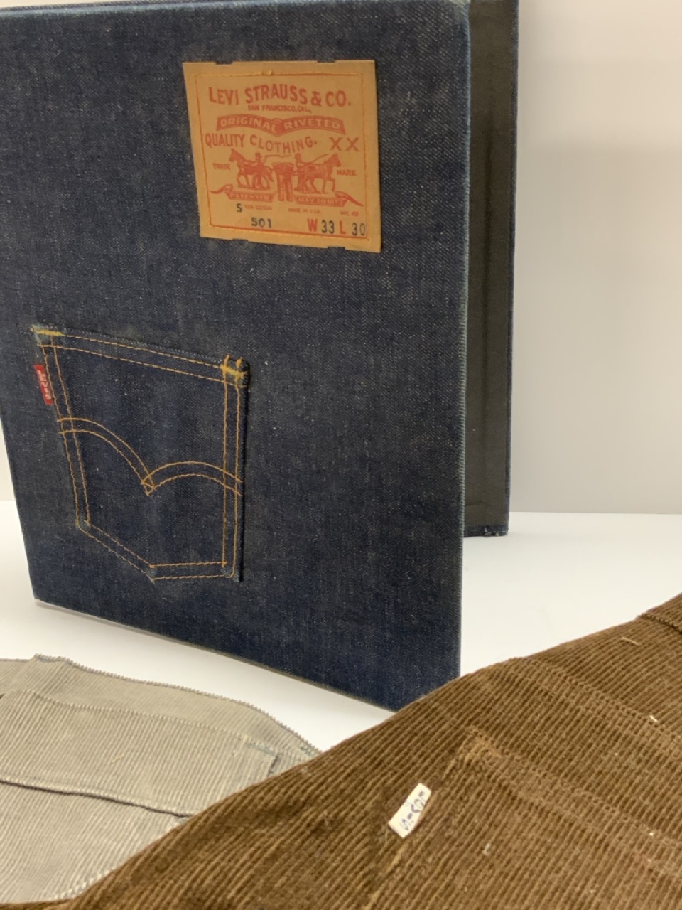 Levi's lightly used vintage Denim Binder and two pairs of vintage 70's Levi's corderoy grey and brown pants. Grey pair still having tags.