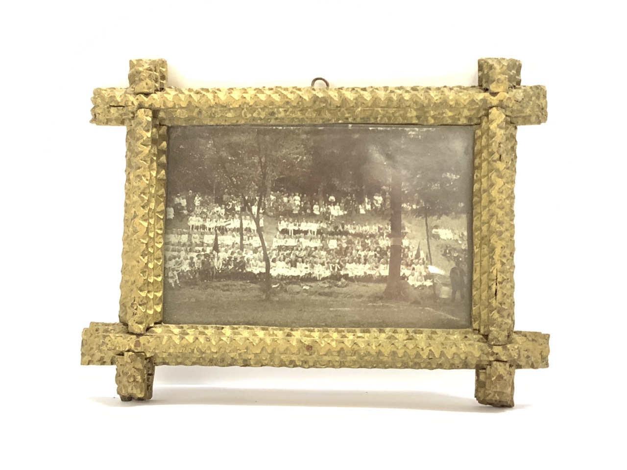 Black and white German children's camp photo in tramp art frame.