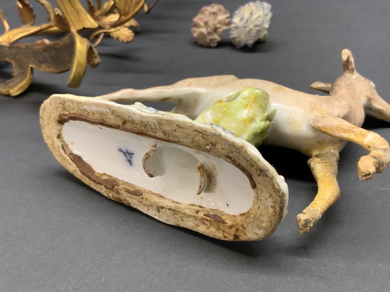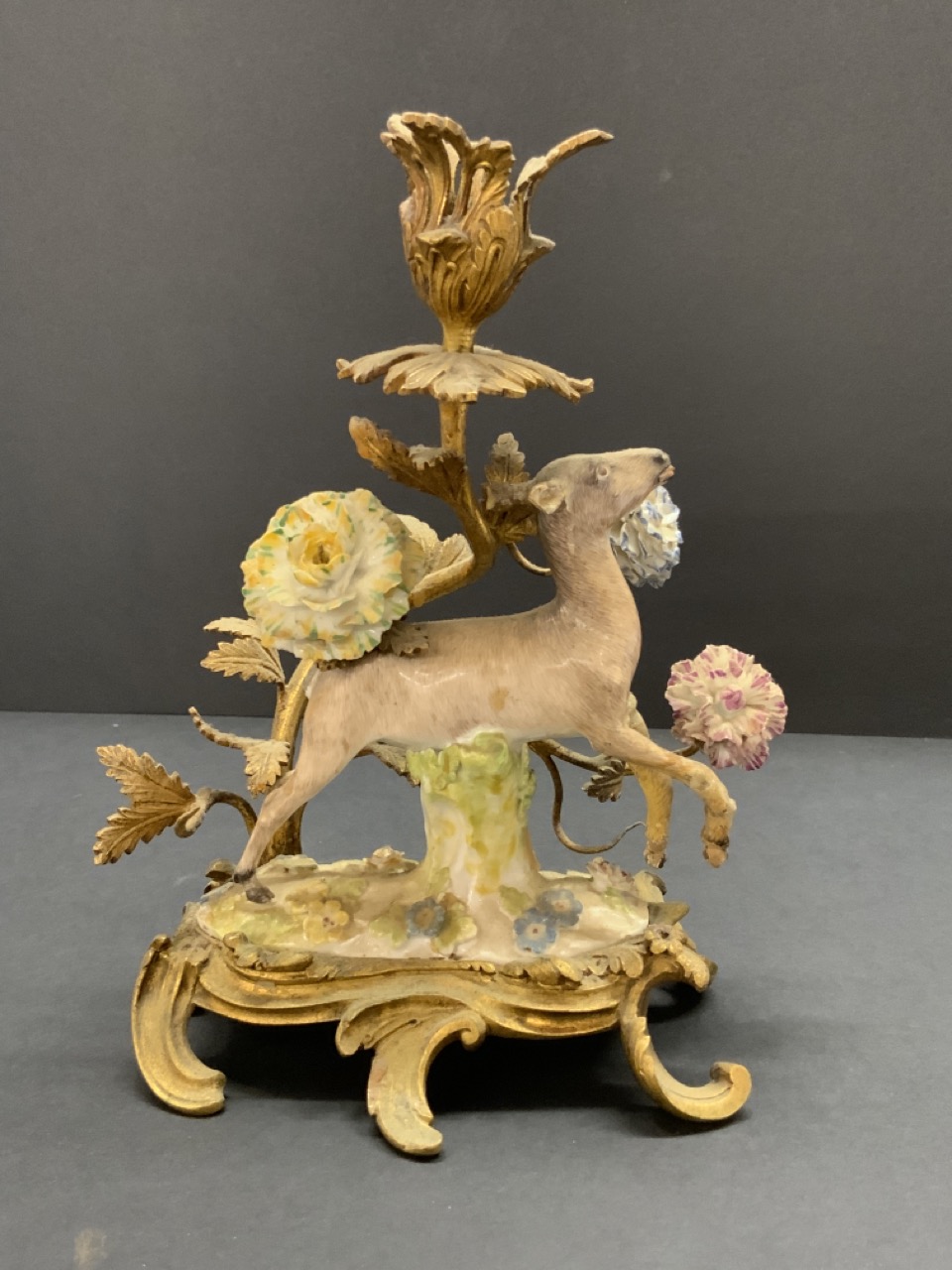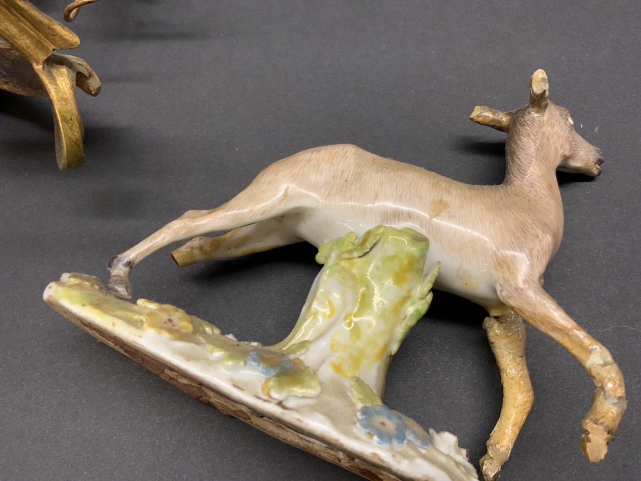 Meissen Deer mounted into bronze candle stick. Severely damaged and in need of extensive repairs. As seen in photograph preview.