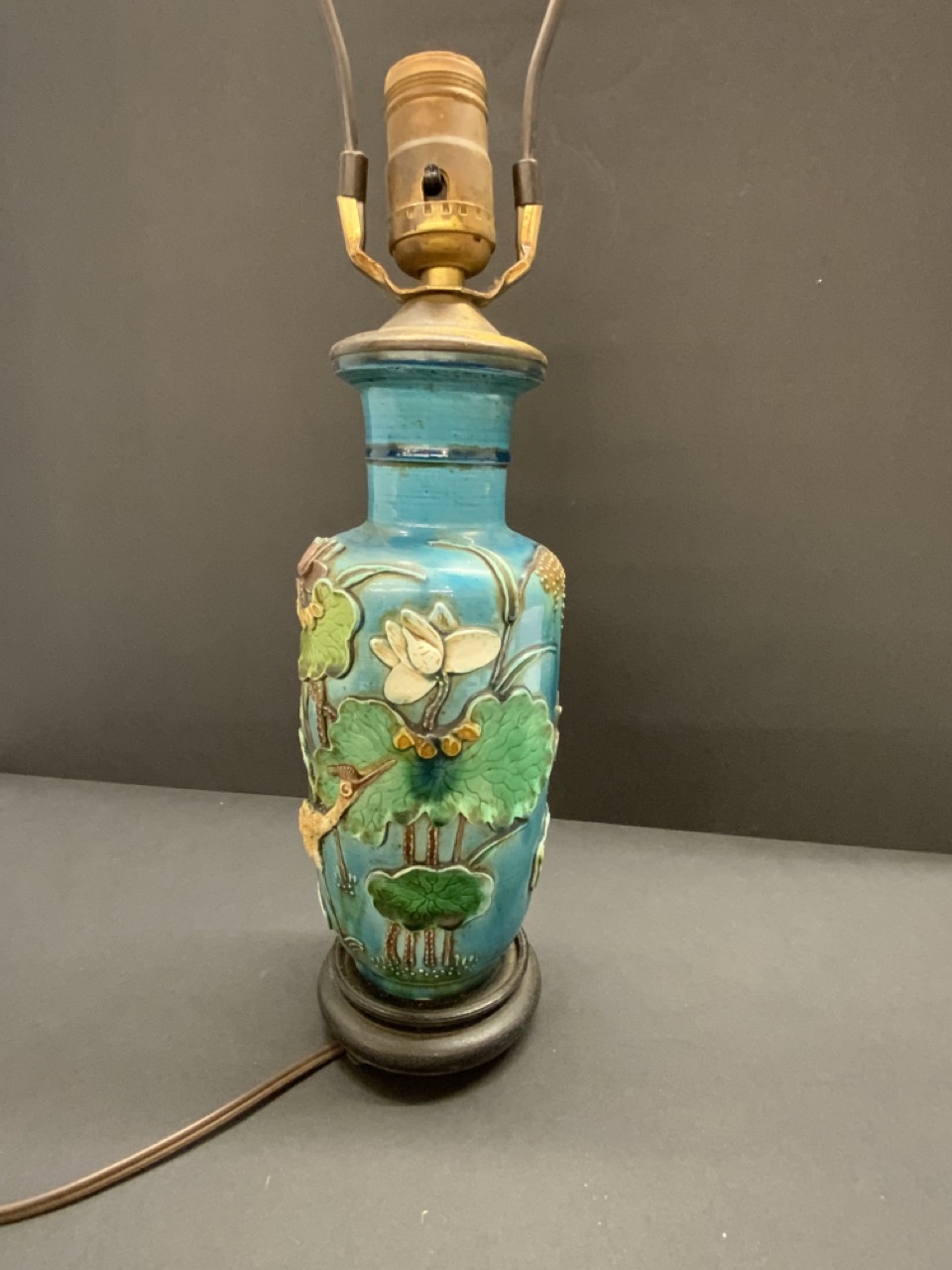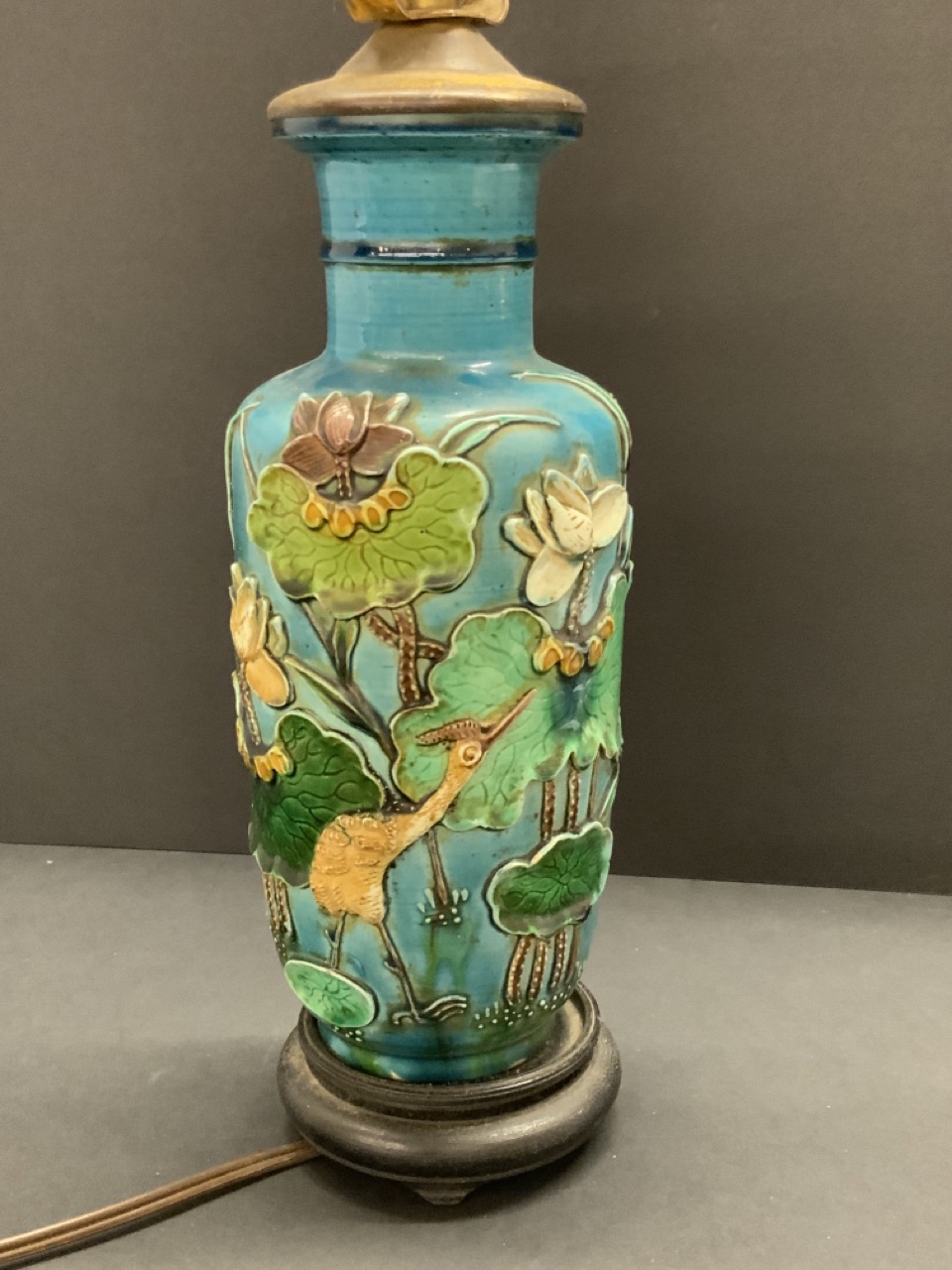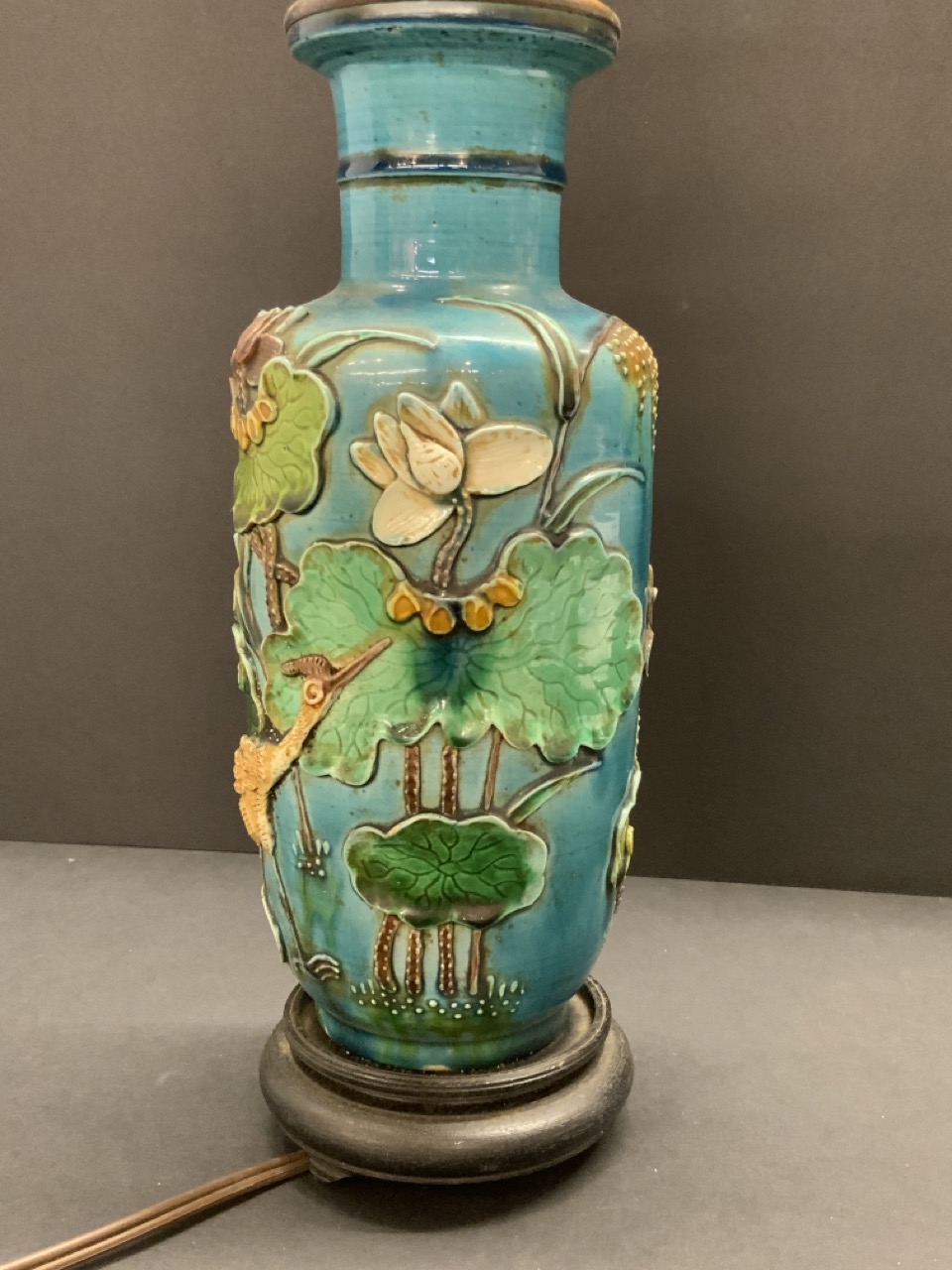19th c. Chinese Turquoise Porcelain Table Vase mounted as table lamp. Heavy porcelain with three dimensional cranes and lily pads.