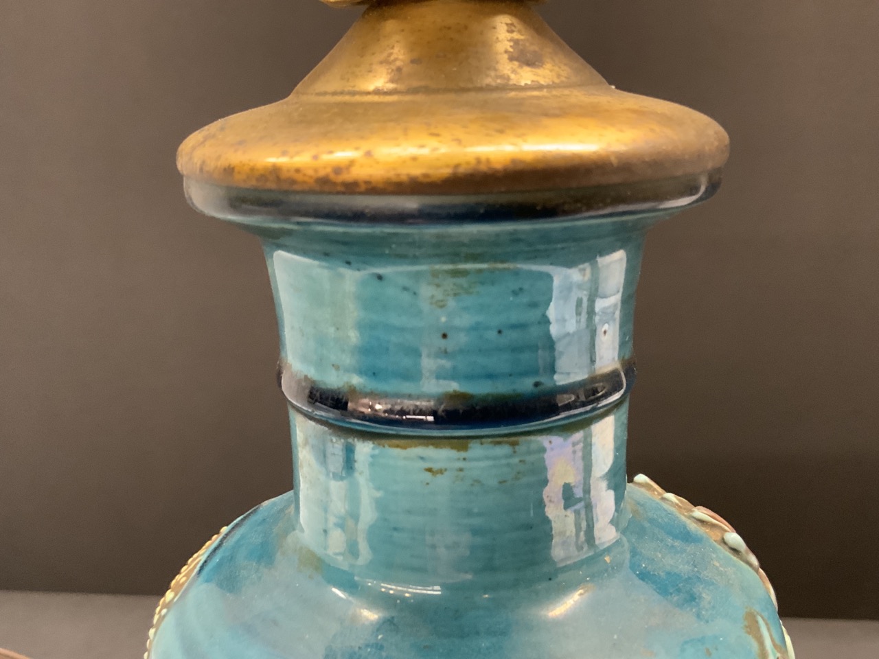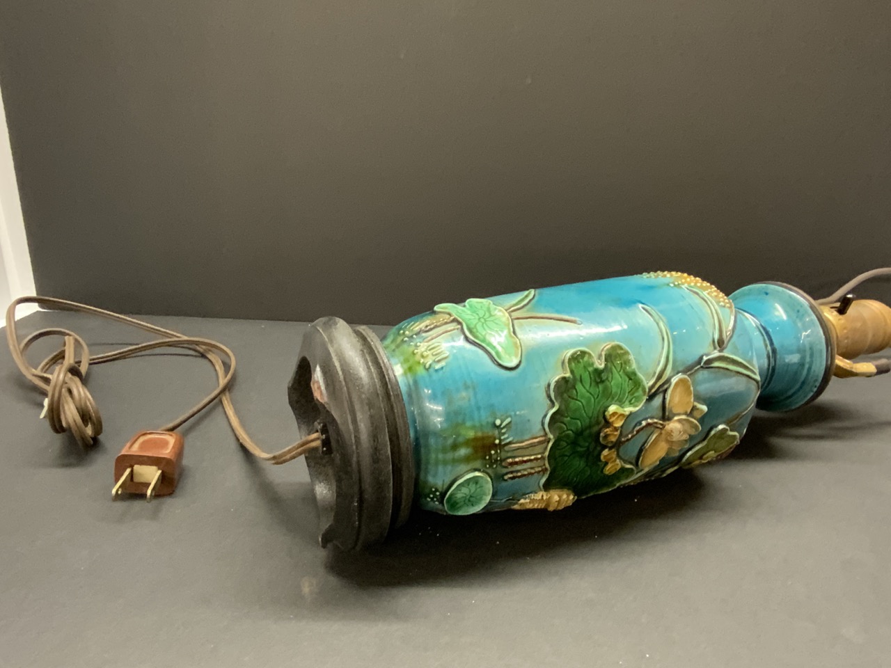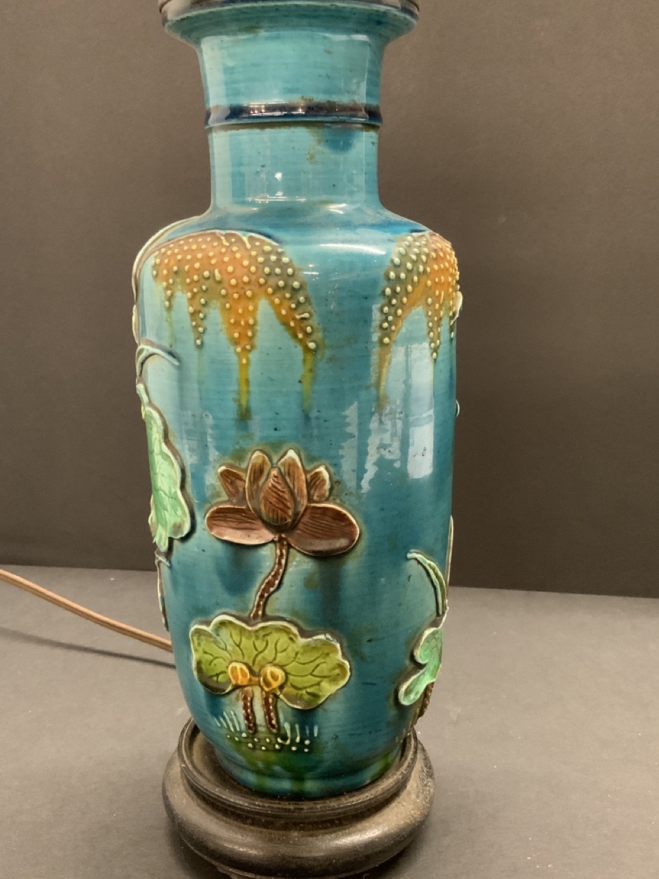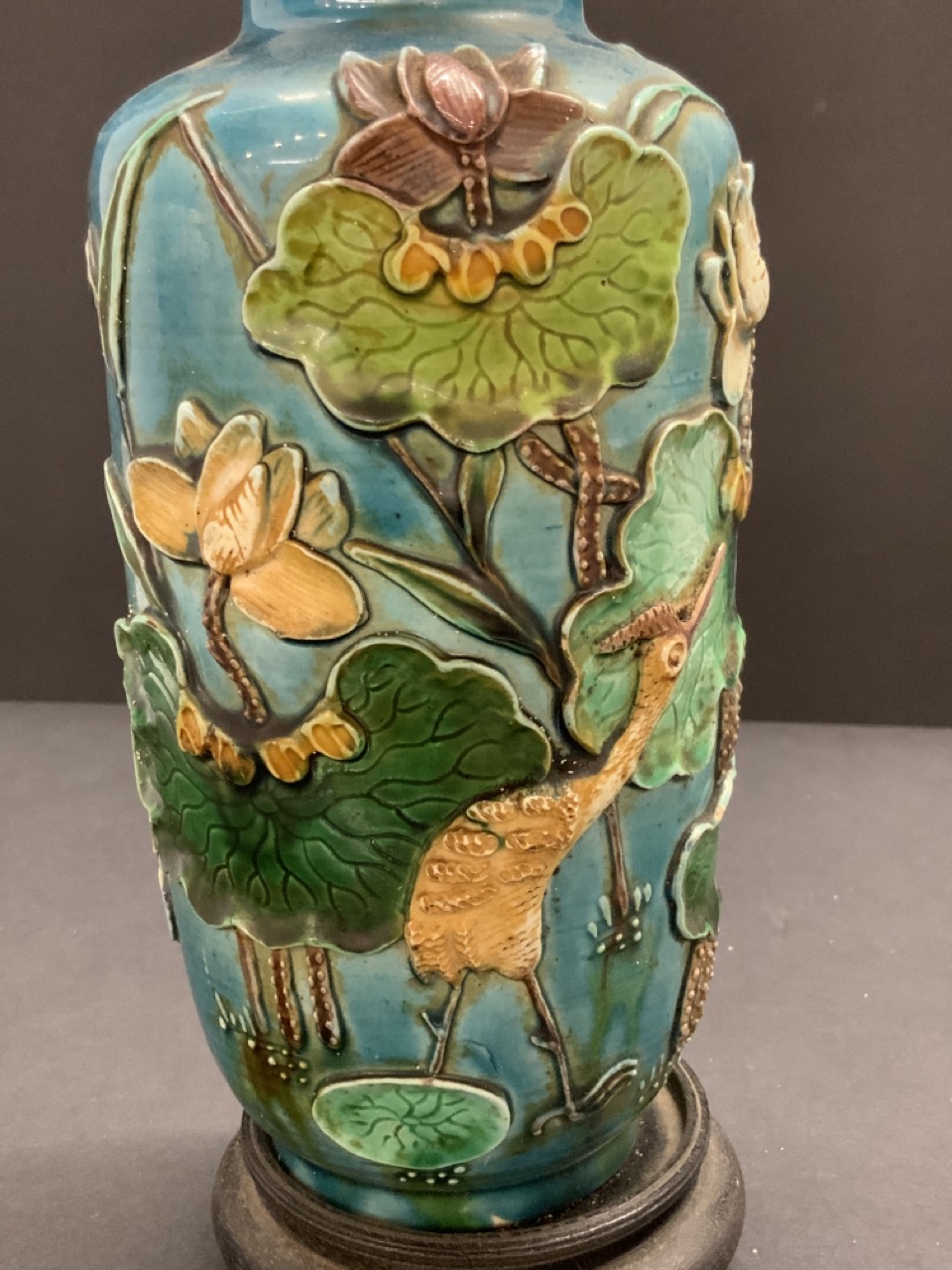 19th c. Chinese Turquoise Porcelain Table Vase mounted as table lamp. Heavy porcelain with three dimensional cranes and lily pads.