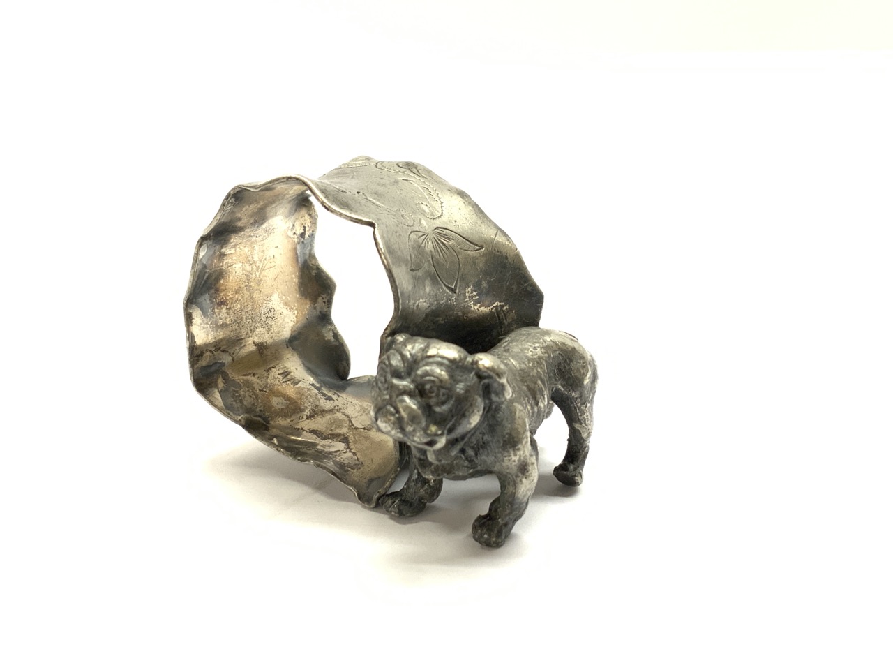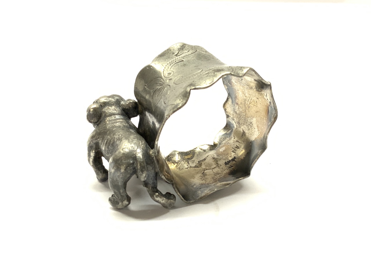 An antique silver plated bulldog napking ring.