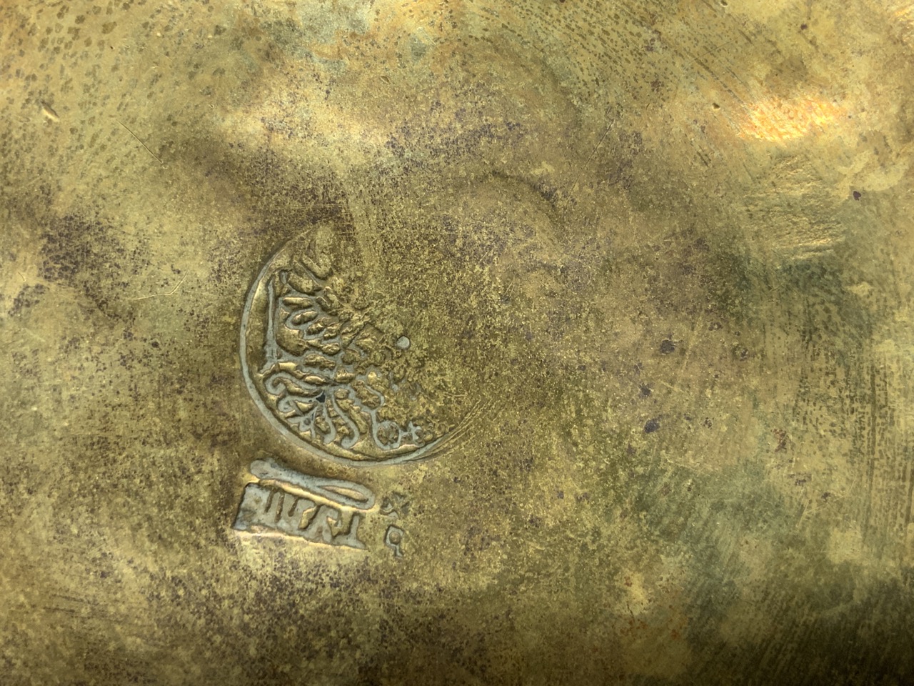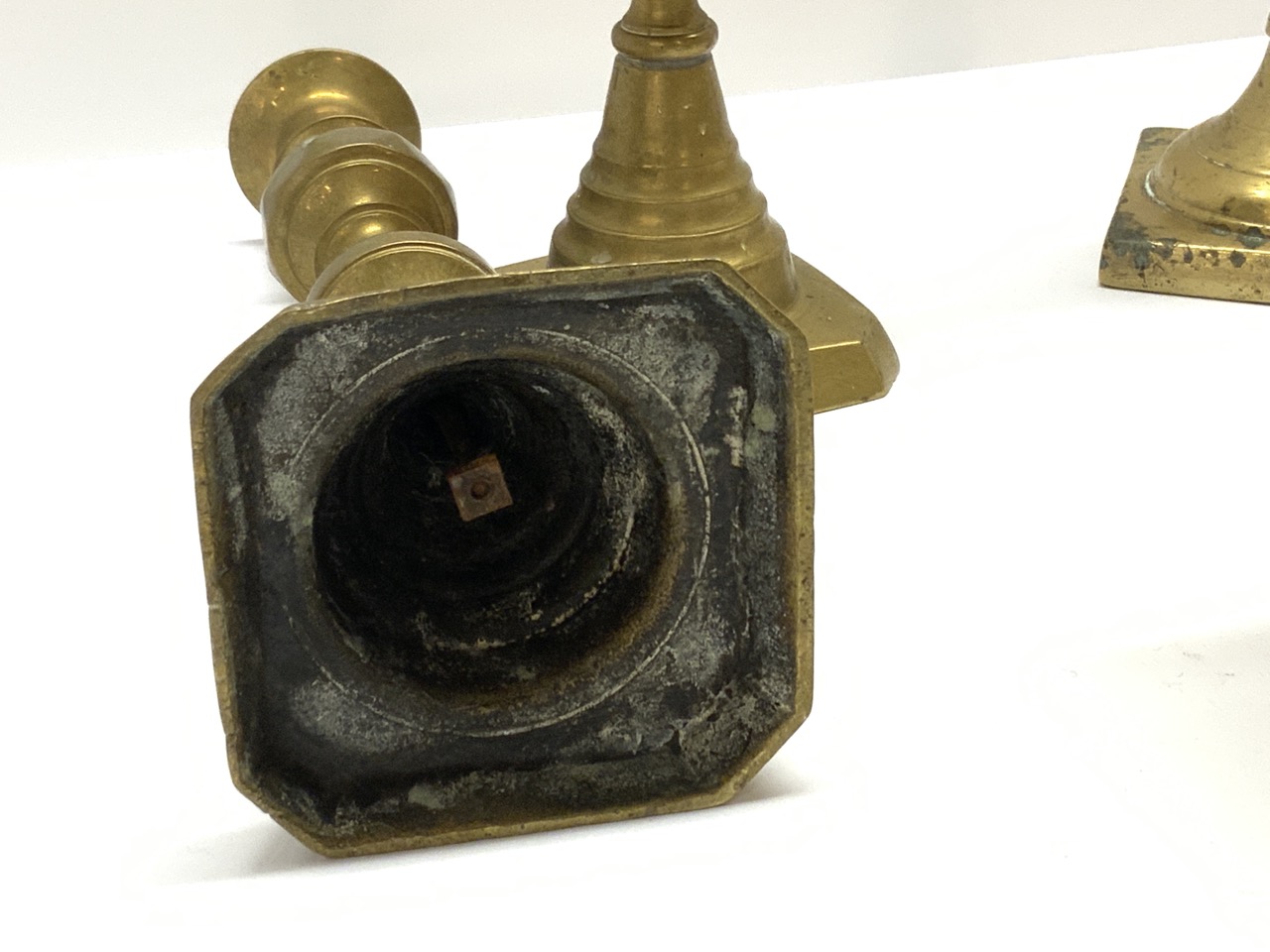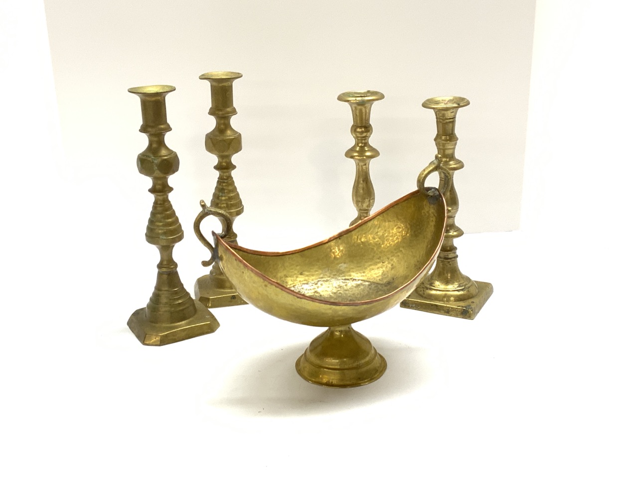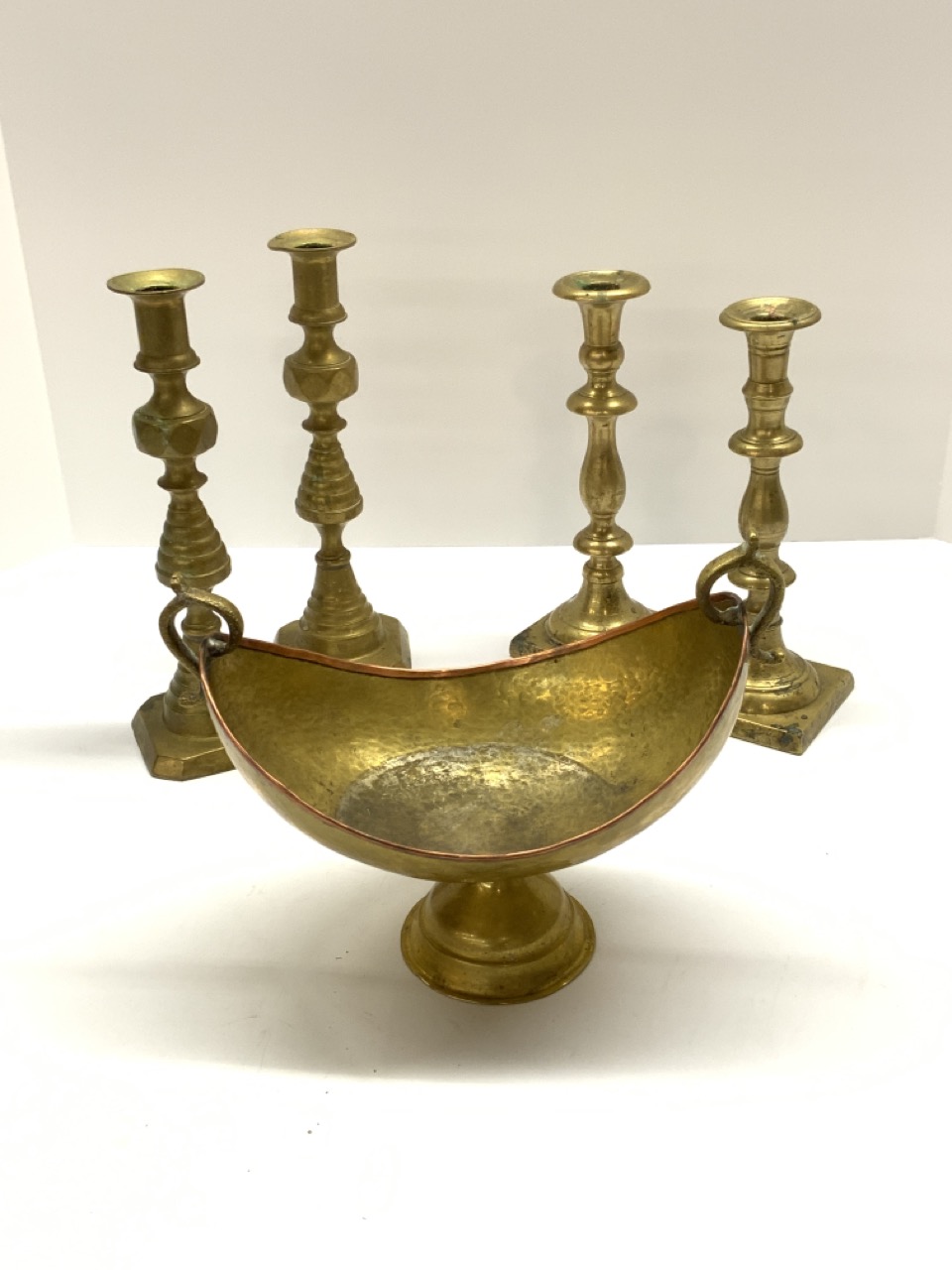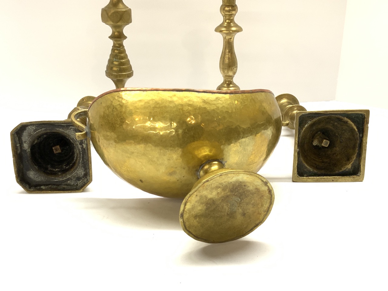 Russian brass with copper trim antique console bowl and two (2) pairs of antique brass push up candlesticks.