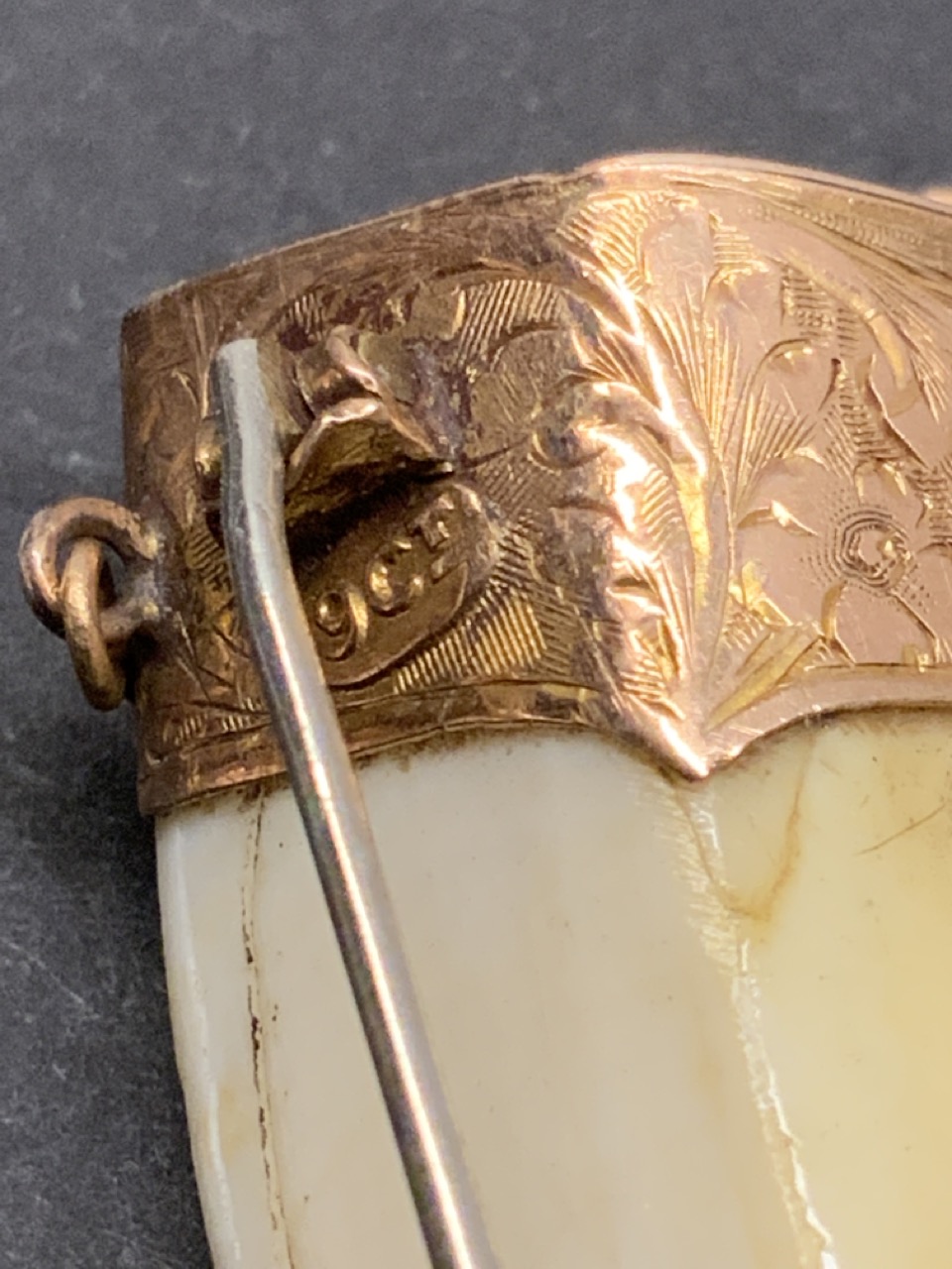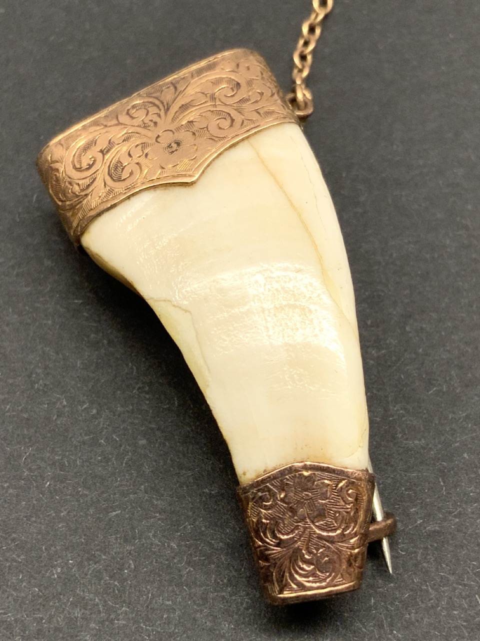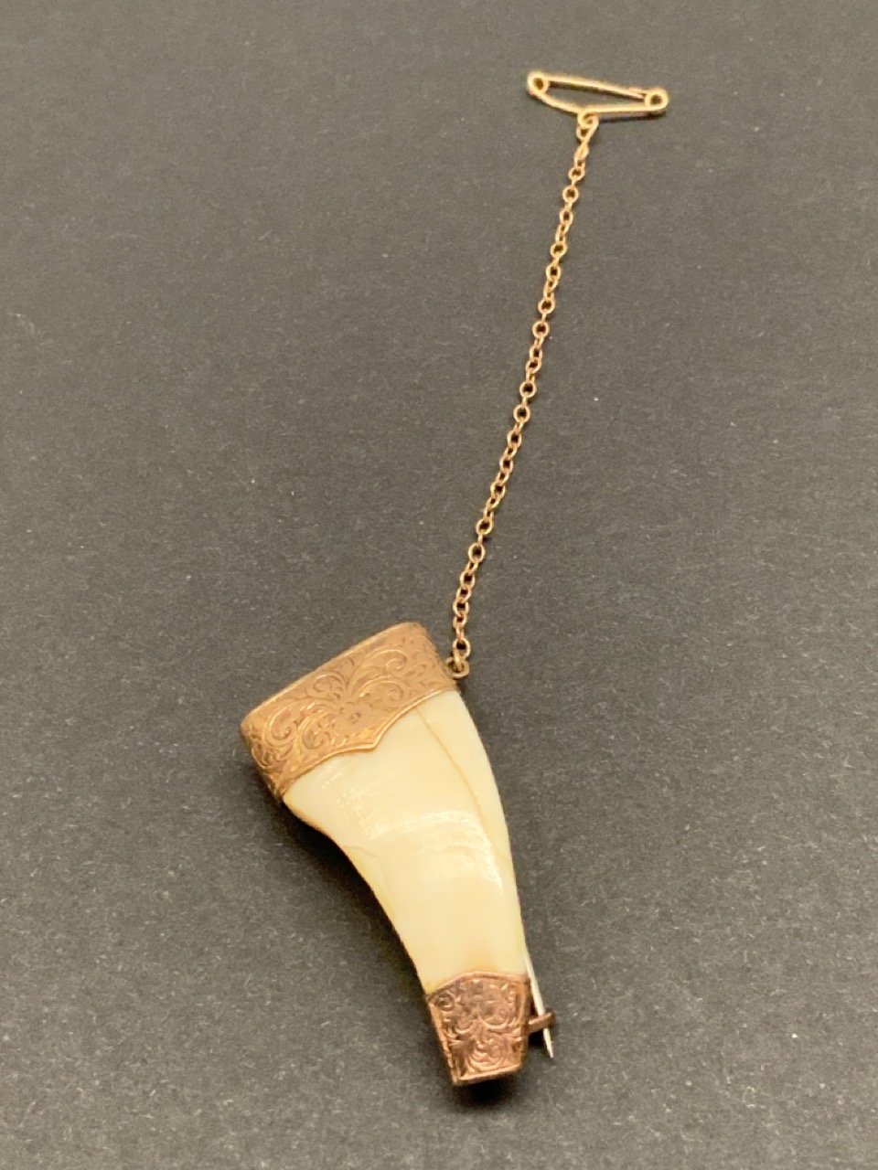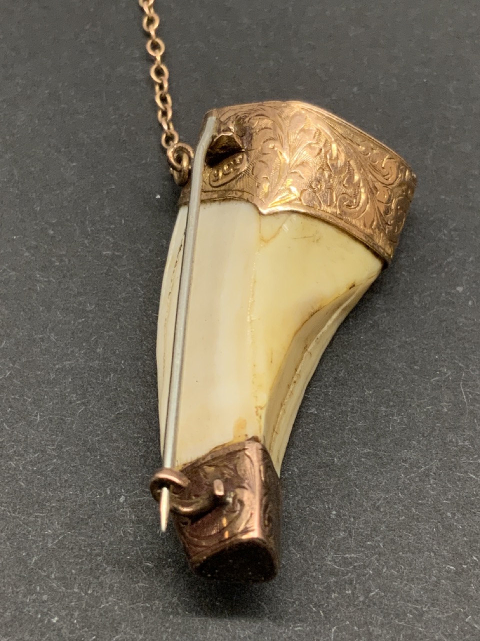 An antique 9ct. gold tooth pendant