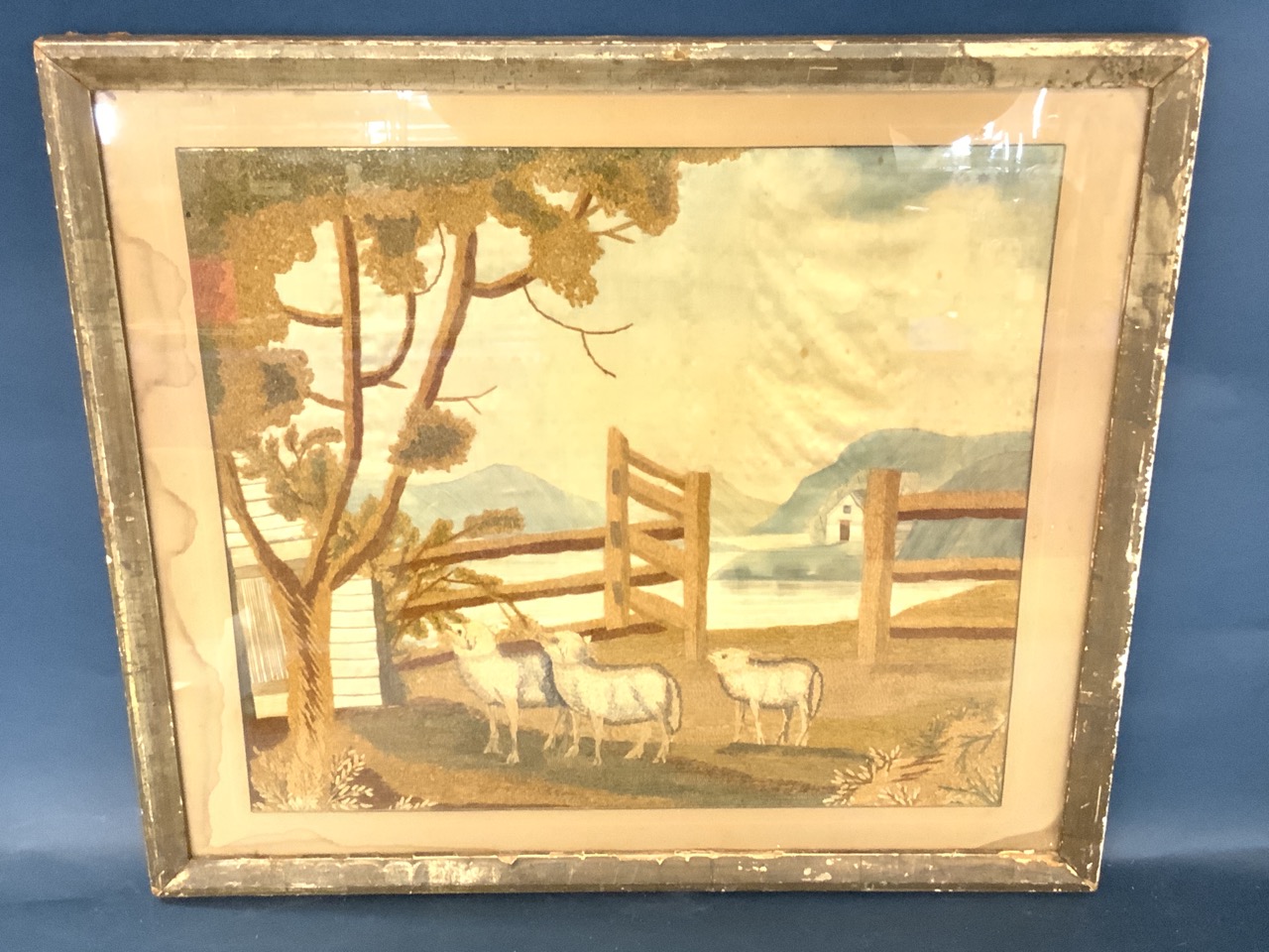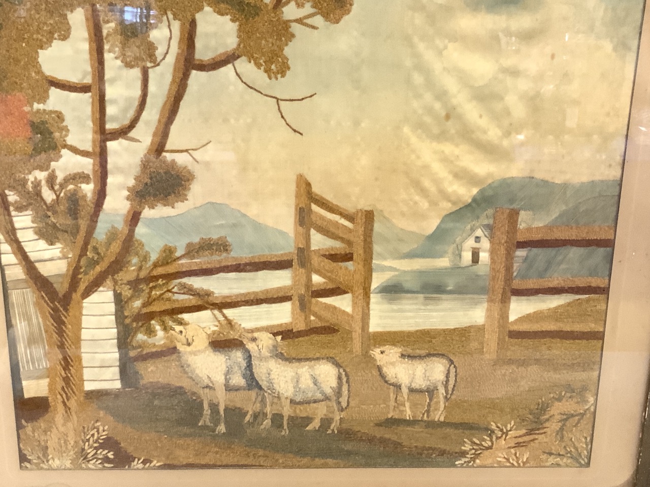 19th c. American Woolwork Sheep In Barnyard Landscape. Woolwork is good. Framing and outer matte material has old water damage.