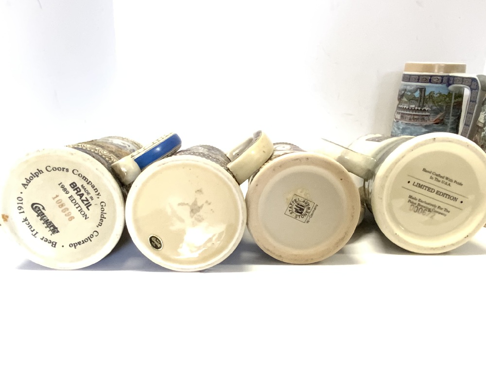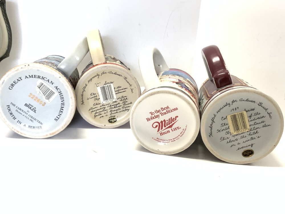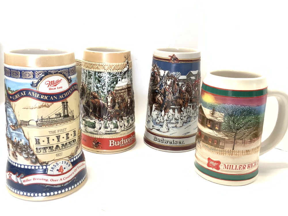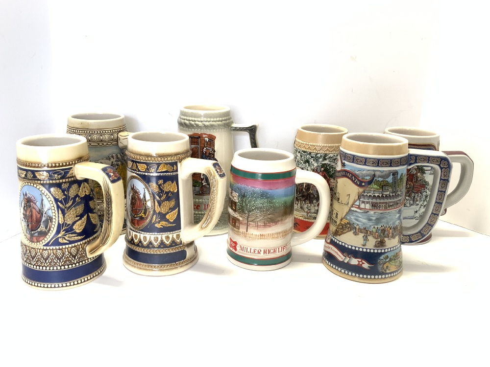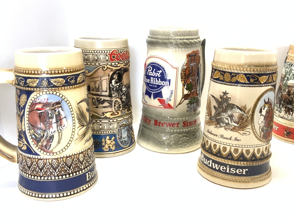 8 Beer Steins branded with Coors, Millers, Pabst Blue Ribbon, and Budweiser.