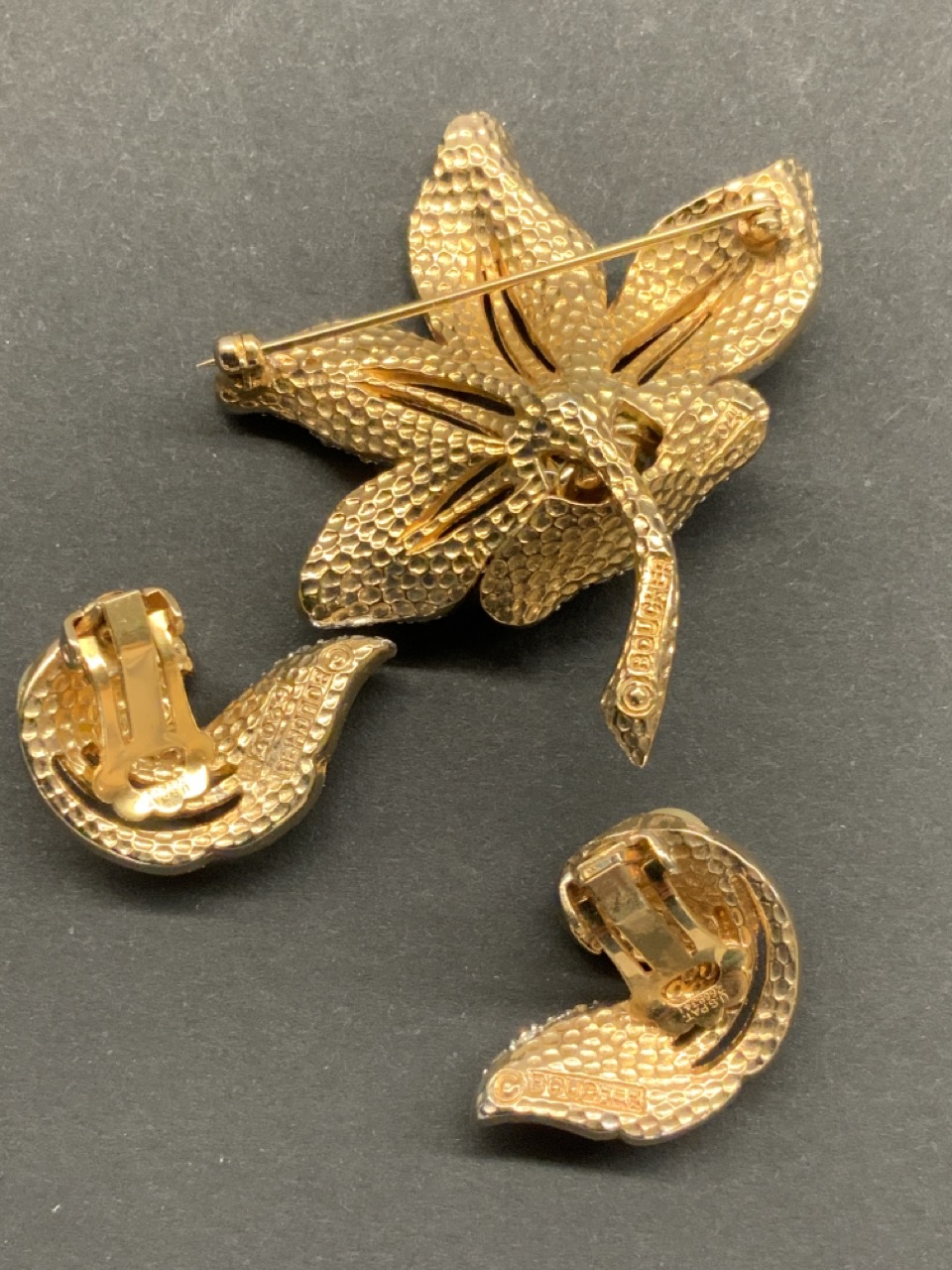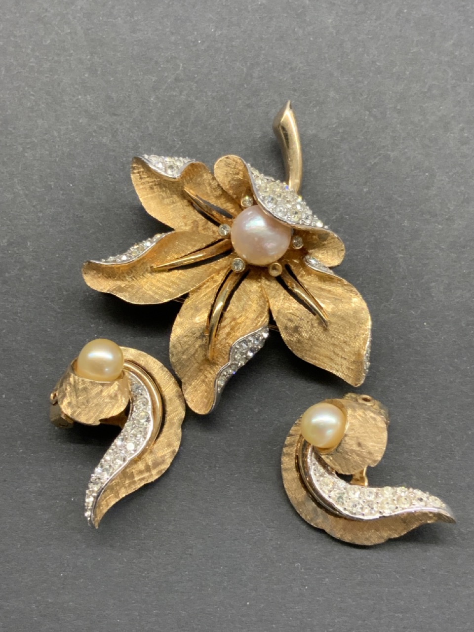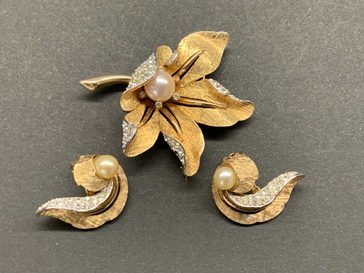 A vintage Marcel Boucher goldtone brooch and earrings set. Brushed gold with rhinestones and faux pearls. Signed Boucher.