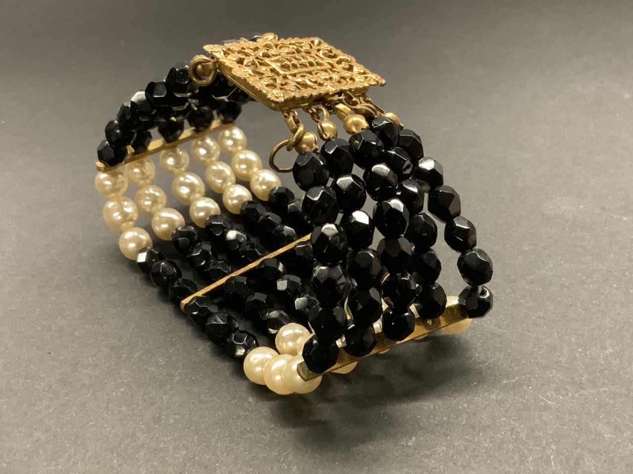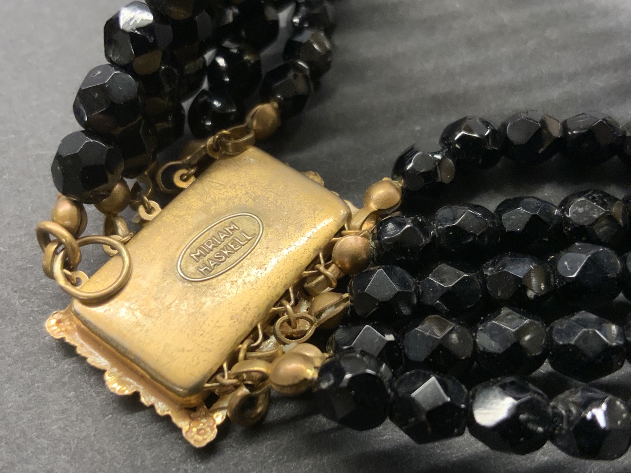 A Miriam Haskell jet glass and faux pearl five strand bracelet with metal clasp. Signed on clasp.