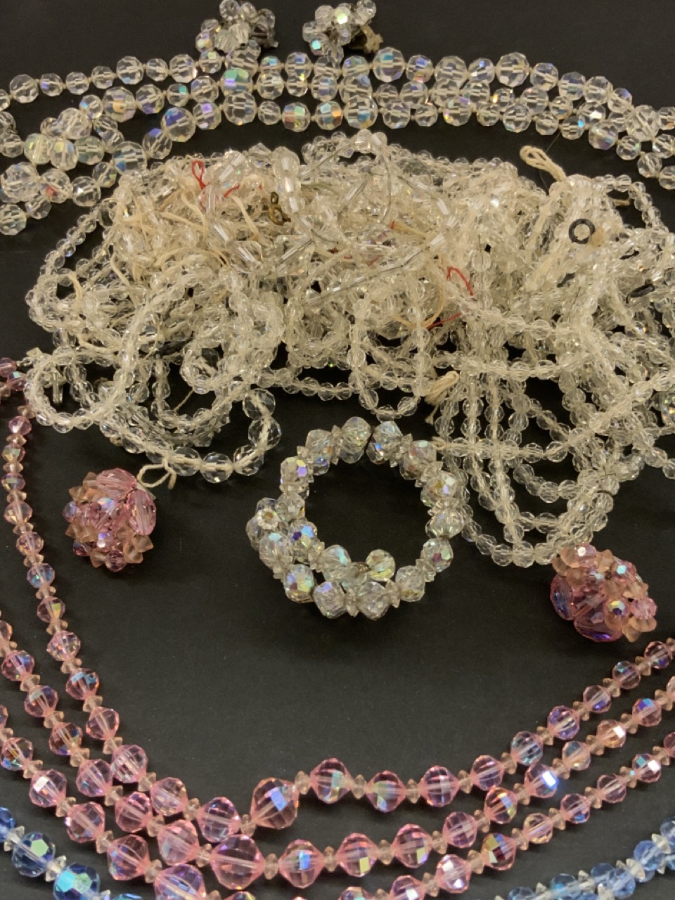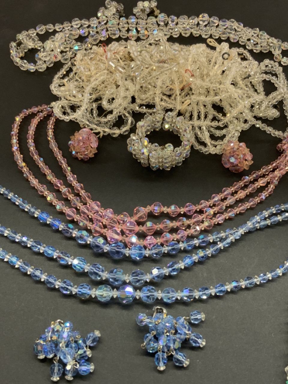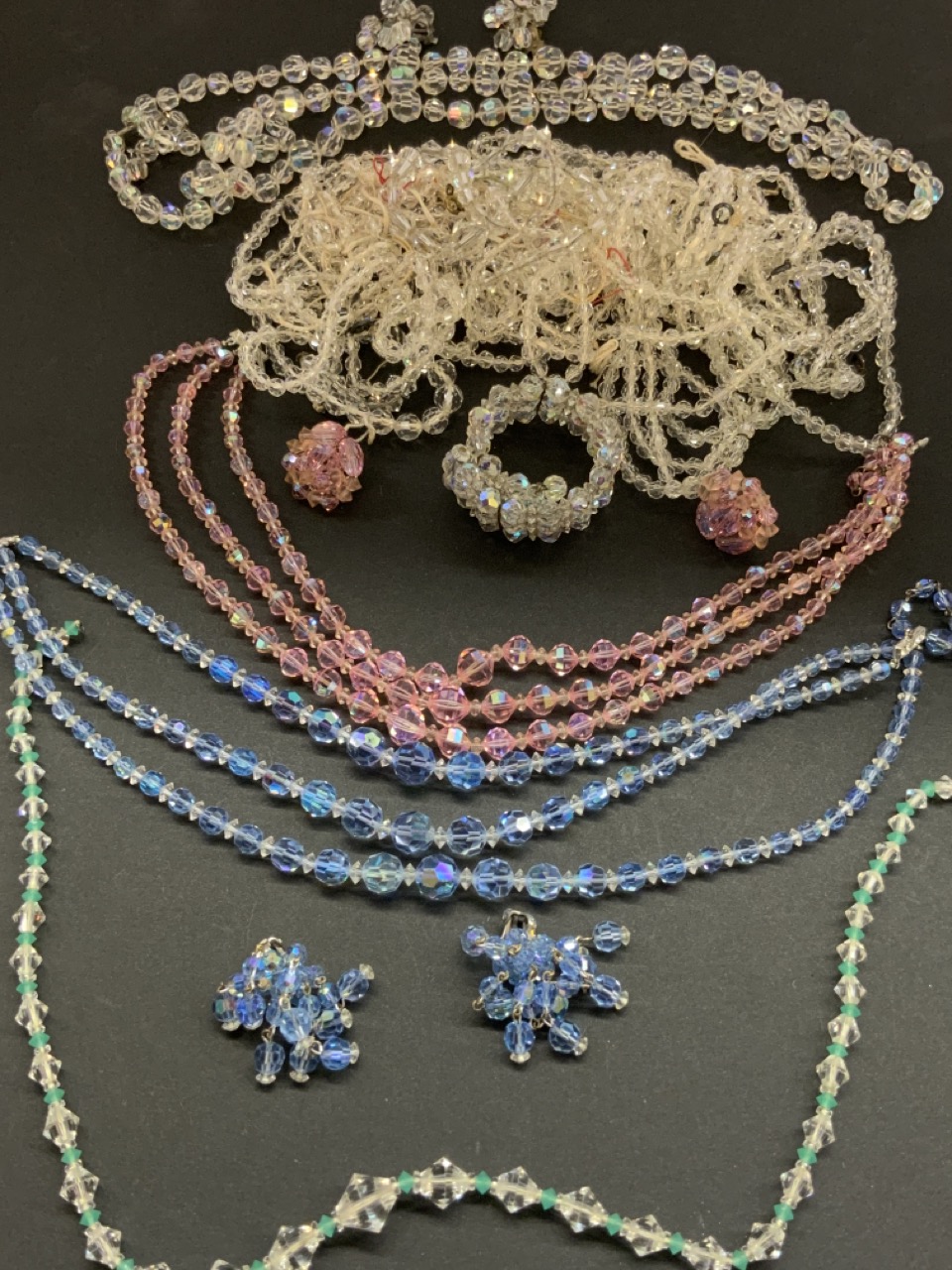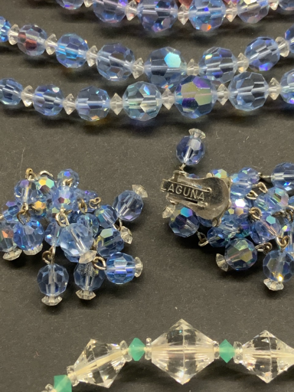 Compiled estate Austrian crystal costume jewelry. All vintage. Blue necklace and earring set signed Laguna. Please see photograph preview or call.