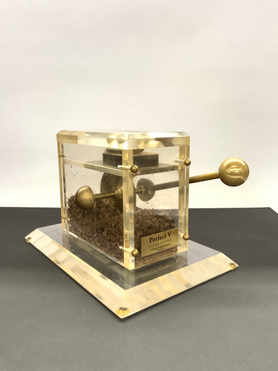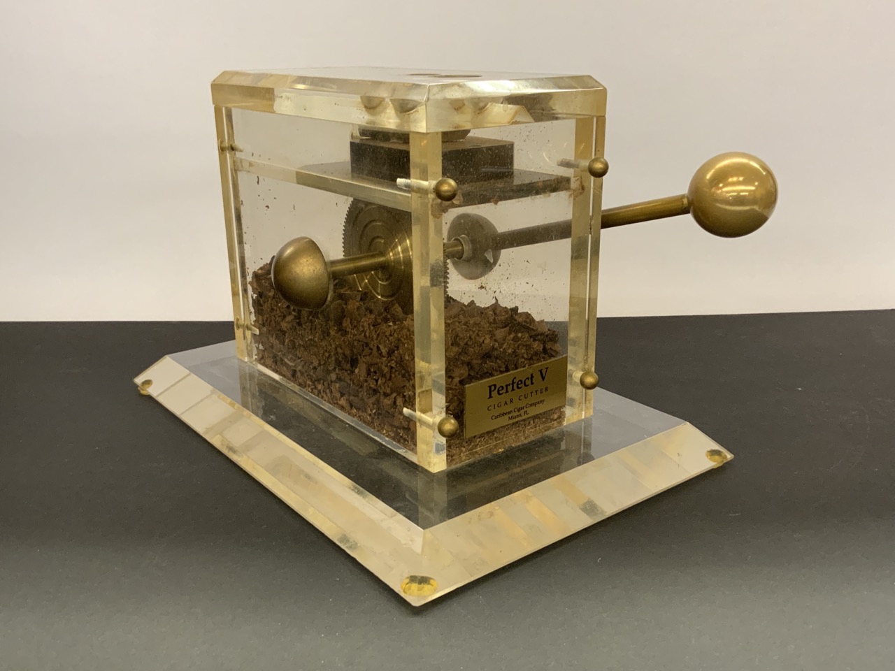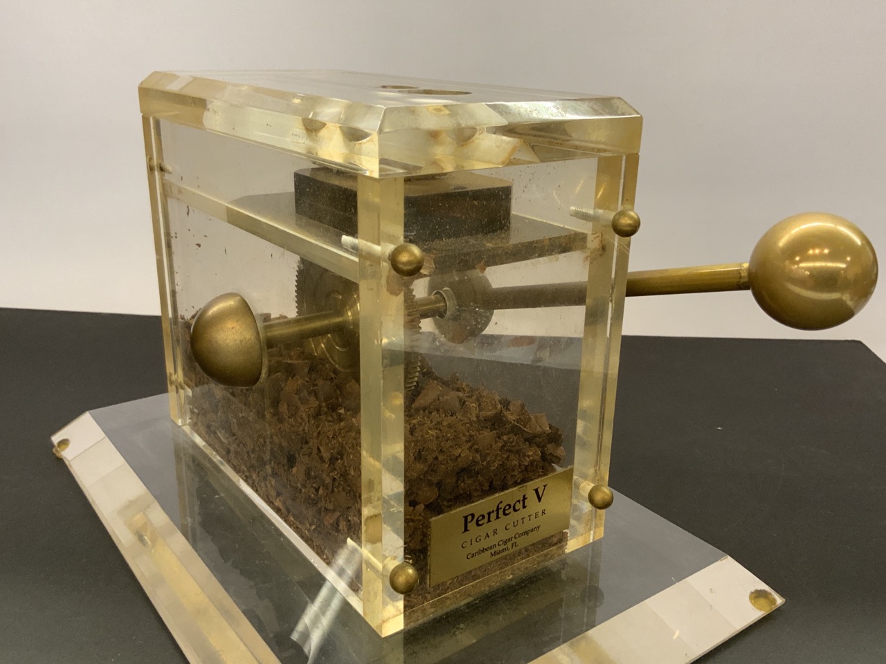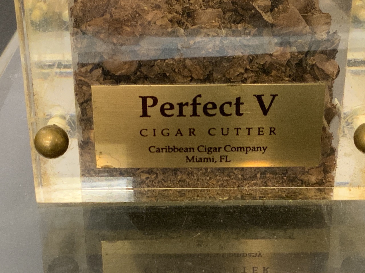 Plaque at front reads “Perfect V Cigar Cutter Caribbean Cigar Company Miami, FL”