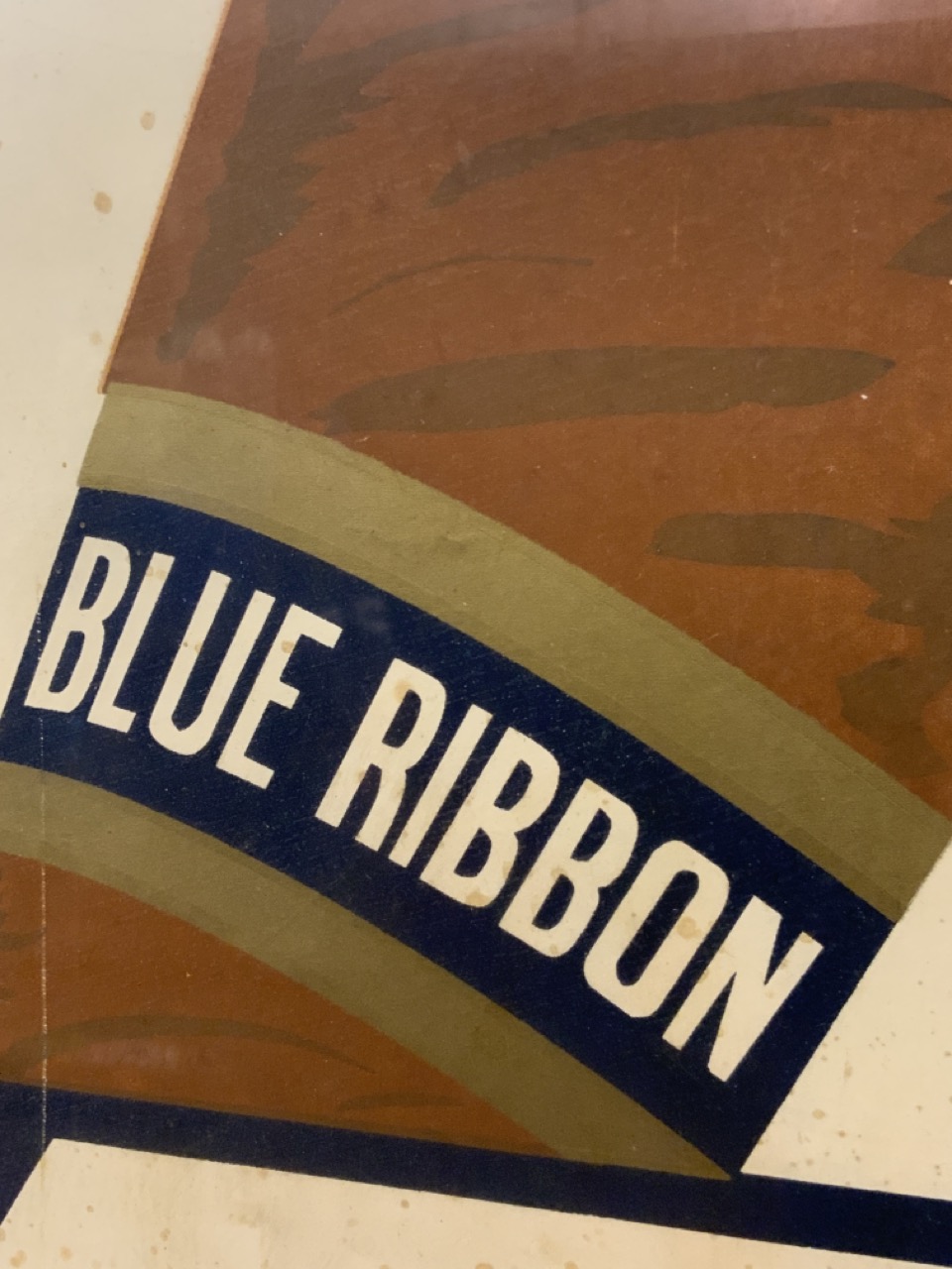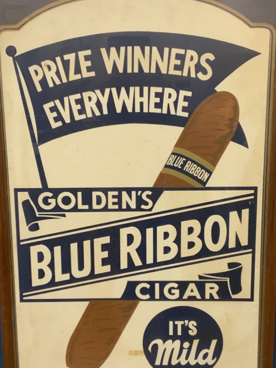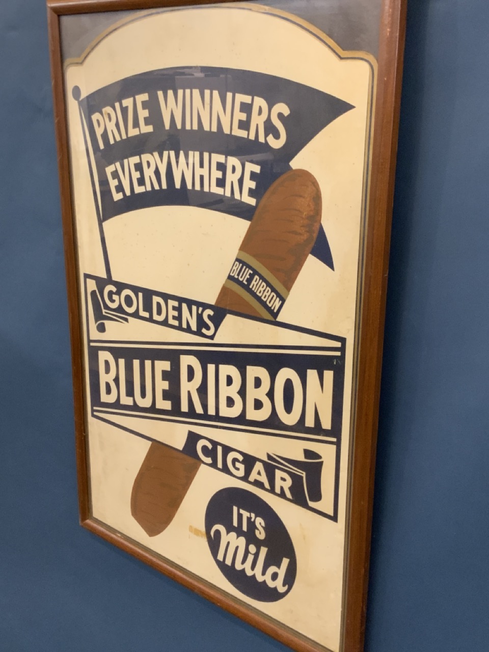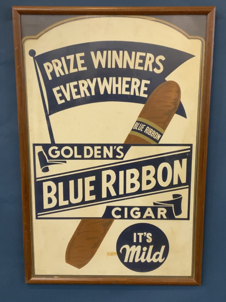 Golden’s Blue Ribbon Cigar “Prize Winners Everywhere” “It’s Mild” Thick cardboard sign. Framed in hardwood frame. Some foxing noted. Please see photograph preview or call.