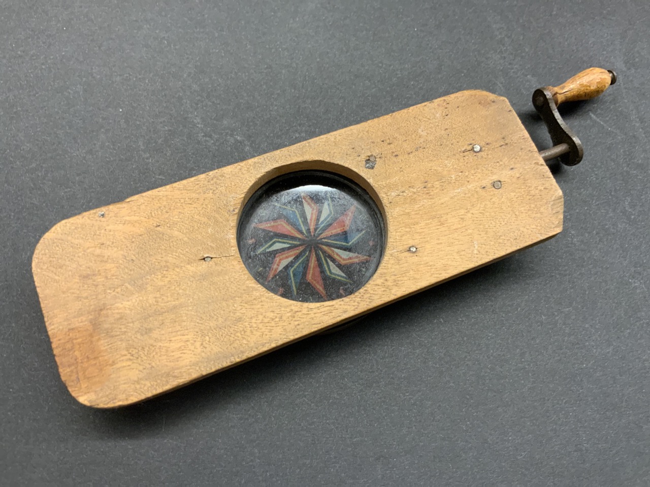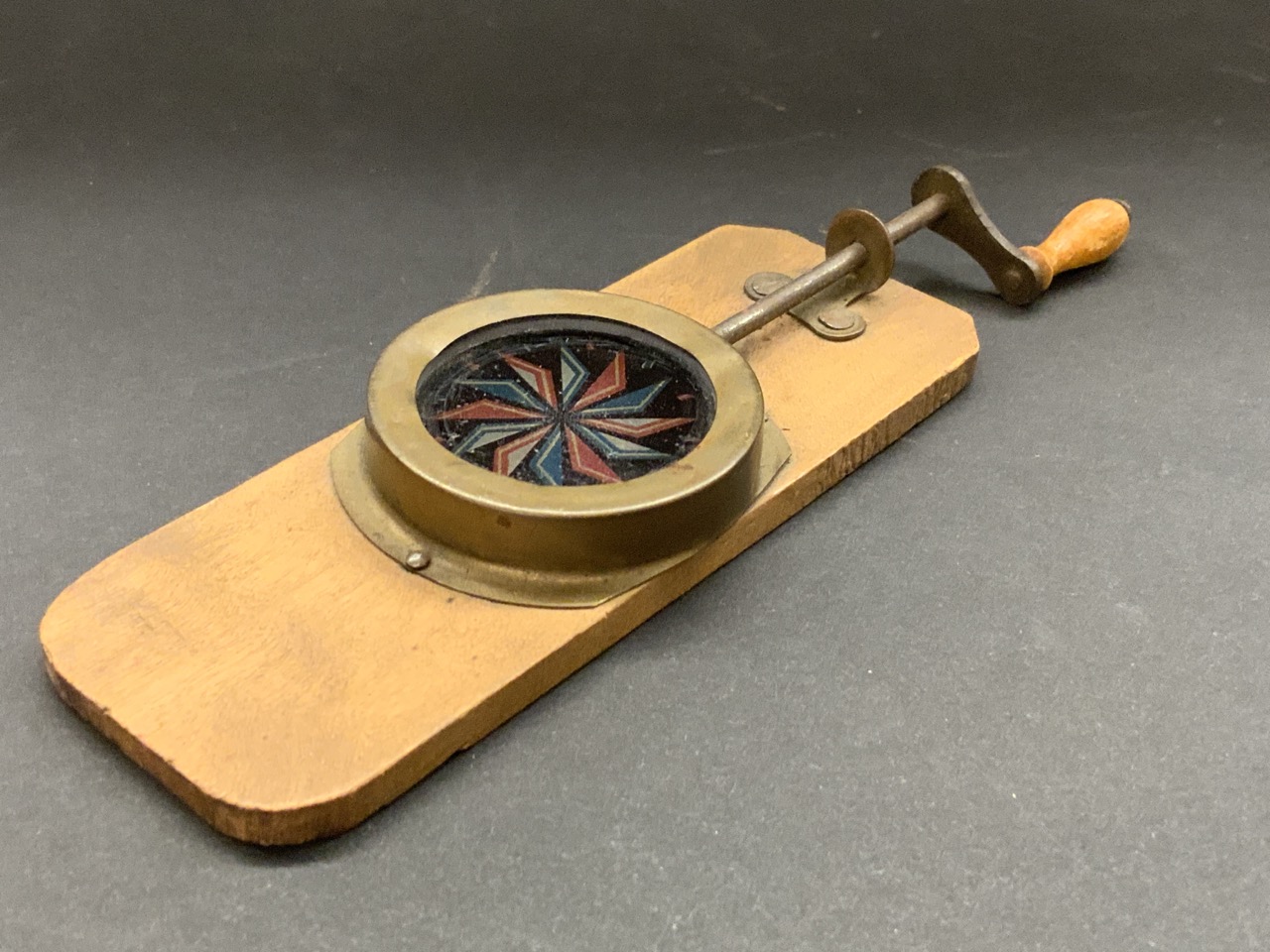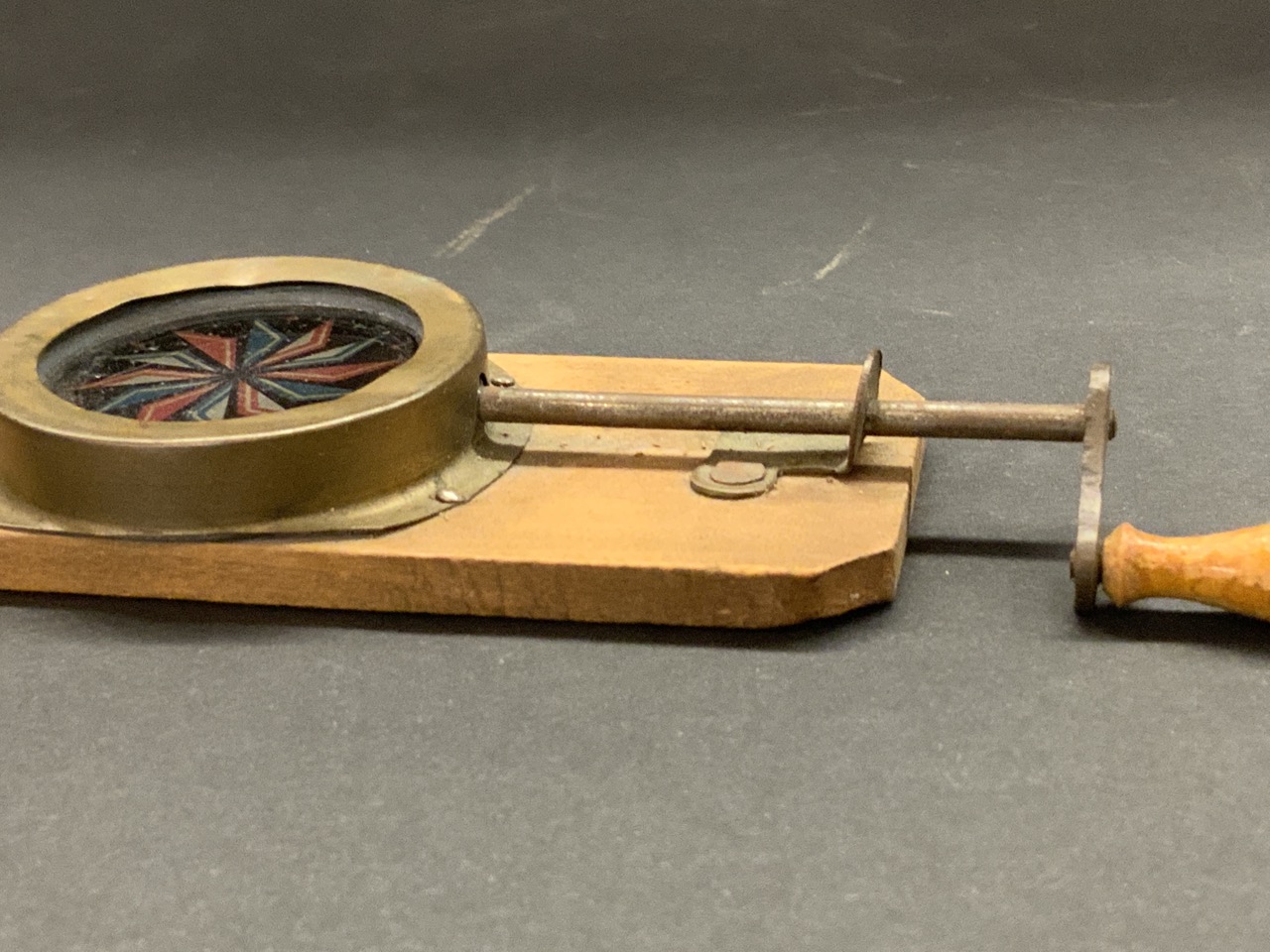 A late 19th c. Desk top or pocket size kaleidoscope. A simple turning arm mounted into pine wood board.