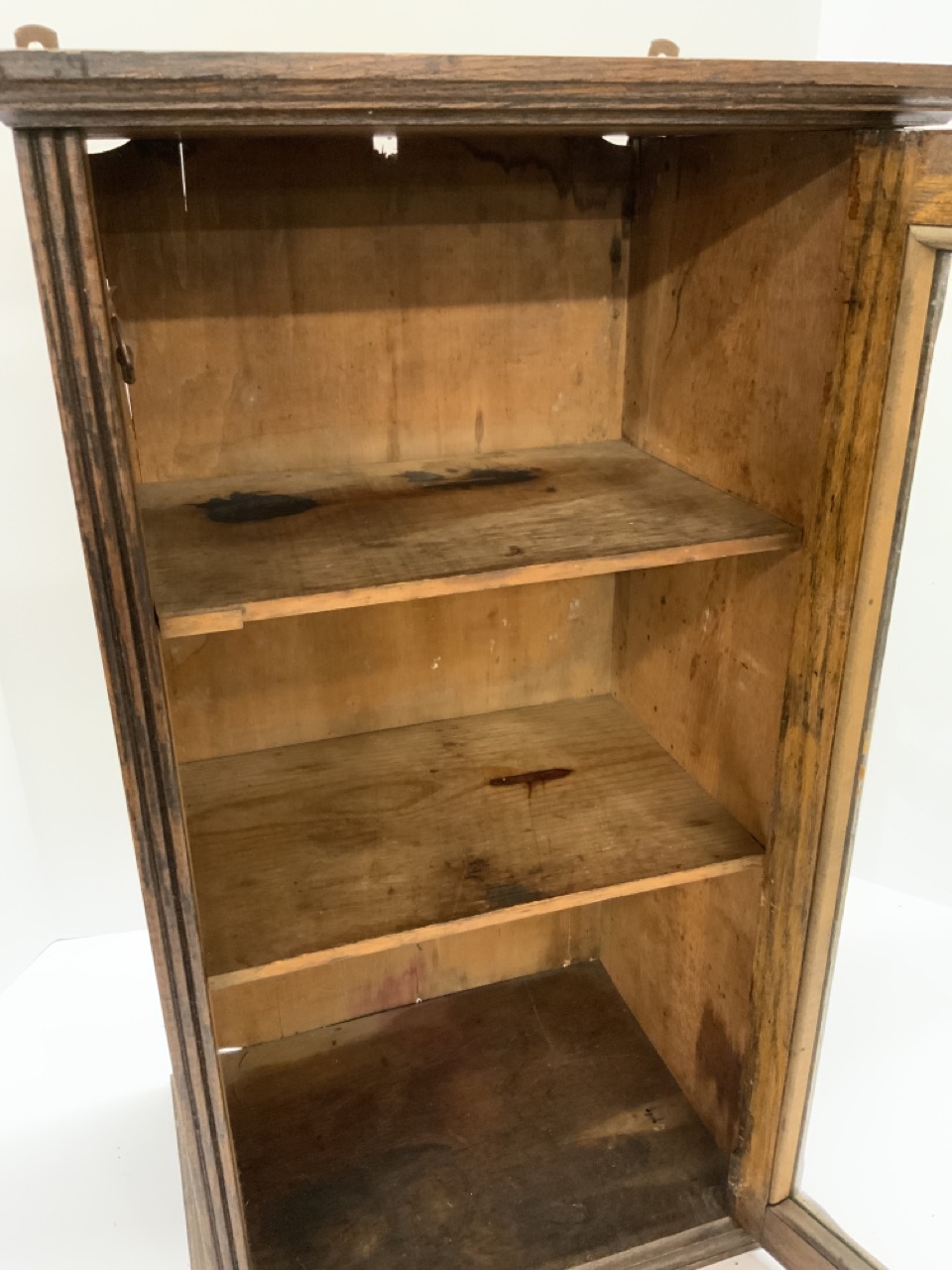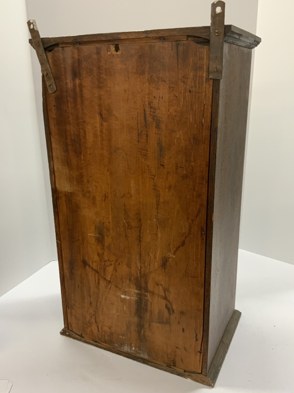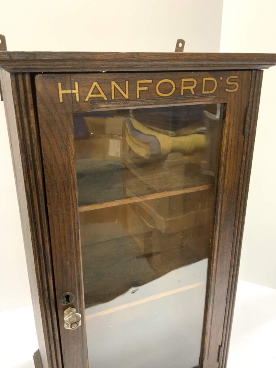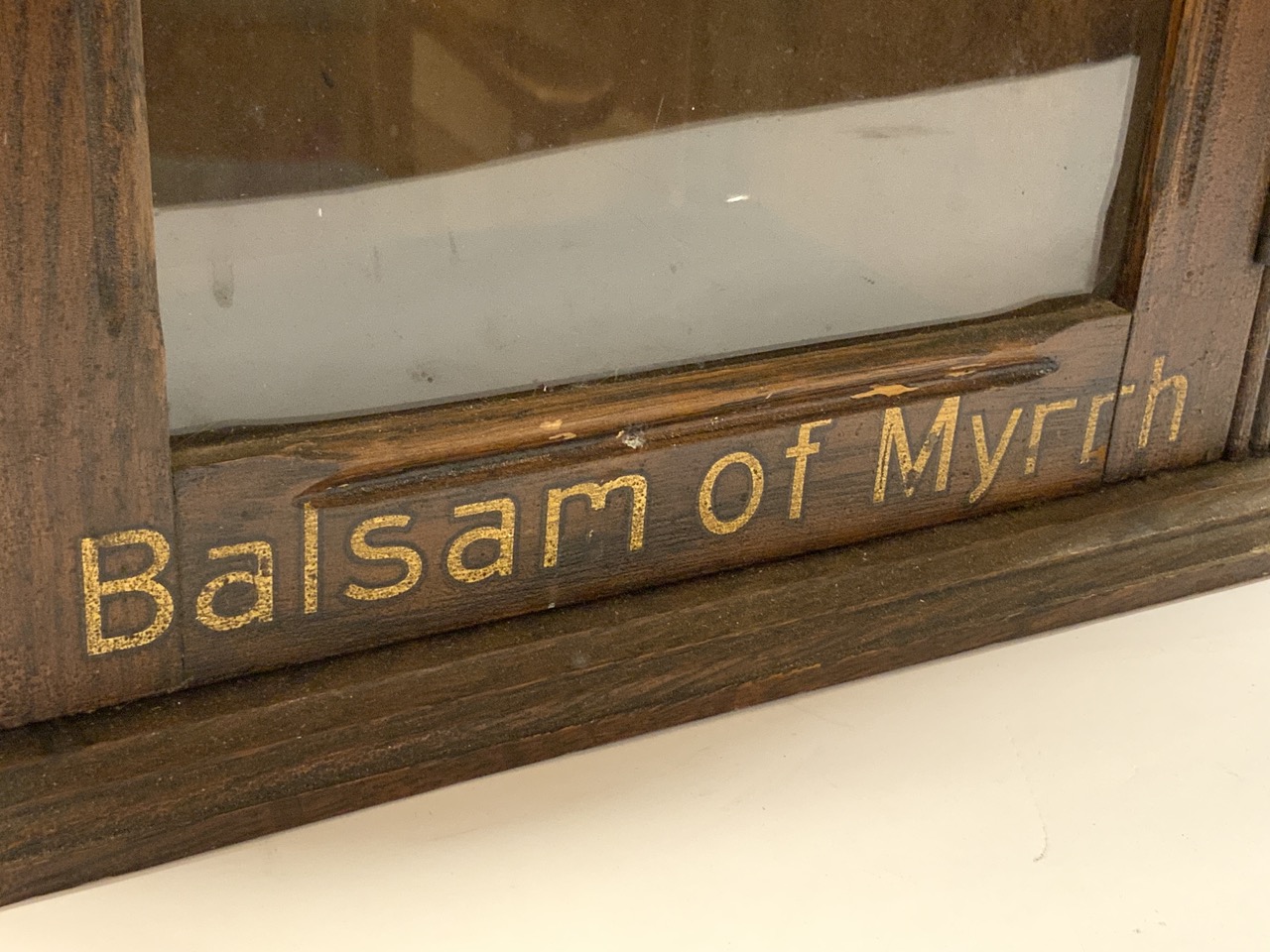 Hanford’s “Balsam Of Myrrh” original oak display cabinet. Counter top or wall hanging.
