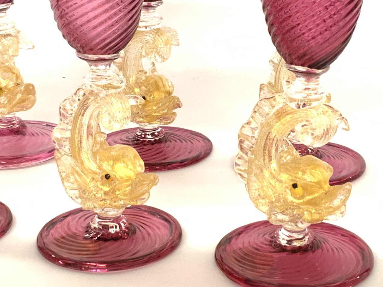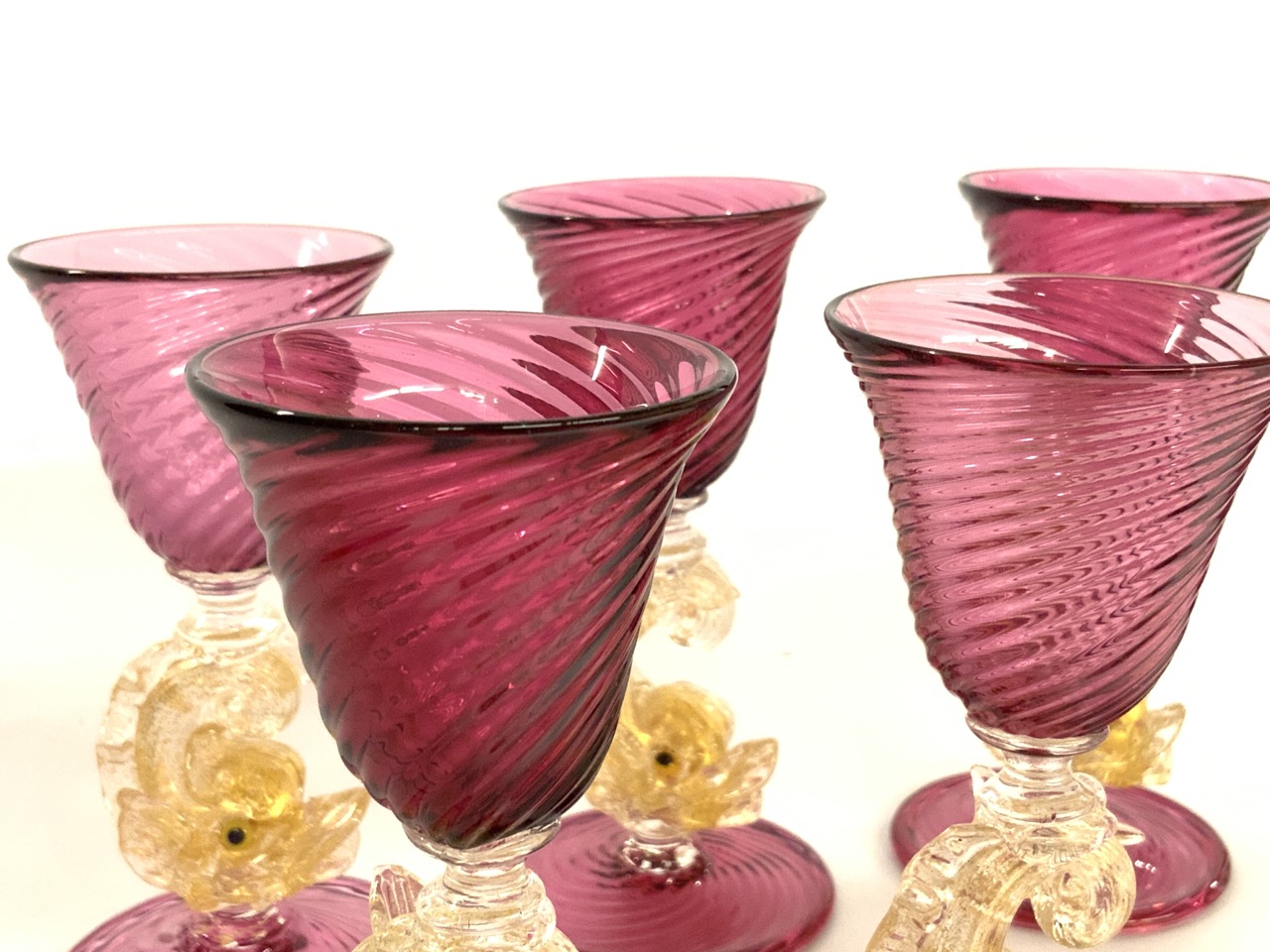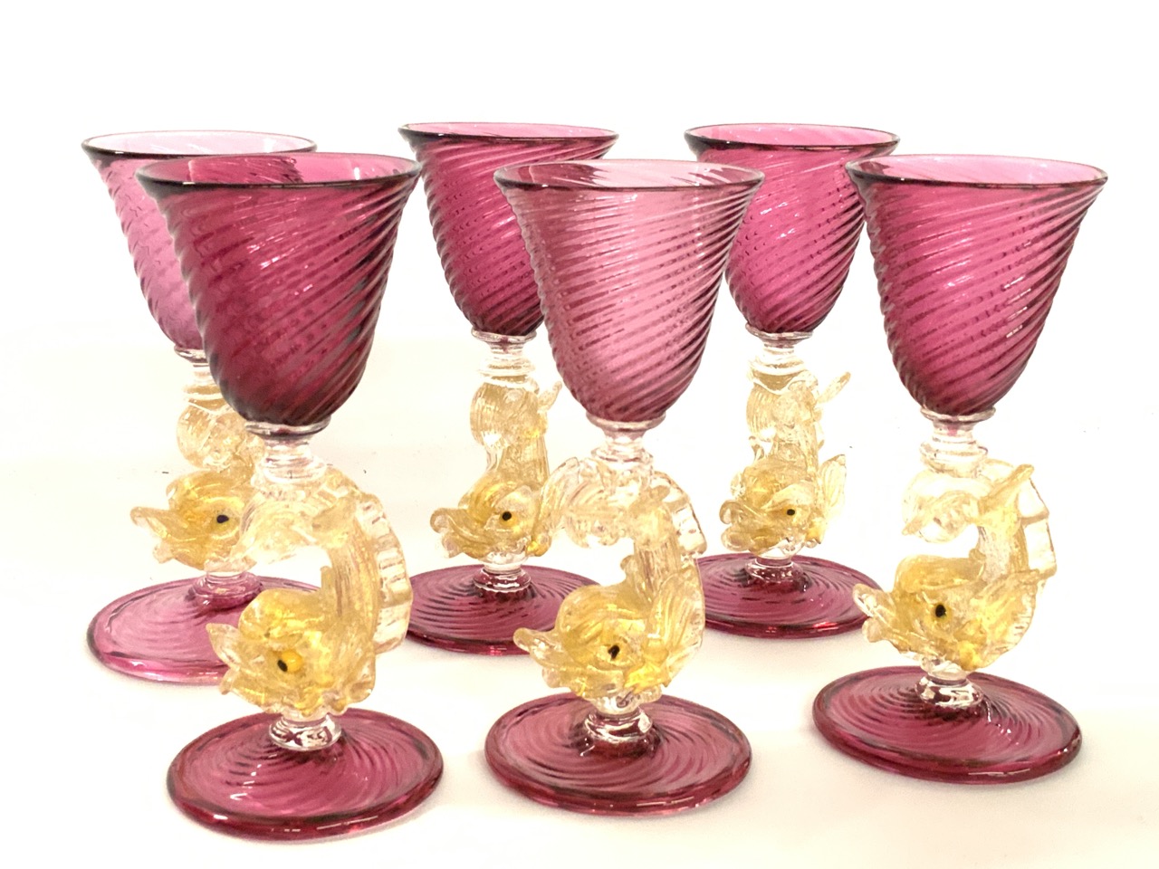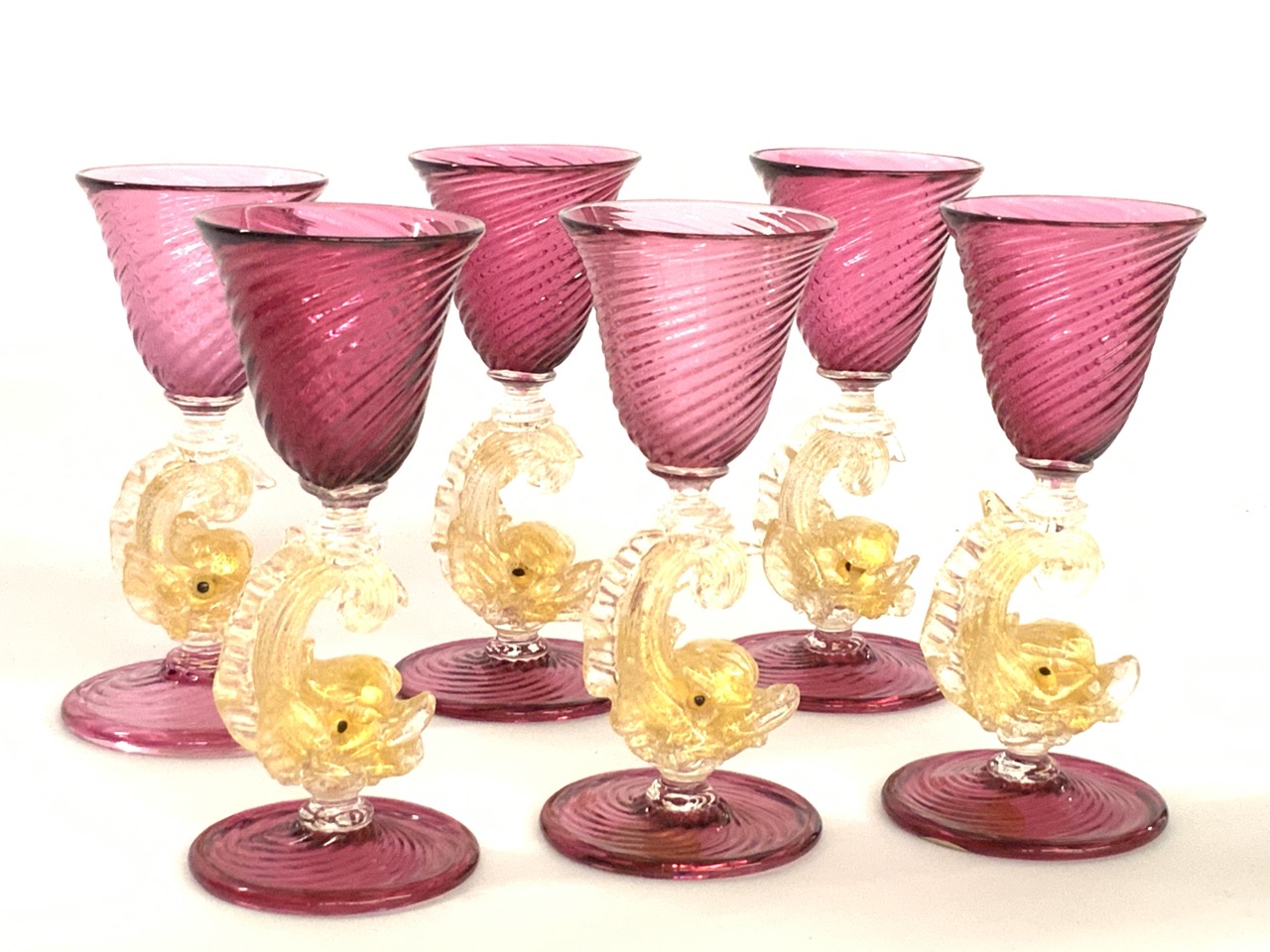 Set of six (6) Salviati Murano Dolphin Stem Dessert Wine Goblets.