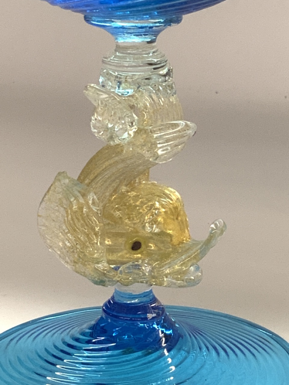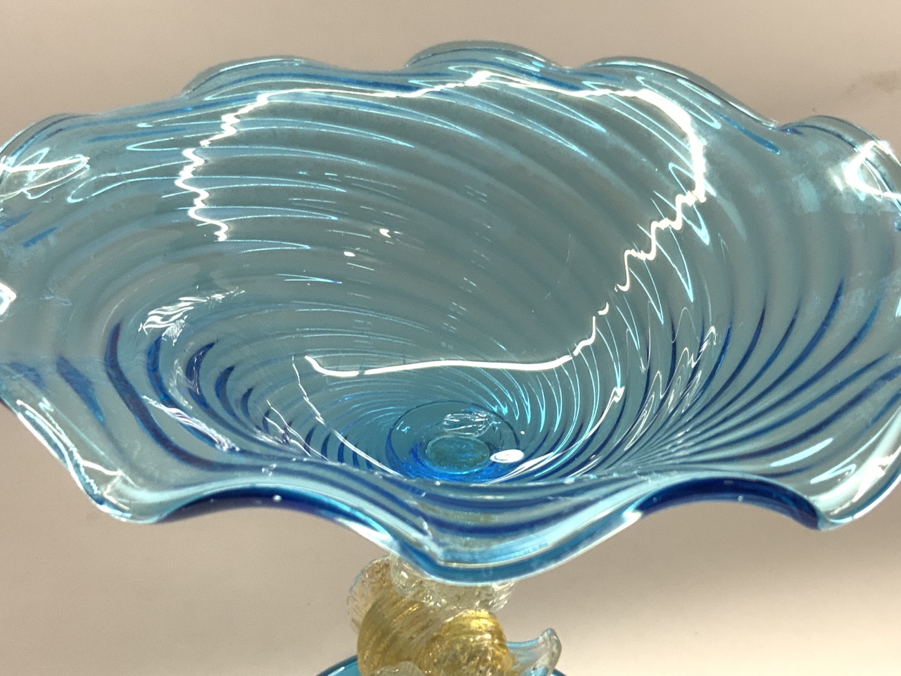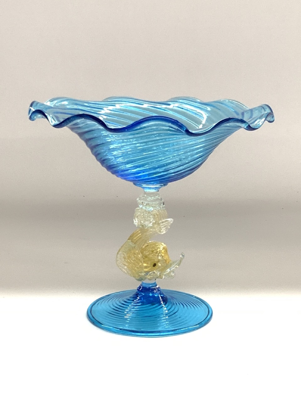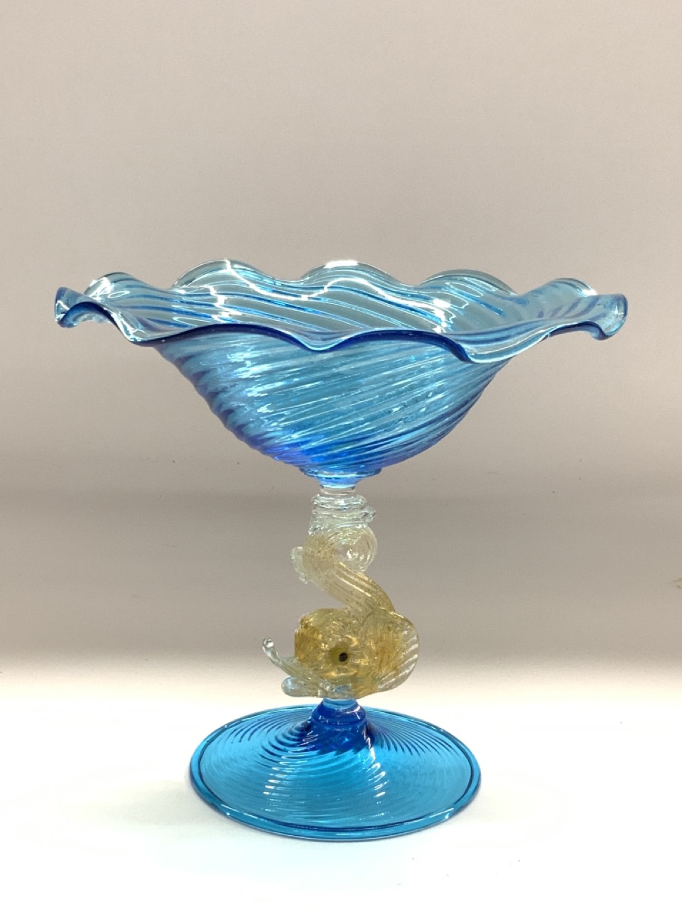 Blue Salviati Venetian Glass Dolphin Stem Pedestal Bowl.