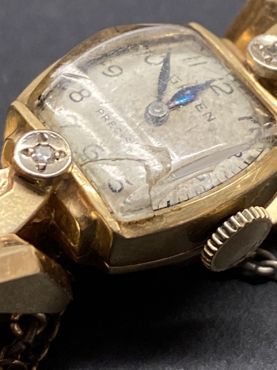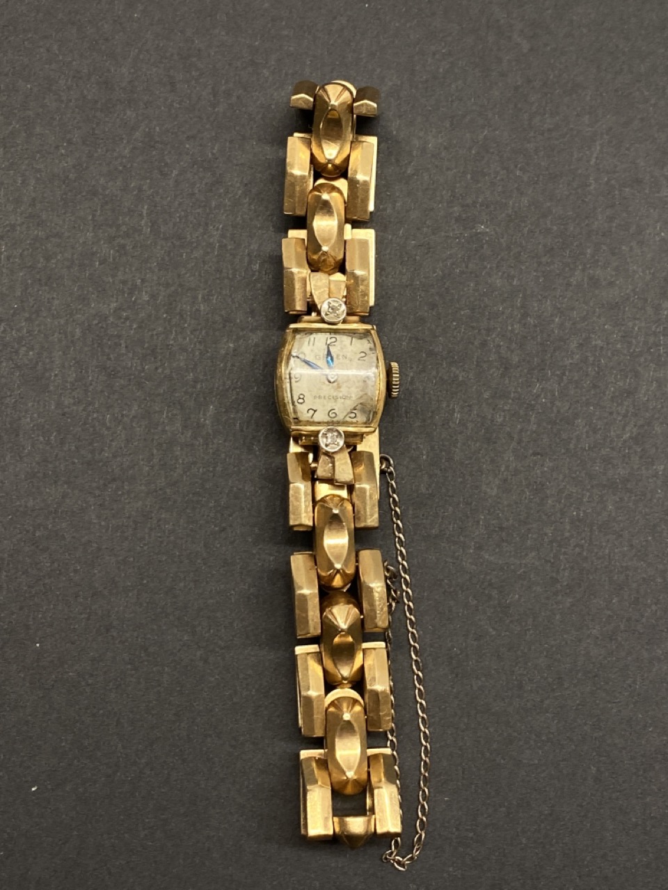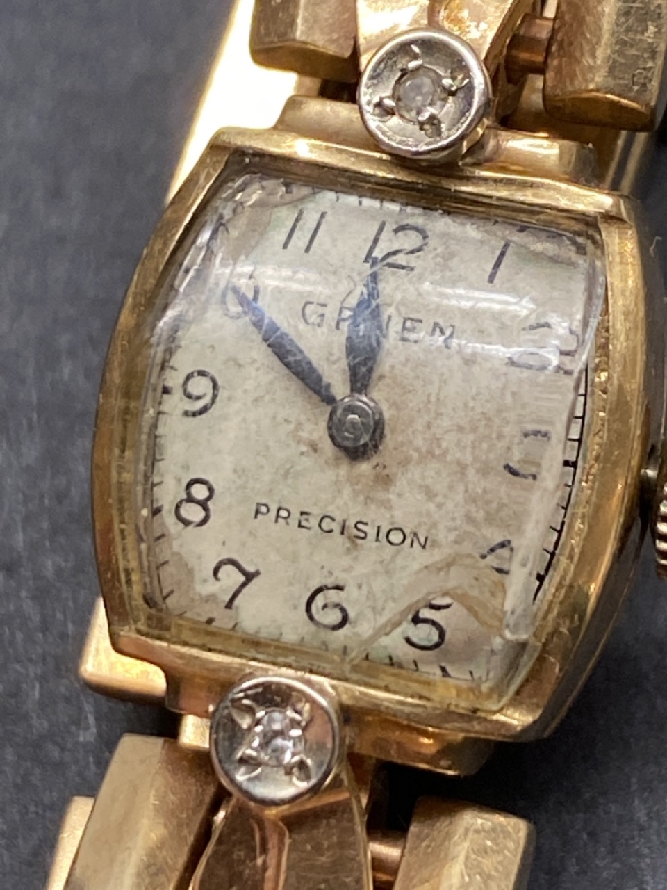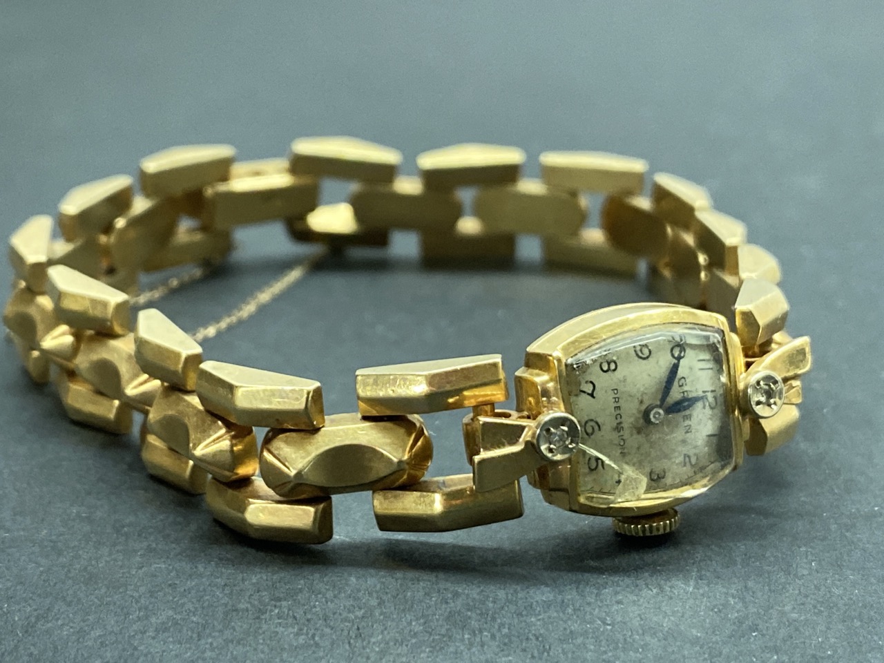 14K Gold Gruen Lady's Wristwatch. Both housing and band is 14k gold.