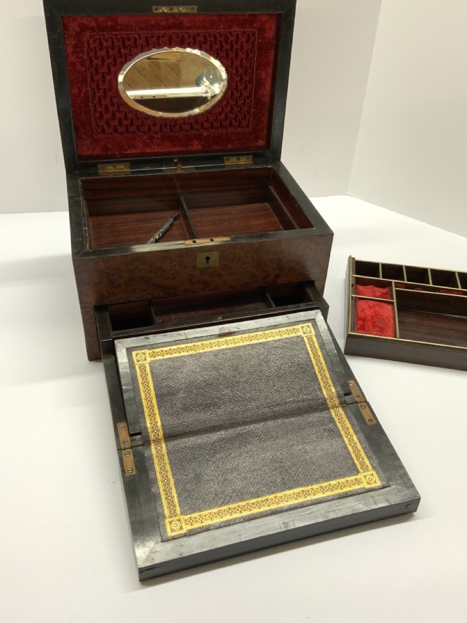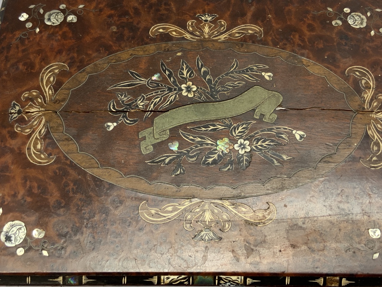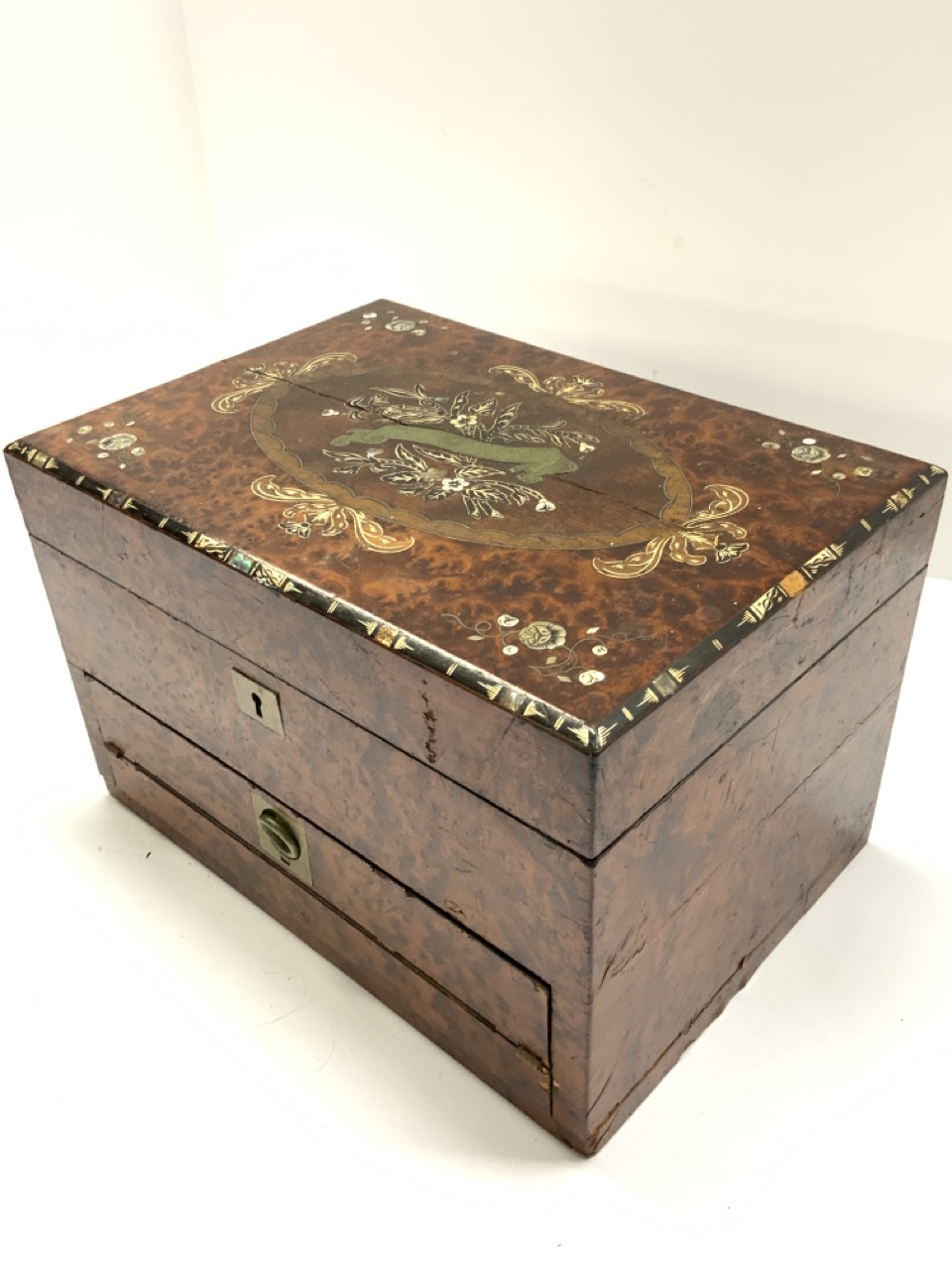 An antique English burlwood veneered jewelry box. 19th century with bone and mother of pearl inlay. An inset brass name plate centered at top never inscribed or monogrammed. Opens up to a padded top drawer with mirror. Bottom pops open when unsuspecting button is pressed on the inner backside. Some veneer loss as seen in photograph preview. Overall very good.
