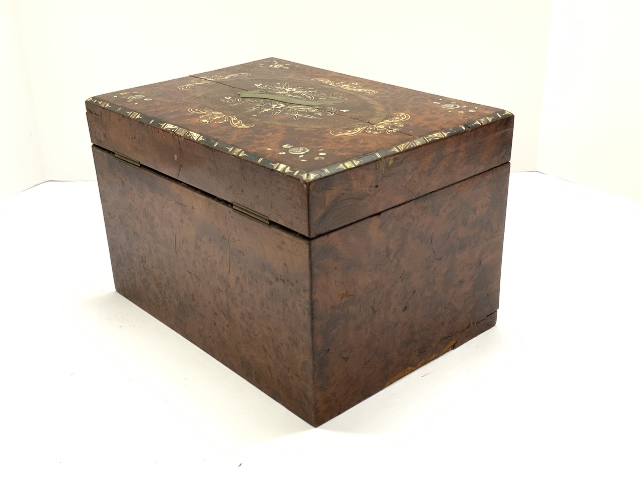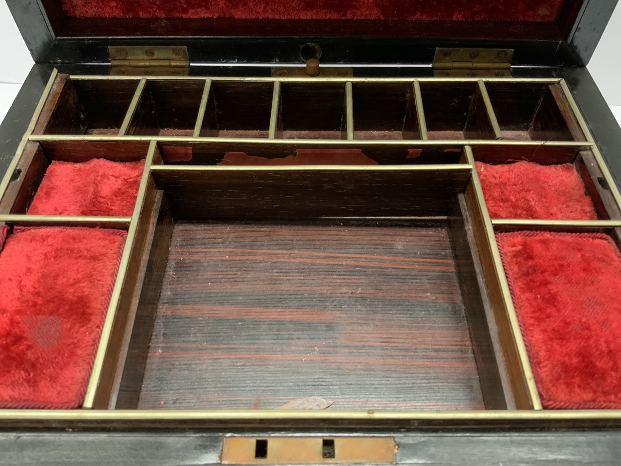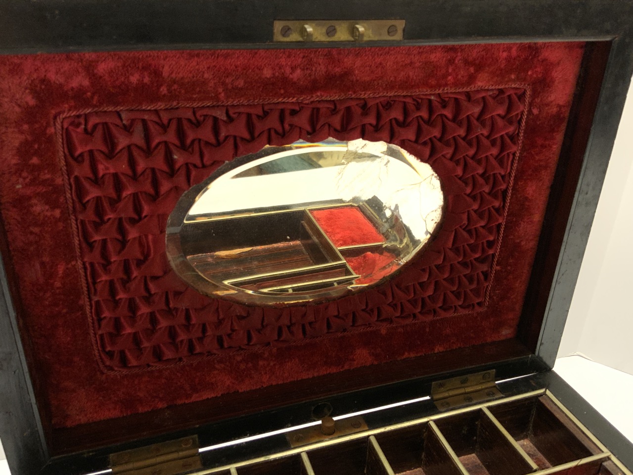 An antique English burlwood veneered jewelry box. 19th century with bone and mother of pearl inlay. An inset brass name plate centered at top never inscribed or monogrammed. Opens up to a padded top drawer with mirror. Bottom pops open when unsuspecting button is pressed on the inner backside. Some veneer loss as seen in photograph preview. Overall very good.