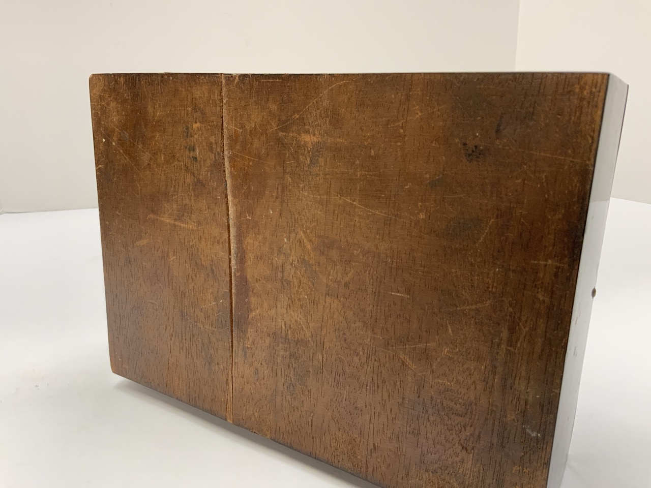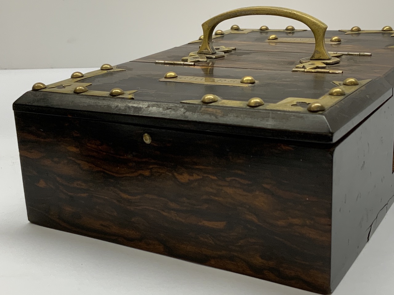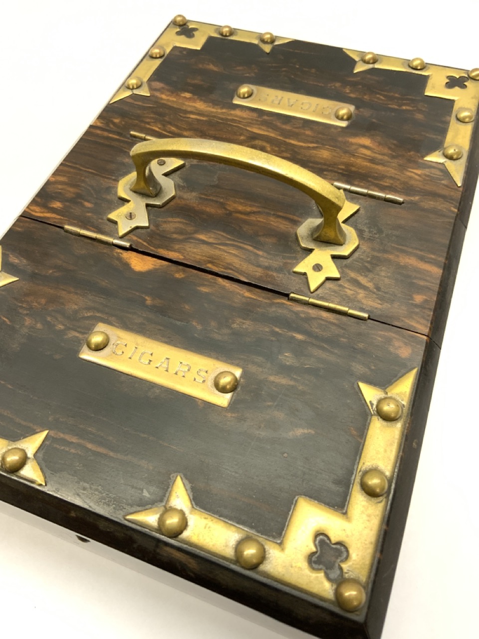 An antique exotic wood cigar humidor box. Probably English with fine brass hardware. One match box drawer slides open with strikers on each side. Back end mirrored type drawer is missing.